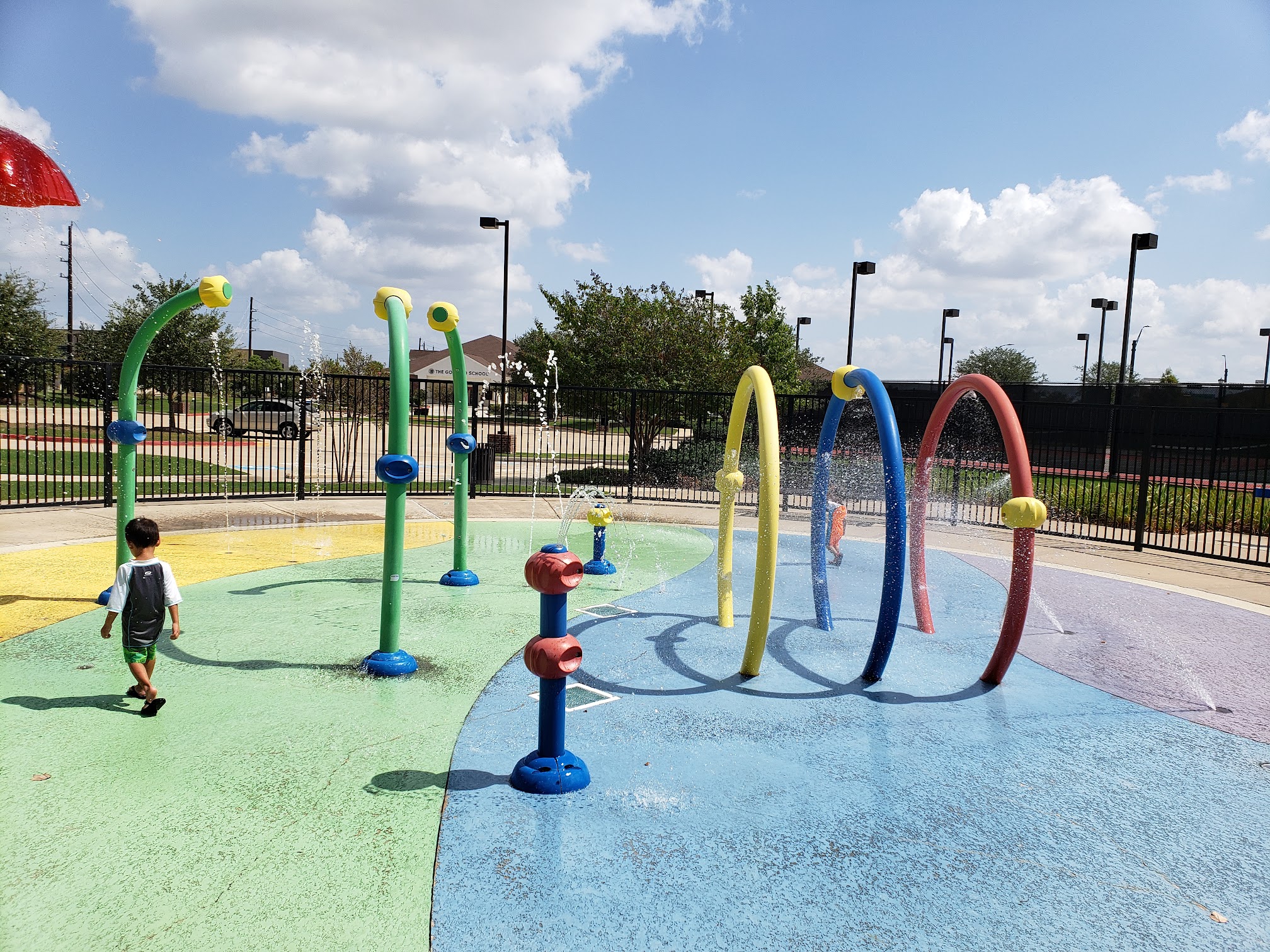 Absolute beautiful splash pad, pool, water slides, picnic area, and slides! Any Cinco Ranch resident can come enjoy this park with their pass! There's a black button on the ground you need to tap to turn on the water at the splash pad by the round red water beam.