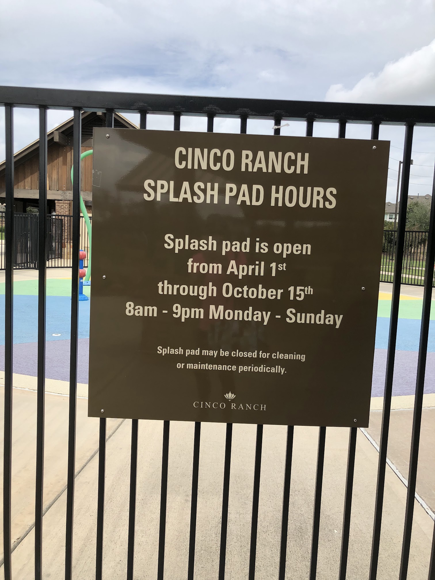 What are people saying (AI review summary)? The park offers beautiful amenities including a splash pad, pool, water slides, picnic area, and slides, noted for being clean and family-oriented. Access is granted to Cinco Ranch residents with a pass, and a specific black button activates the splash pad. However, a significant point of frustration is that the splash pad does not operate daily as implied, leading to inconsistency. There's also a wish for the pool to open earlier.