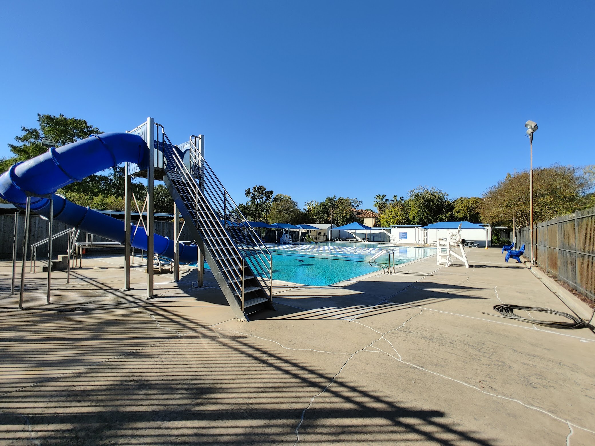Park with a playground, picnic tables, and swimming pool, plus a restroom.