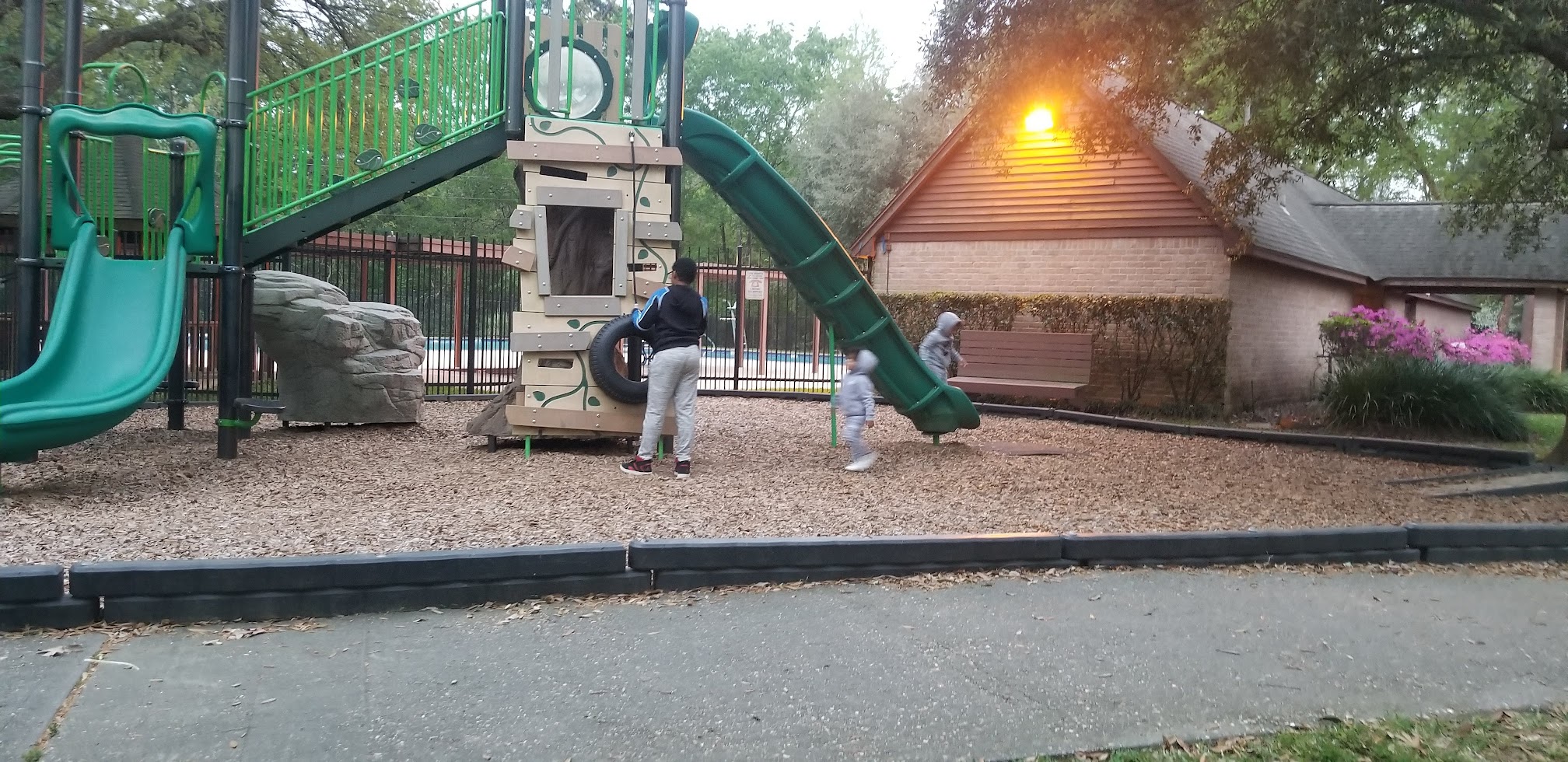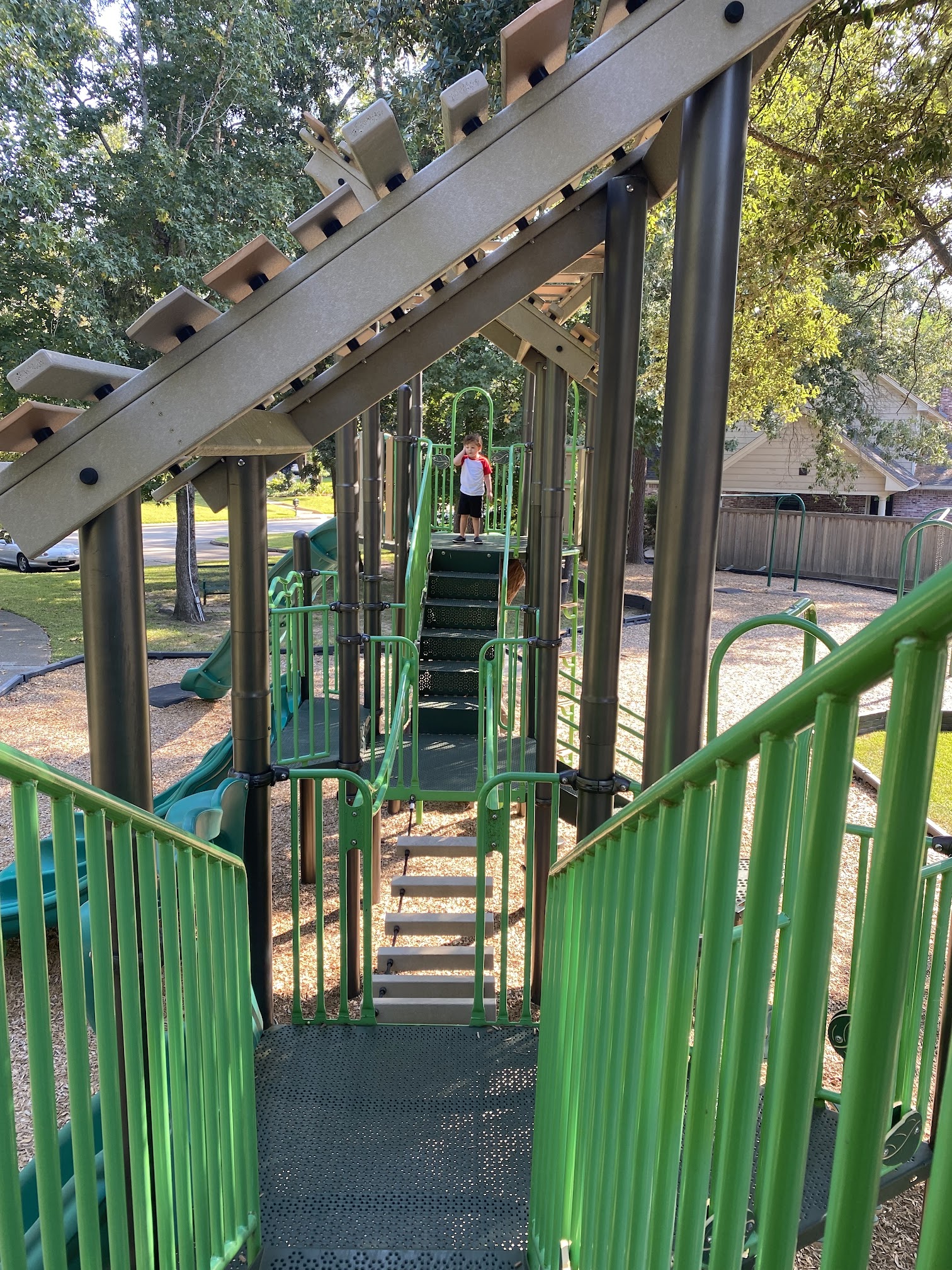 Relatively new playground. It is for older children not toddlers unless toddlers are always accompanied by an adult. Maintenance is not regularly performed, and we've found several loose bolts over the years on rope ladders and other equipment. Always well landscaped.