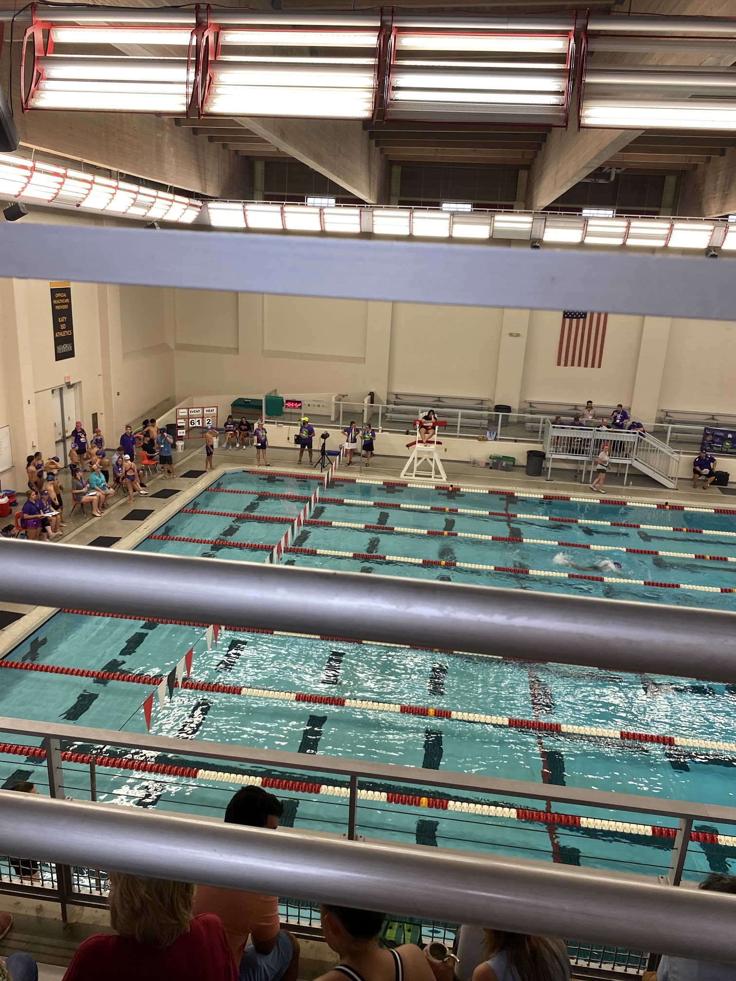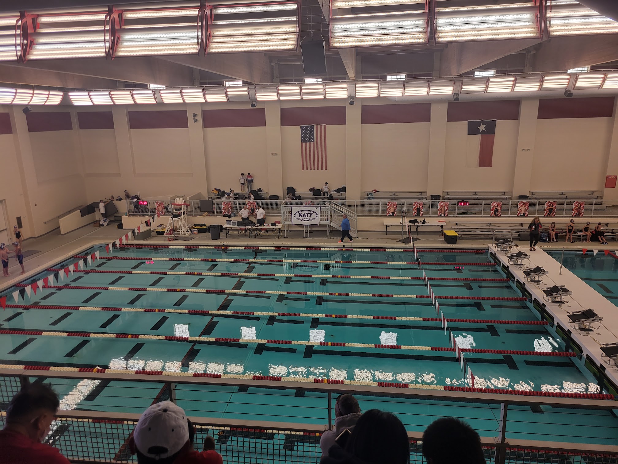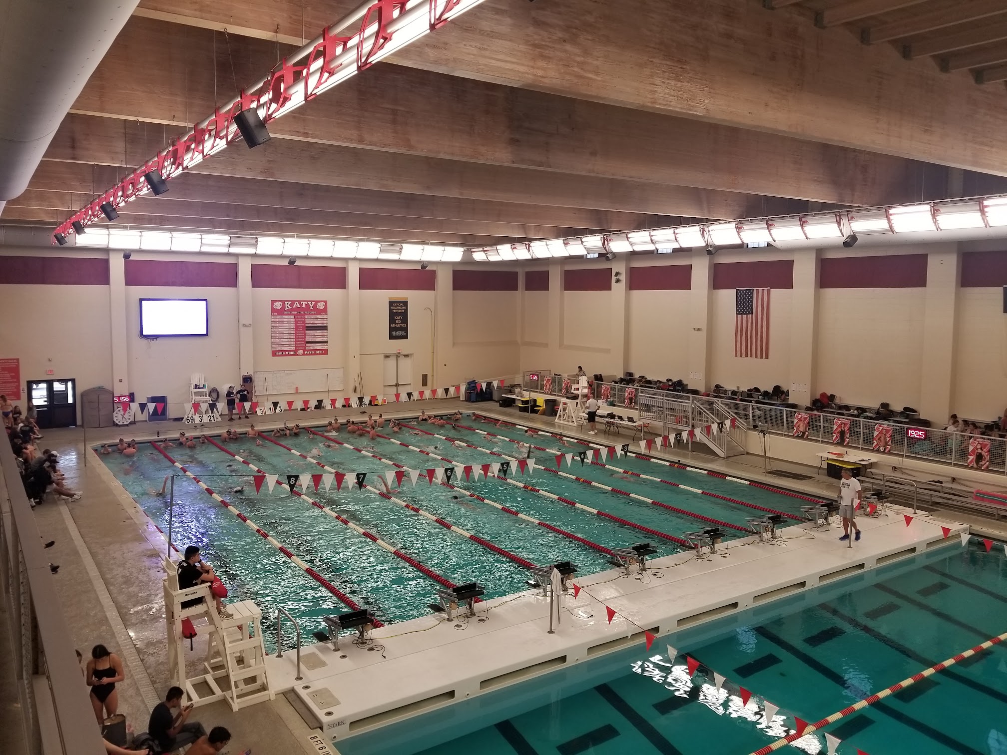 The main competition pool at the Katy High School Natatorium is typically maintained at temperatures ideal for competitive swimming, generally ranging between 78-80°F (25.5-26.7°C). Warm-up pools are often kept within a similar or slightly warmer comfort range.