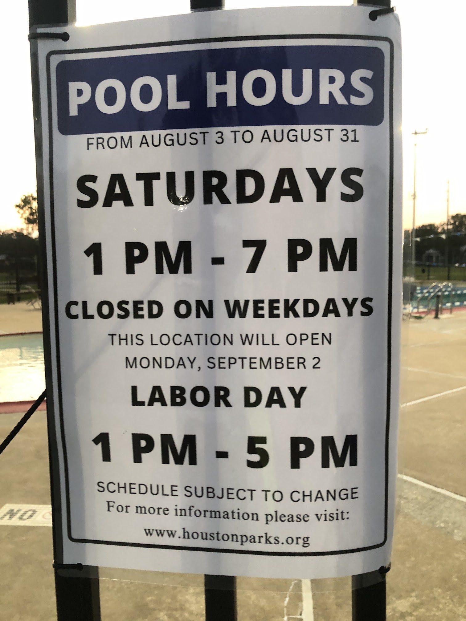 What are people saying (AI review summary)? The reviews for the pool are largely positive, highlighting a generally clean facility, great staff, and attentive lifeguards, leading to an enjoyable experience for visitors. However, recurring suggestions for improvement include the need for more shaded areas, especially during pool breaks and entry/exit, and a request to adjust the summer operating hours (currently 1 PM - 7 PM on Tuesday, Thursday, & Saturday) to include morning and early evening slots, making it more accessible during Houston's hot climate. One review also noted a minor issue with leaves and sticks in the water, contrasting with other comments about the pool's cleanliness.