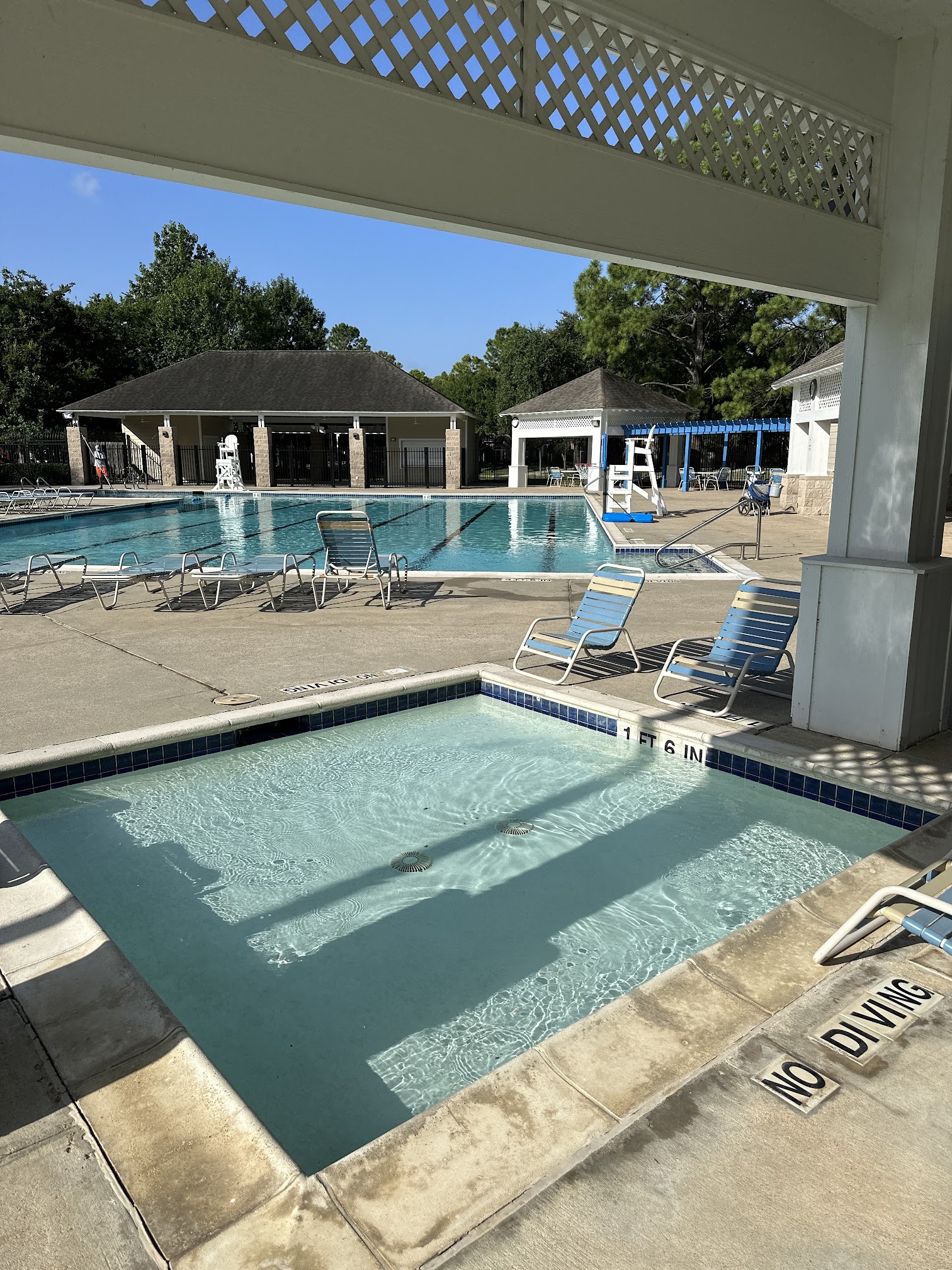 Very nice swimming pool with a large covered area. Life guards are and serious about their job.