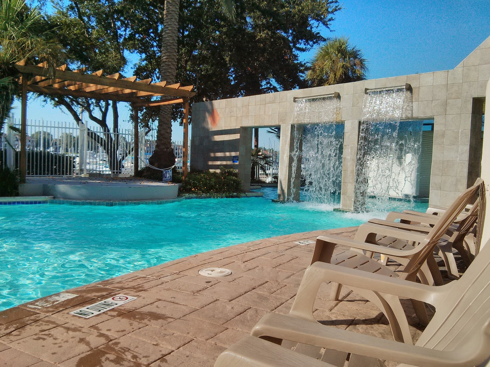 The Oasis, located at the South Shore Harbour Resort in League City, TX, is a tropical-themed pool complex. It features a large lagoon-style pool, a swim-up bar, waterfalls, and a waterslide, providing a relaxing and entertaining escape for guests with cabana rentals and a vibrant atmosphere.