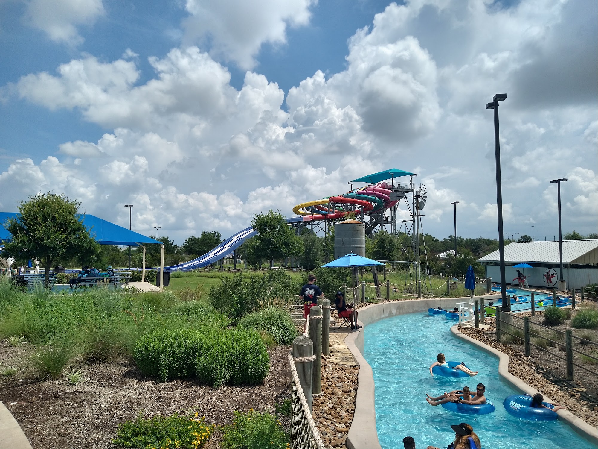 Nice waterpark next to Katy Mills mall. no food allowed. they have lots of restaurants to choose from. I like how they have cabanas everywhere in each section. Bathrooms were clean and nicely tiles. Ok lazy river..lots of ridws. 2 kiddie sections. Lines were not too long at the major rides. Loves rhe vintage vehicles spread out over the property. A good amount of floaties. Waves pool by the stage area. Lots of cool features in this watee park.