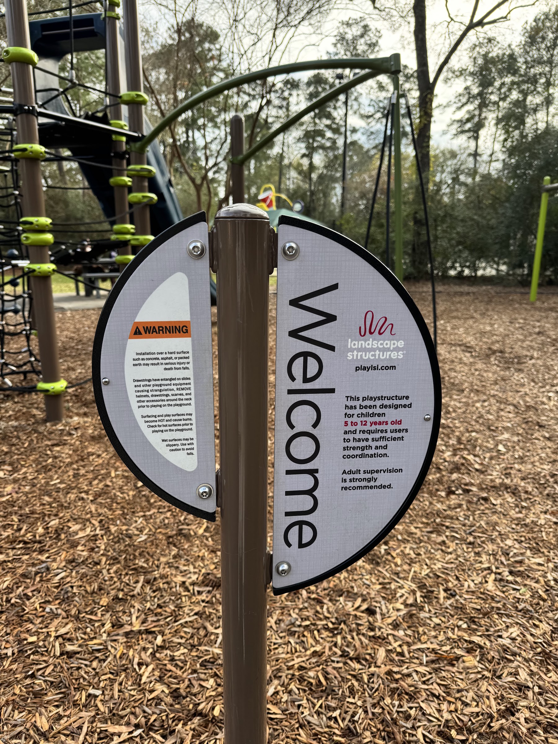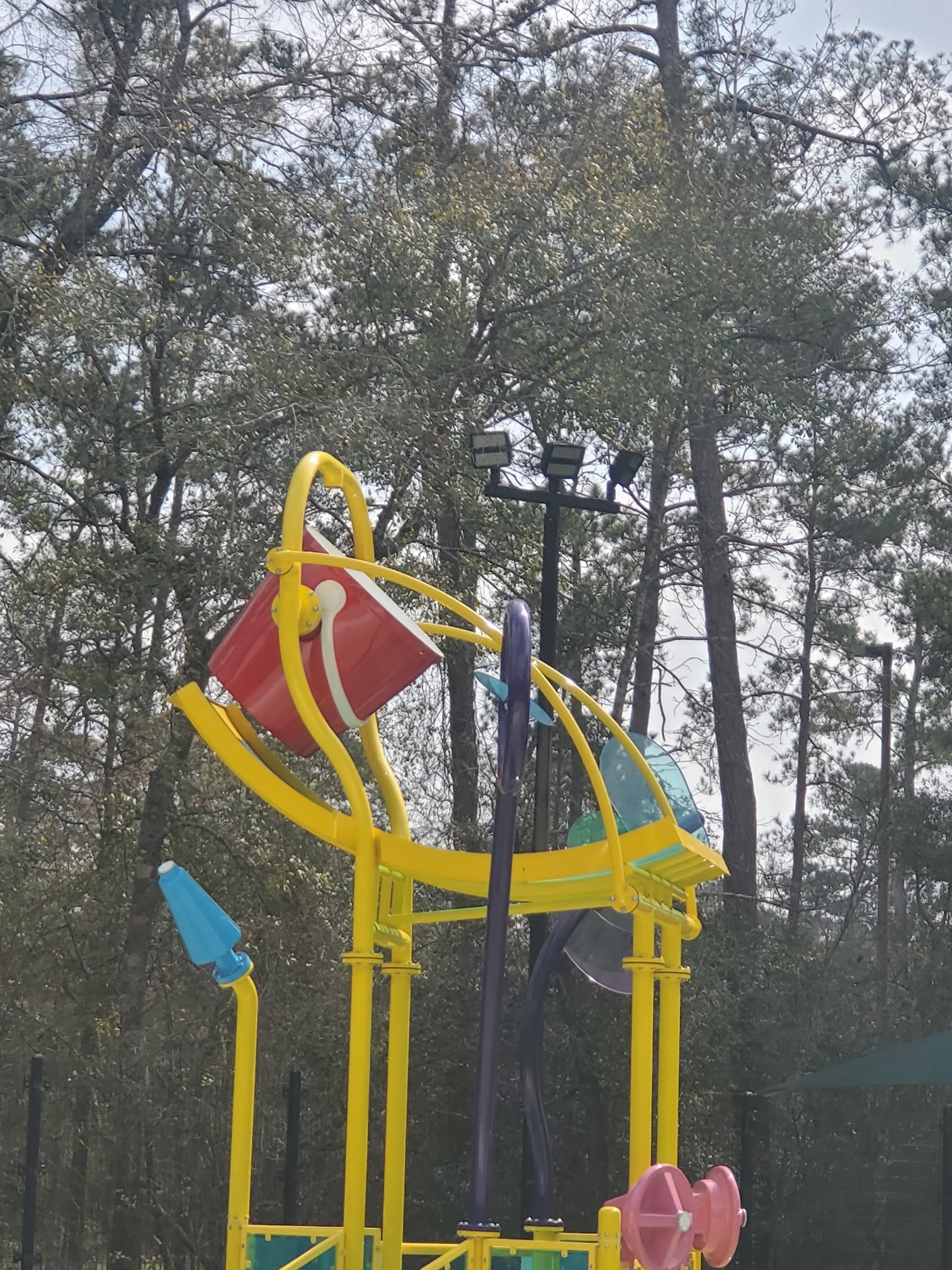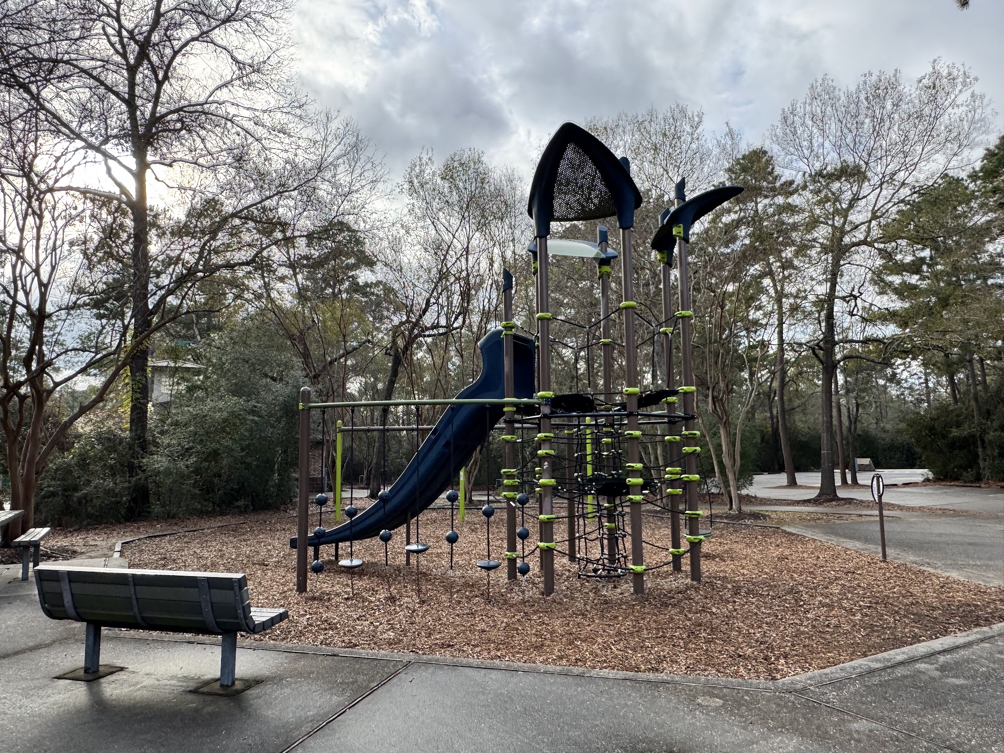 Great playgrounds with lots of fun for all ages. It has a cute little playhouse for younger kids. There is a very tall slide that is only accessible via rope net climb. My only complaint is the lack of shade on the older kids play area which causes the slide and swings to get very hot.