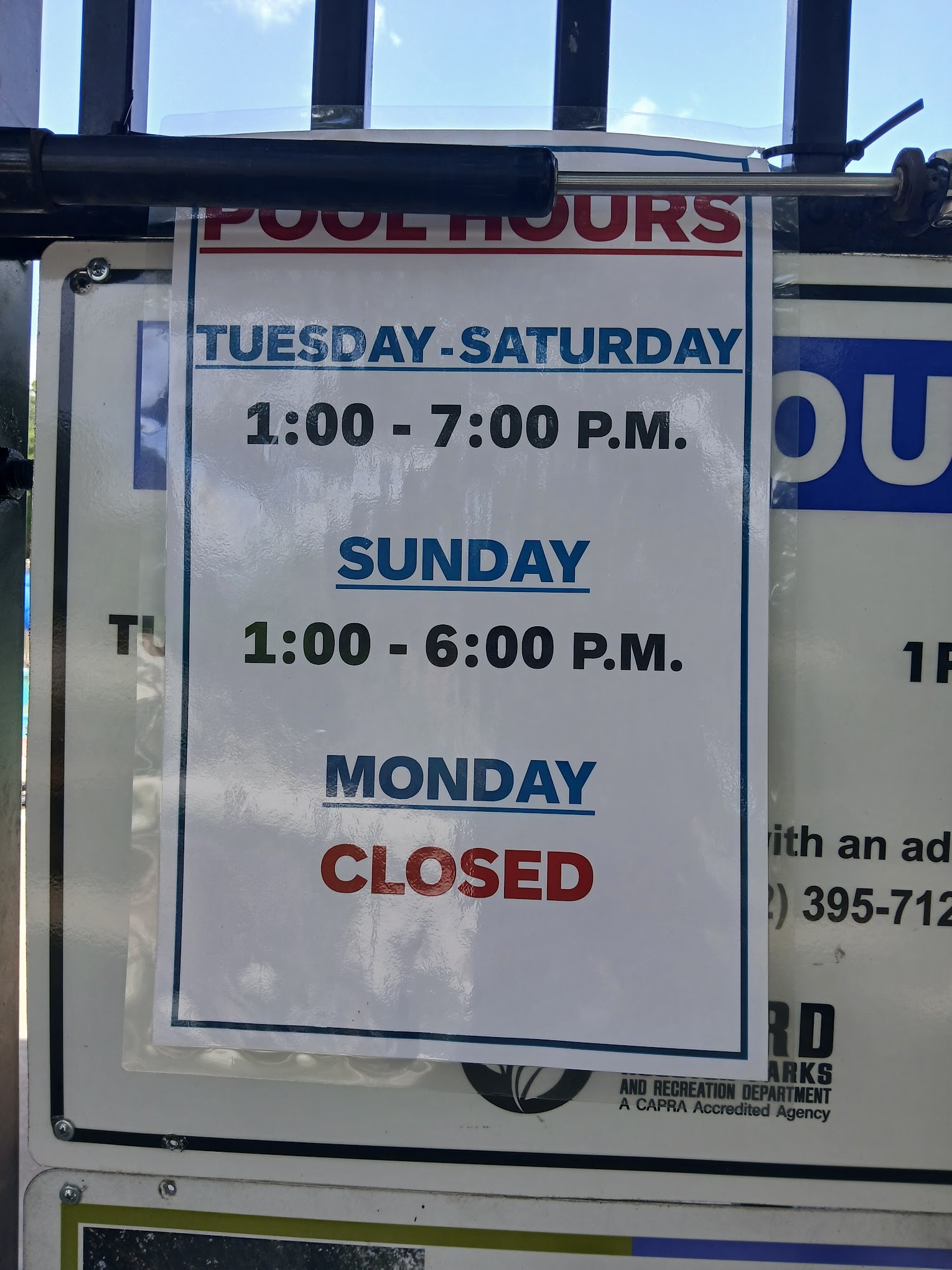 The staff seem to be collecting pay but not allowing people to swim even though they claim to be open and then @ 2:50pm, Royal told me that he is about to clock out clocking out after I questioning the employees about the misleading pool times.. Royal told me to call and ask where the nearest pool with 3 lifeguards is to swim somewhere else.. The reason why I gave this site a 2 star is #1 I came to the pool yesterday because Google Maps said the pool was open, according to the online schedule, which is different from the schedule at the pool on the door.. The pool was closed.. I came back today.. #2 When I went to the location, the staff told me that the pool area could not be occupied until there were 3 lifeguards on-site.. So the pool is technically closed.. #3 After I left, I called an hour later @ 2pm to see if there was a 3rd lifeguard at the location, and the staff told me that there was not a 3rd lifeguard on-site because there is nobody at the pool.. I told the staff that I had just left the pool and spoke to staff in person an hour ago, and I am waiting for the 3rd lifeguard so I could go swimming.. She asked me to call back in an hour or half an hour.. I believe a good solution to this issue is to trust the managing staff at the pool site with maintaining the Google Maps schedule so that they can provide accurate times for better transparency for customers, please..