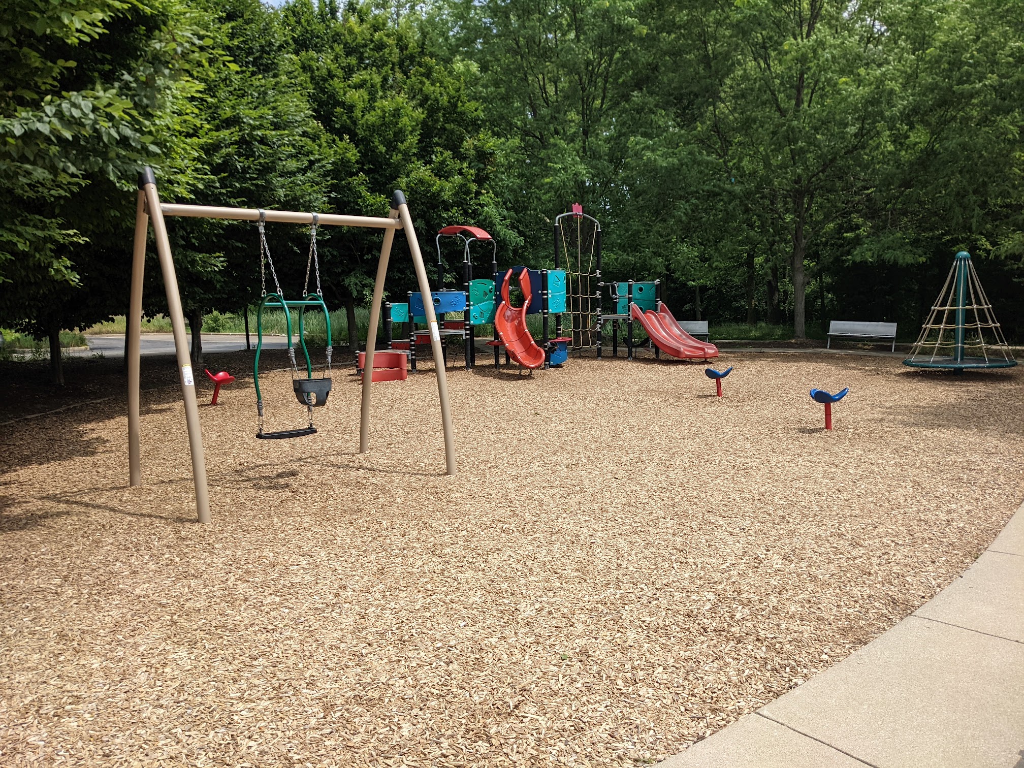 Cool park with splash pad, covered picnic area, playground, open grass/fields and a Frisbee golf course nearby too. Only complaint is the mulch