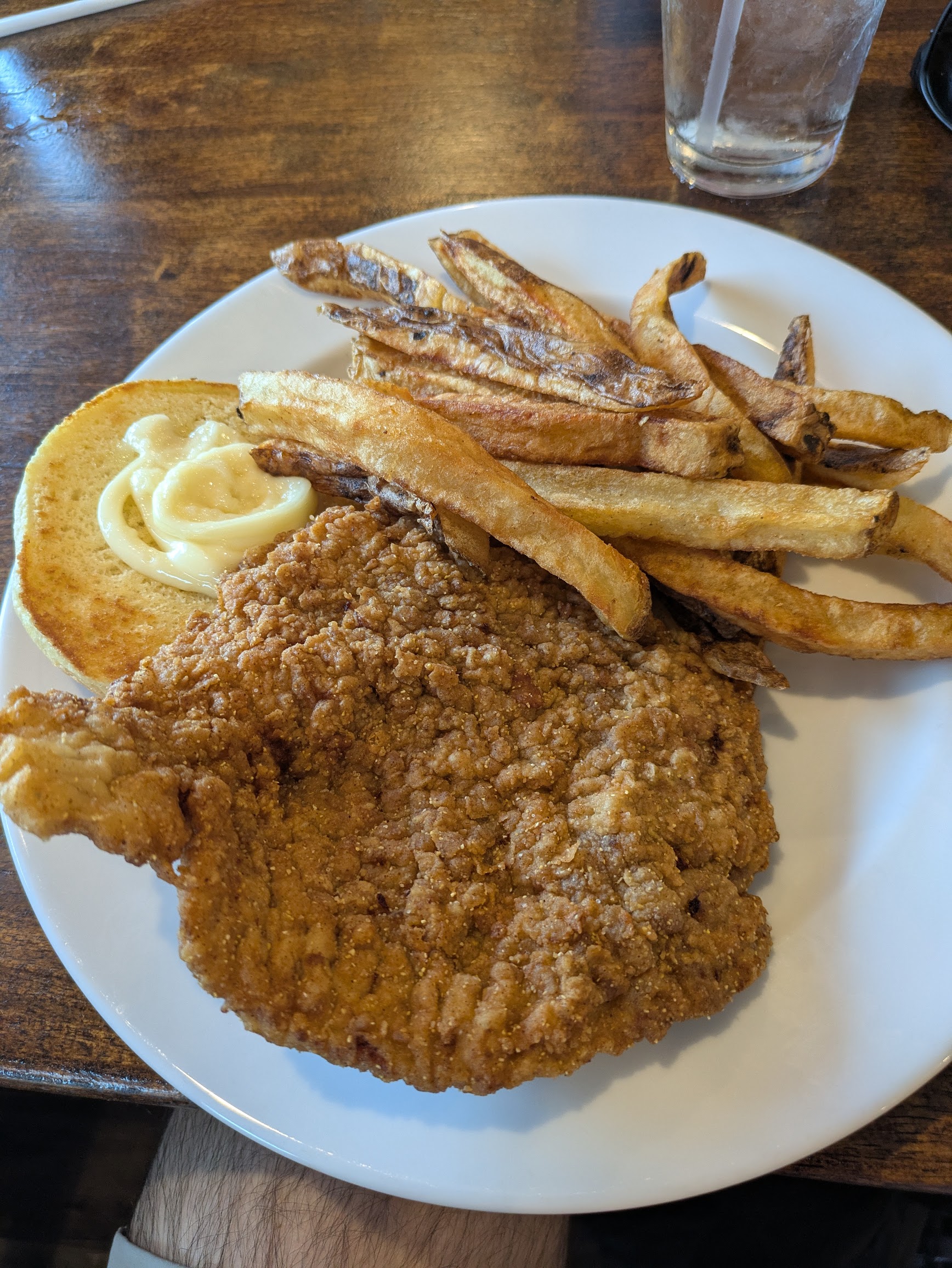 tried the $13 grilled and breaded tenderloins at the edge in Anderson tonight. very disappointing for the most expensive tenderloin in Anderson. they were thick like I like them but they didn't trim the fat or the gristle some bits were just inedible. the grilled tenderloin tasted like beef, so somebody didn't clean off the grill before they cooked it. the lettuce was wilted so we didn't eat that the tomatoes were way past their prime and disintegrated so we scraped those off. the bun fell apart. they got our order wrong. we ordered lettuce and tomato on both and got lettuce and tomato and onions on one and lettuce and onions on the other. the onion rings would have been good if they've been crispy. french fries no seasoning but that's fine we added a little salt and they were pretty good. everything stuck in styrofoam rather than something compostable. if you want a good golf course tenderloin then it's the 1925 pub house not Edgewood.