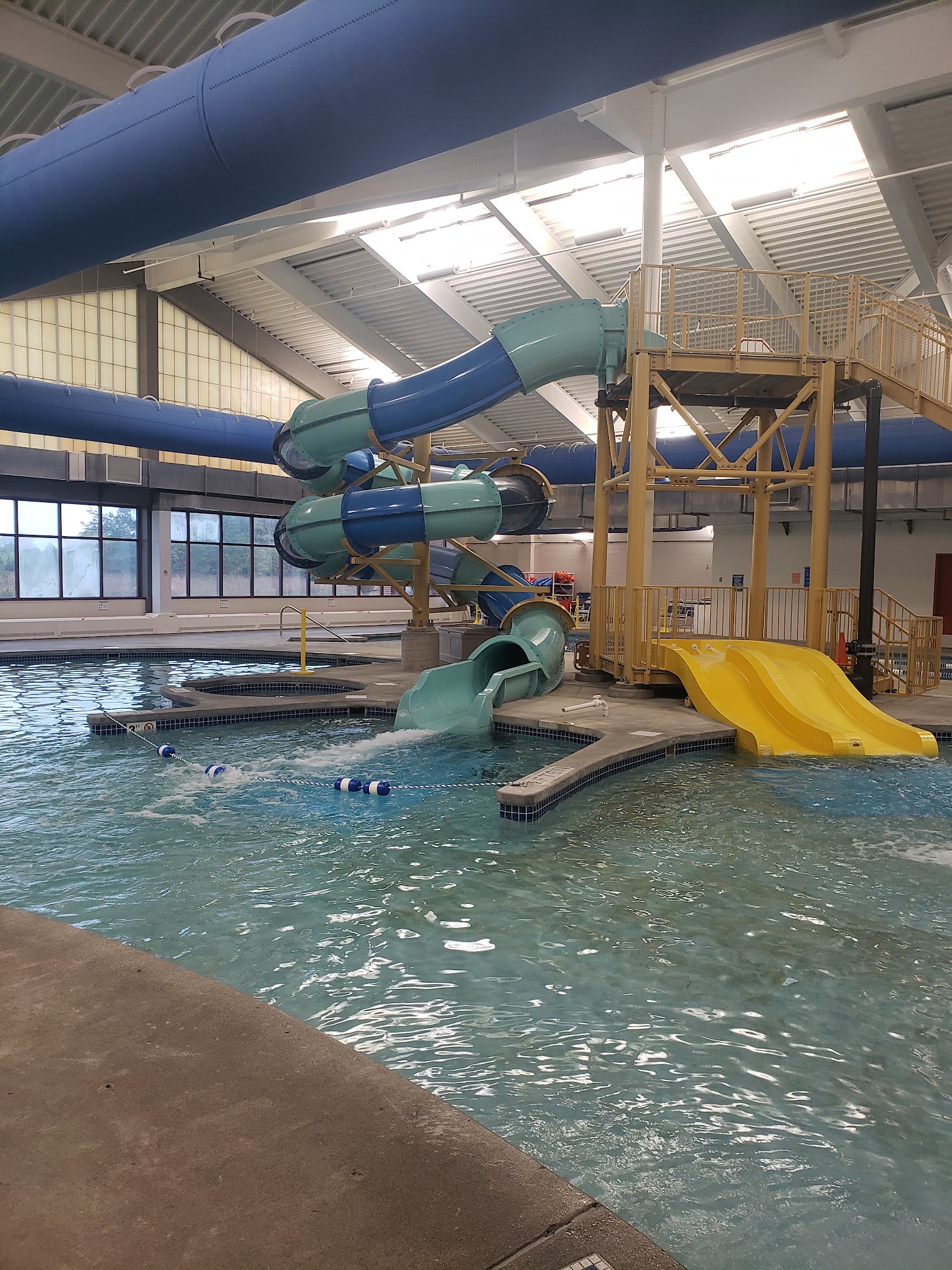 Clean indoor family-friendly swimming pool featuring warm water, water slides and a hot tub.