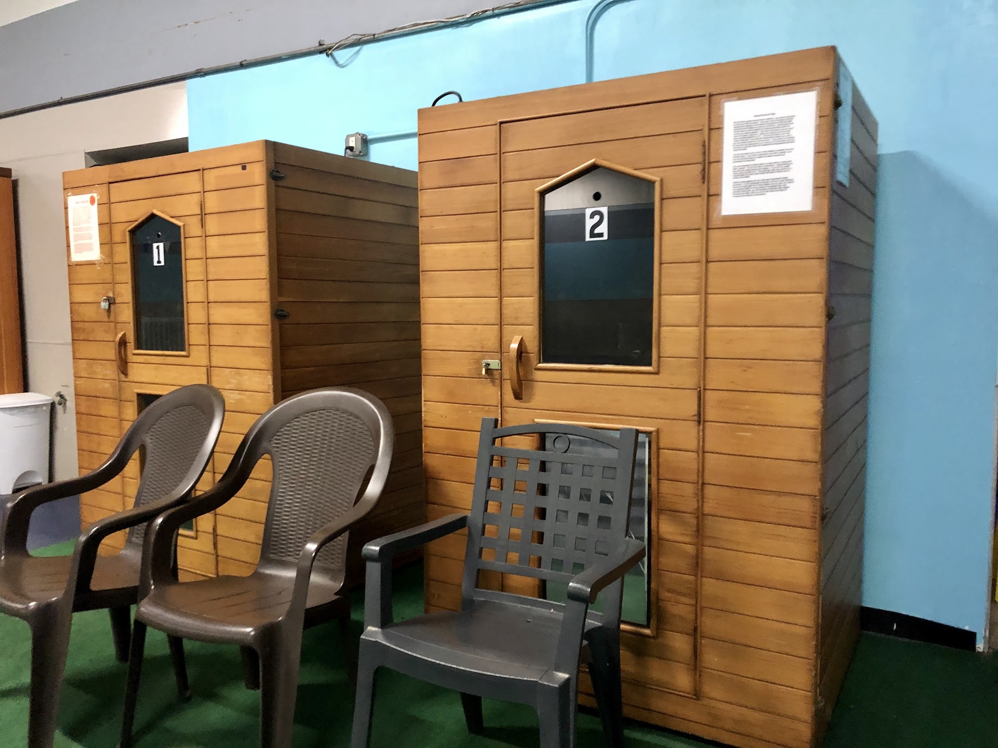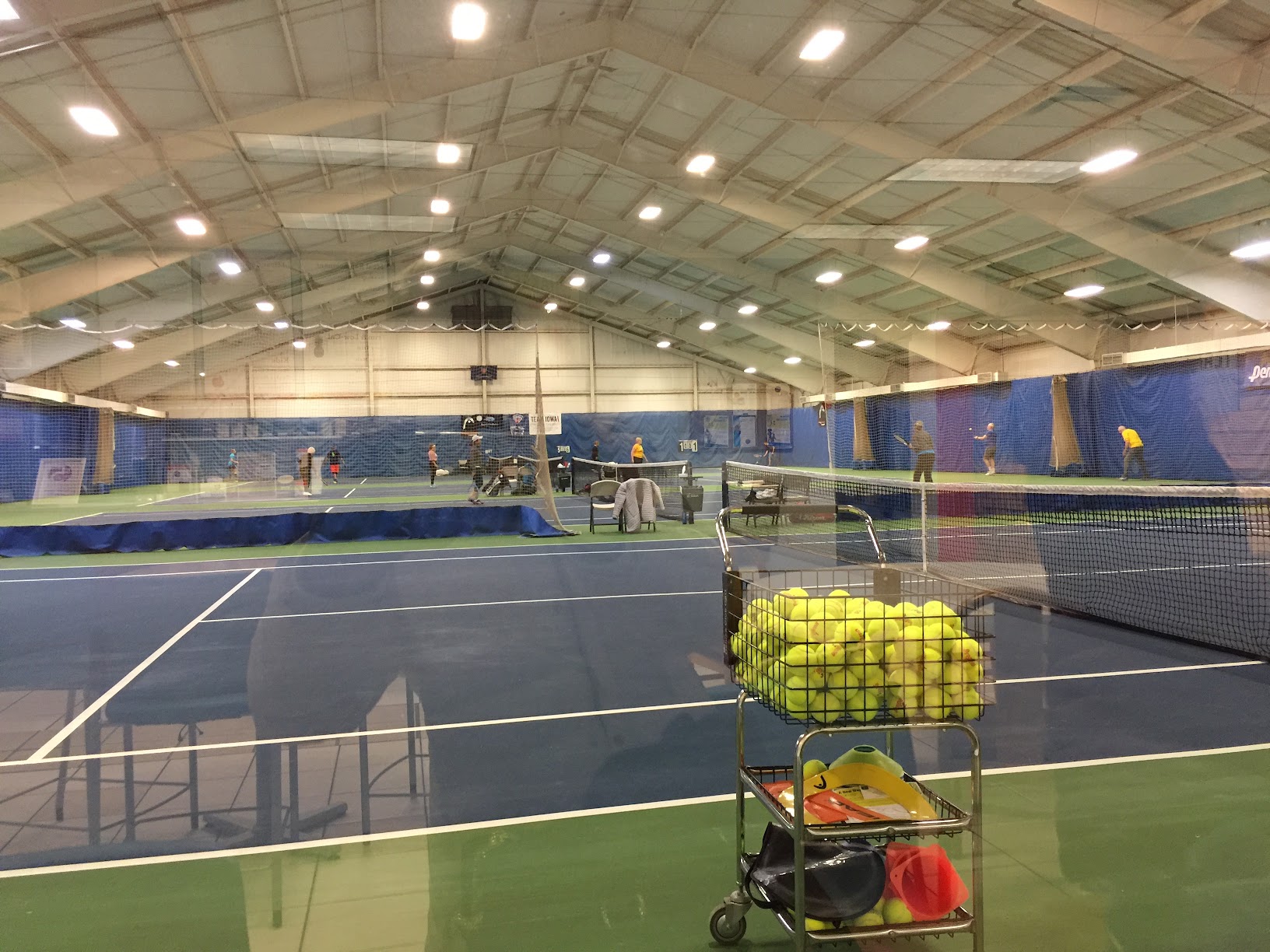 Relaxed gym featuring indoor tennis courts, weight training and a pool.