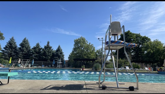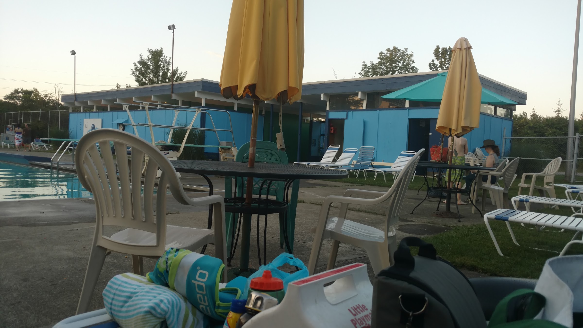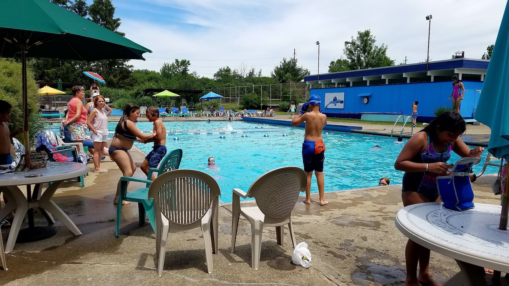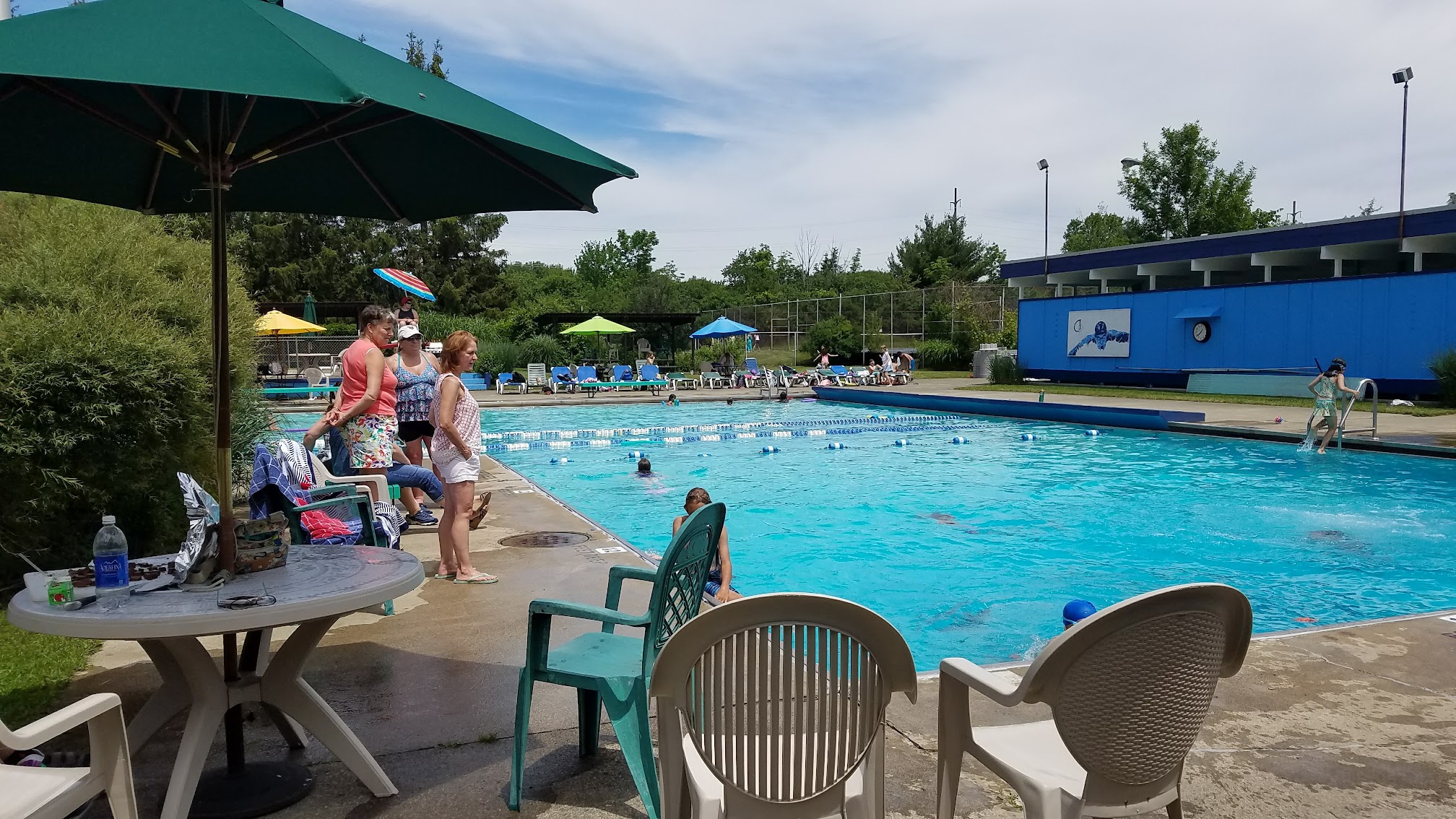 Nice, relaxing place to spend the summer days. Uncrowded pool is heated, so it's still pleasant when the days are cooler, but not too warm for lap swimming. There are always several lanes set up for lap swimmers, and a large shallow end (3'-4') and a deep end with a diving board. Tables and lounge chairs are spread all around, and there is even an area that get shaded by trees in the afternoon if you want to watch your kids without baking too much in the summer sun.