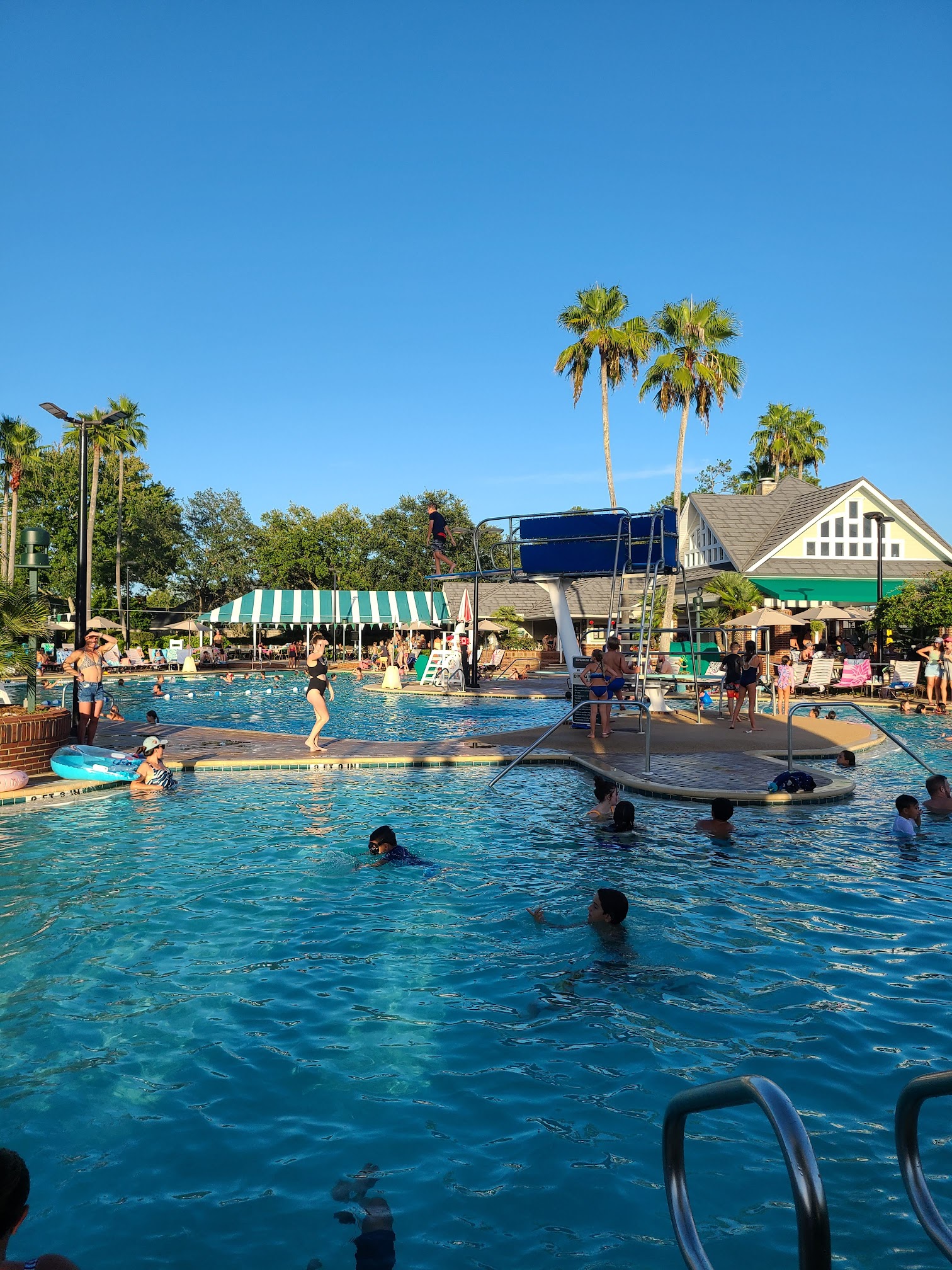Great family pool with a large slide, beach volleyball court, playground, kiddie pool, and 1m and 3m diving boards. Lifeguards are attentive and caring, concessions are reasonably priced and fun events periodically