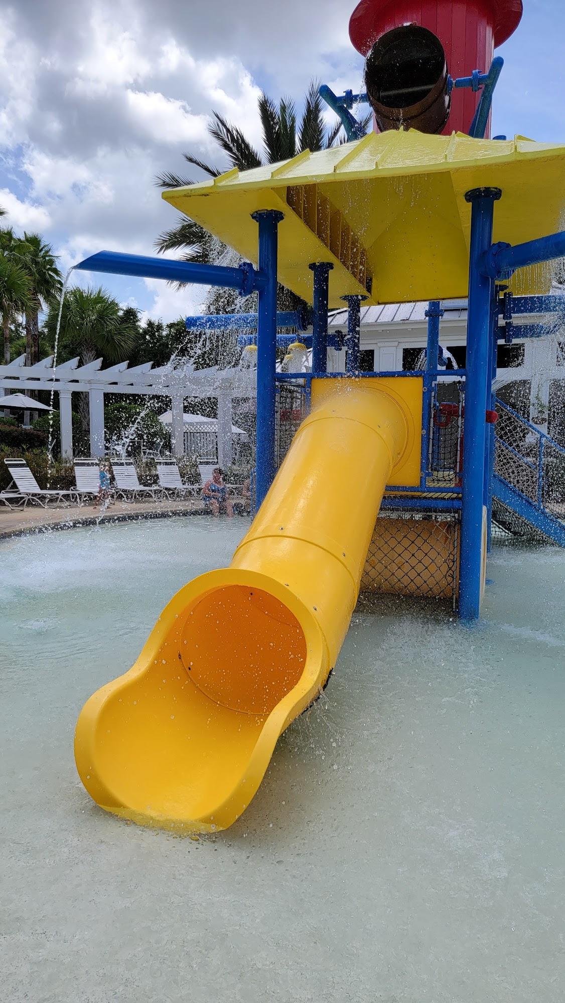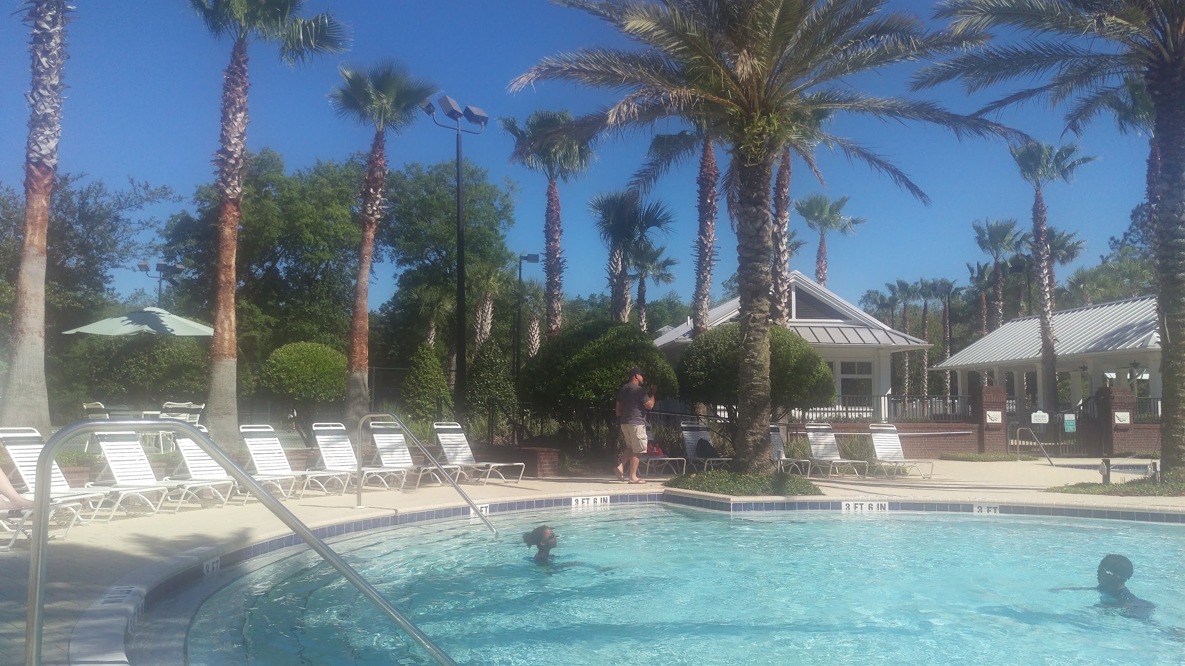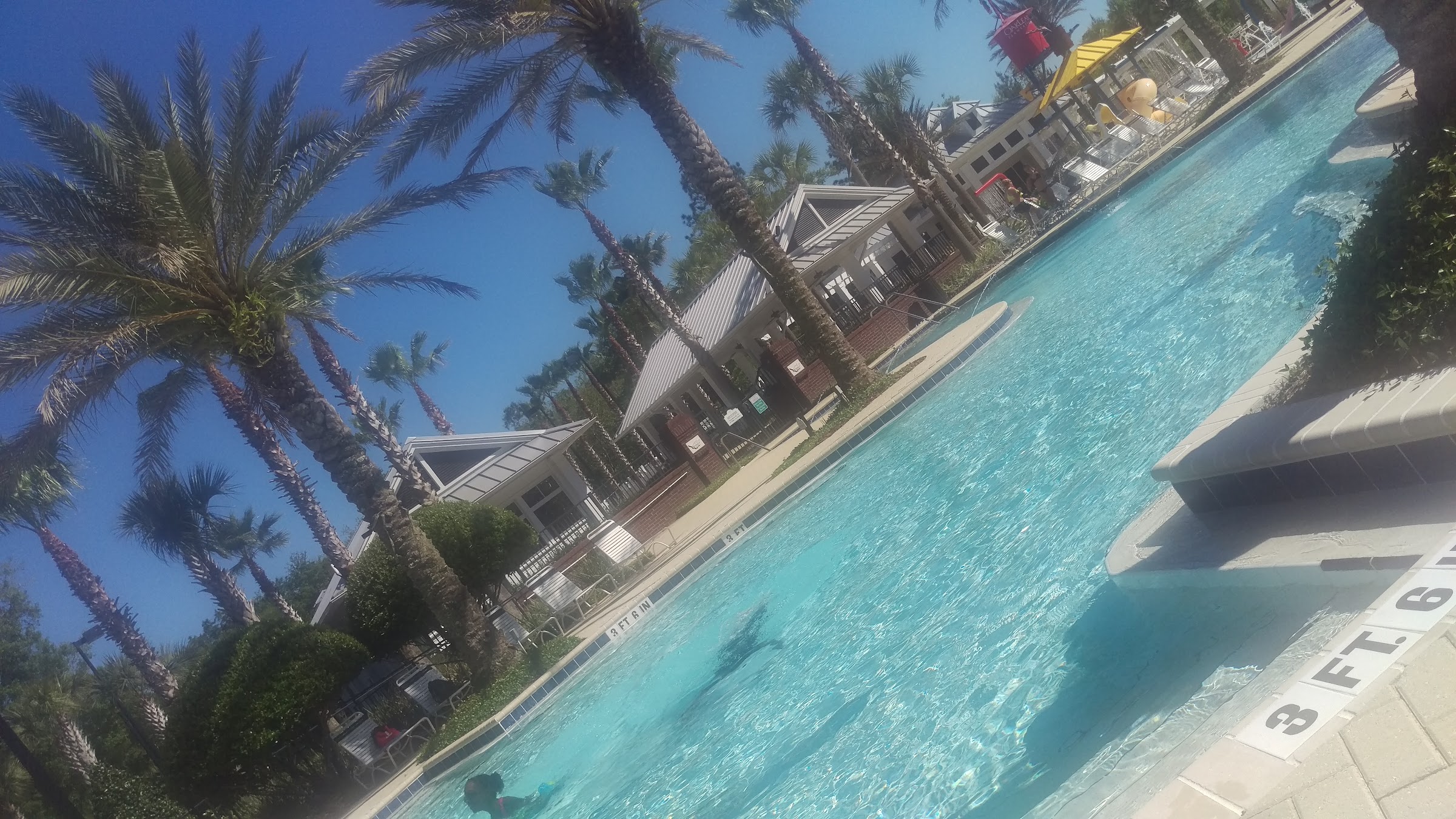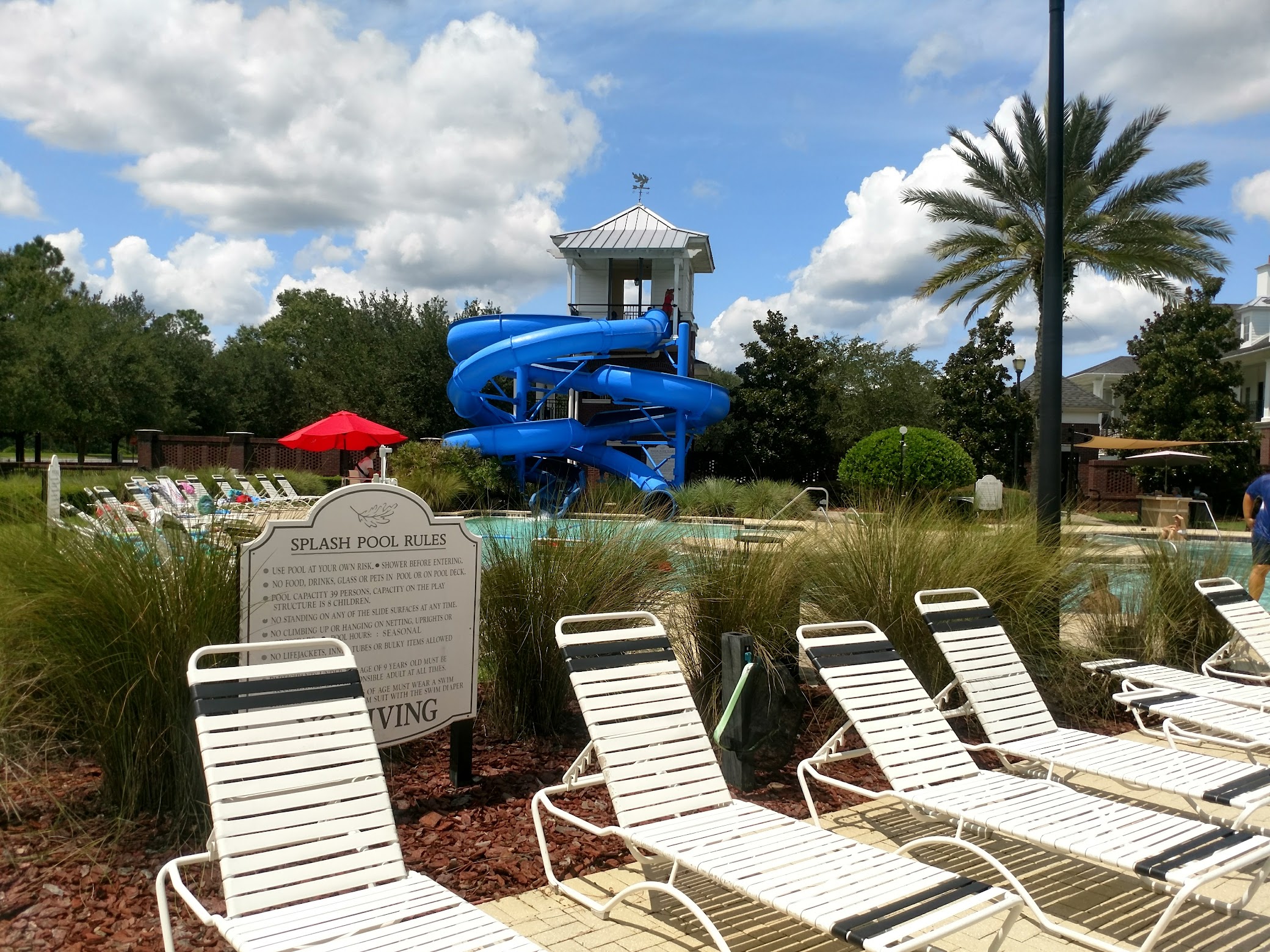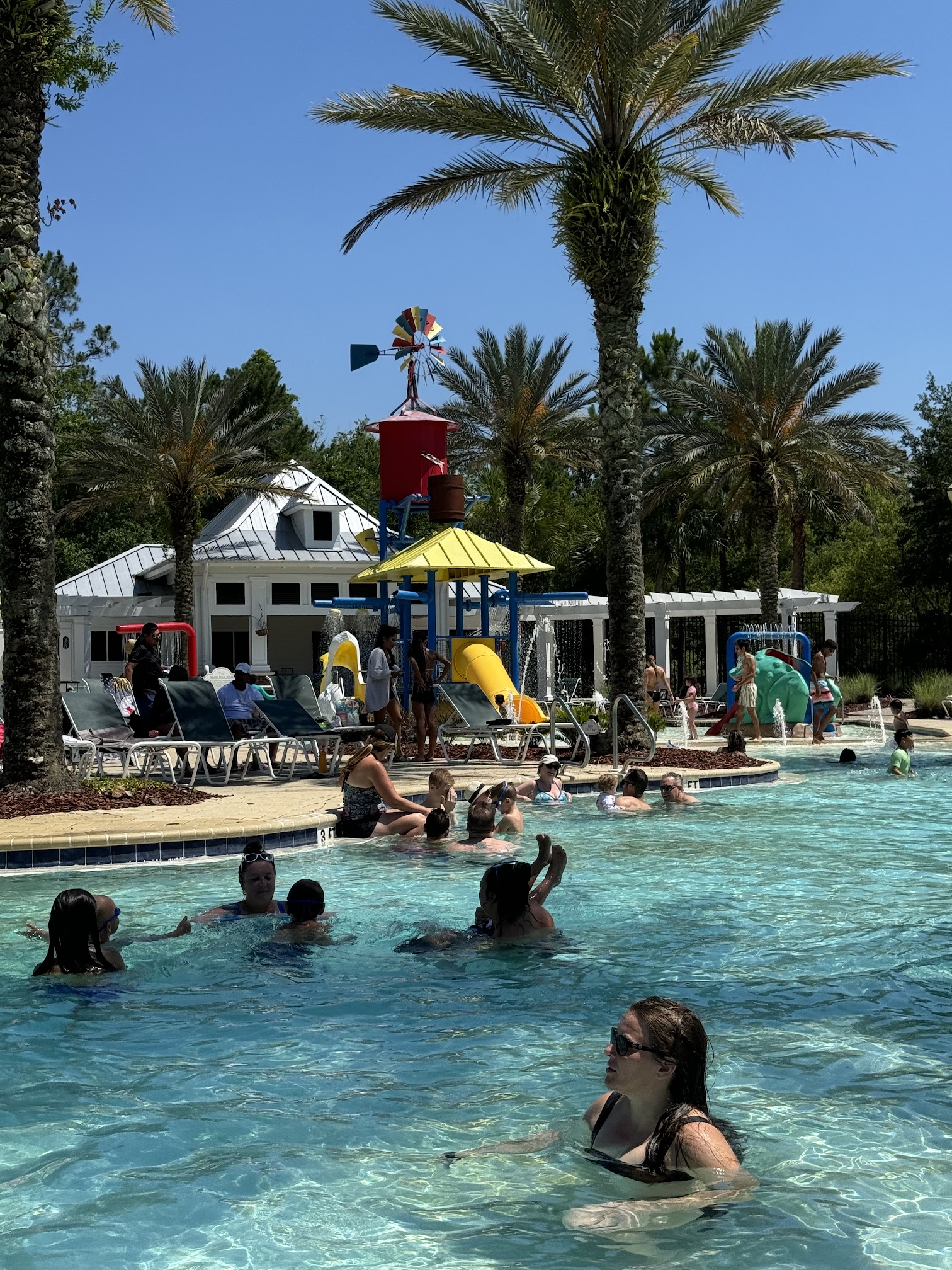 The pool is large and allows for 189 people in it at one time. The deepest part is 4’6” but the majority is around 3’-3’6”. There is plenty of sunny areas and a few shaded areas. They have bathrooms for men and women. There is a lap pool for 18 years and older. There are tables where you can sit, snack, eat, sip, etc. There are 2 large slides and they are adventurous enough for most but not like a major water park. There is also a splash pad/pool area for little children with sprinklers, water buckets, and a shallow pool.