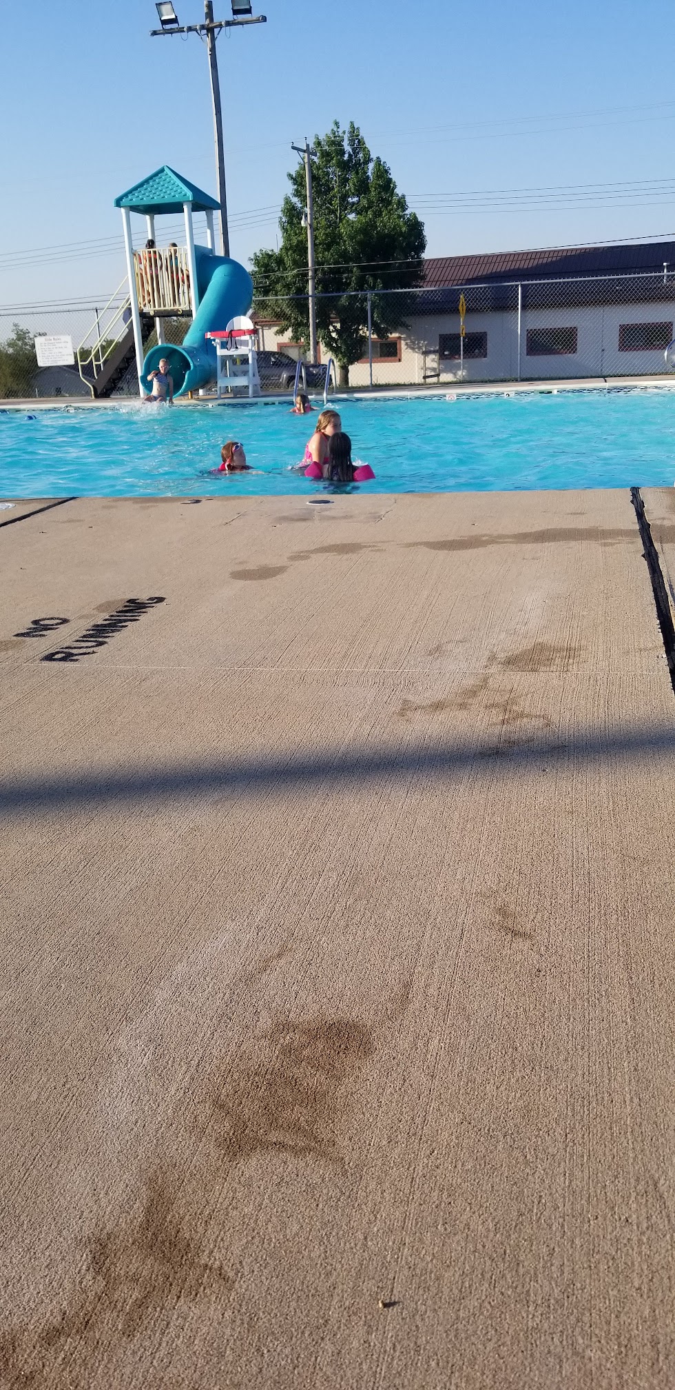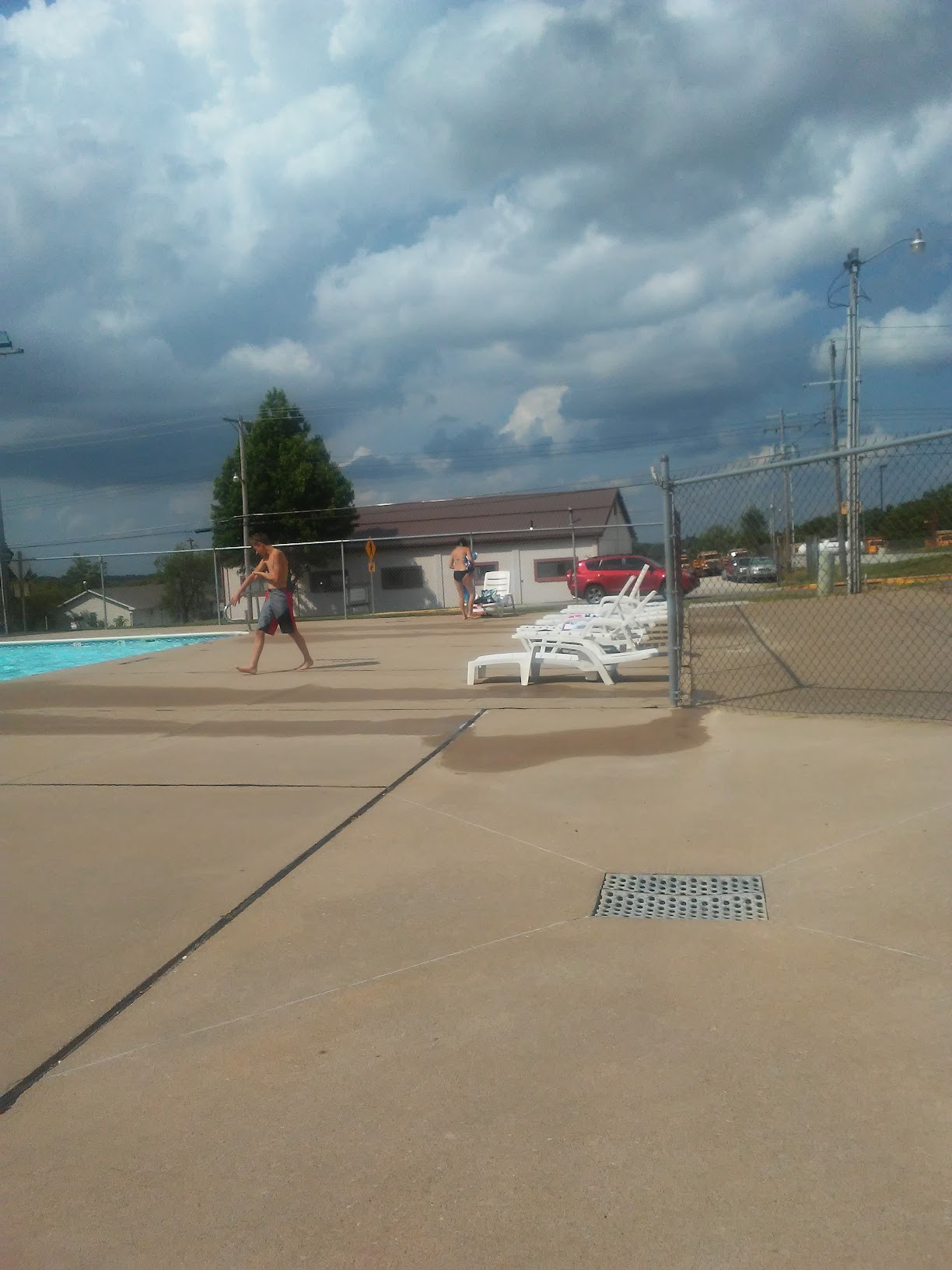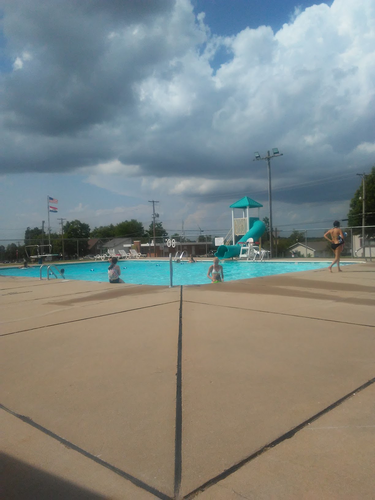 Pool is great for getting out of the sun on a hot day and having fun with your friends. It does get very cramped on hot days the big pool starts at 4 feet and increases to I think 10-12 feet. There is a slide and a diving board. There is also a smaller pool of to the side for smaller children. This pool is About a foot deep. They do have changing rooms with showers. Food and drinks are sold there however it is priced a little bit high and they run out of nacho cheese very fast.