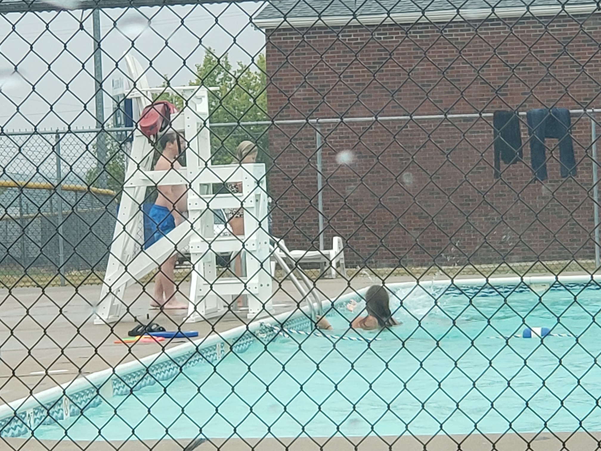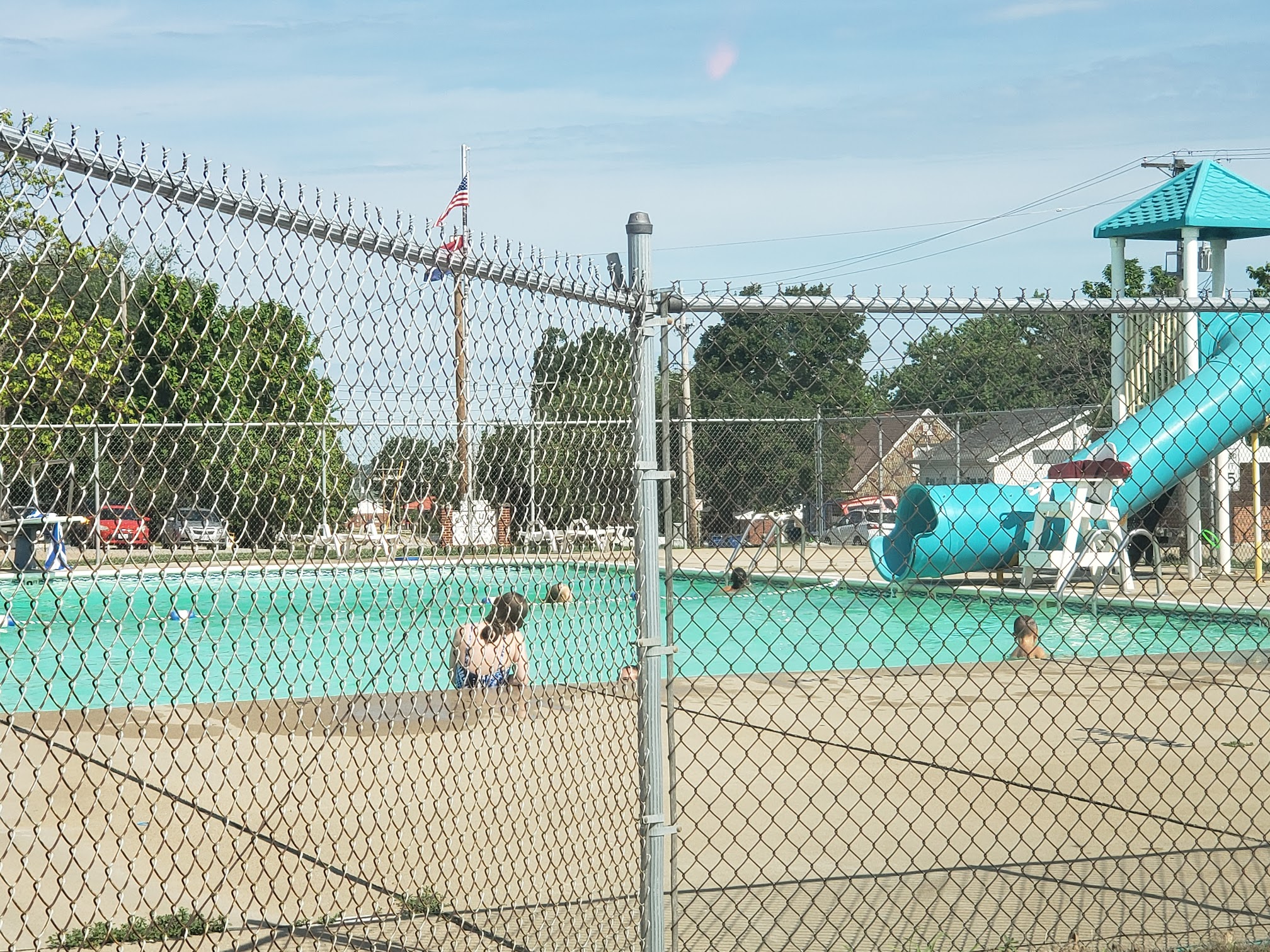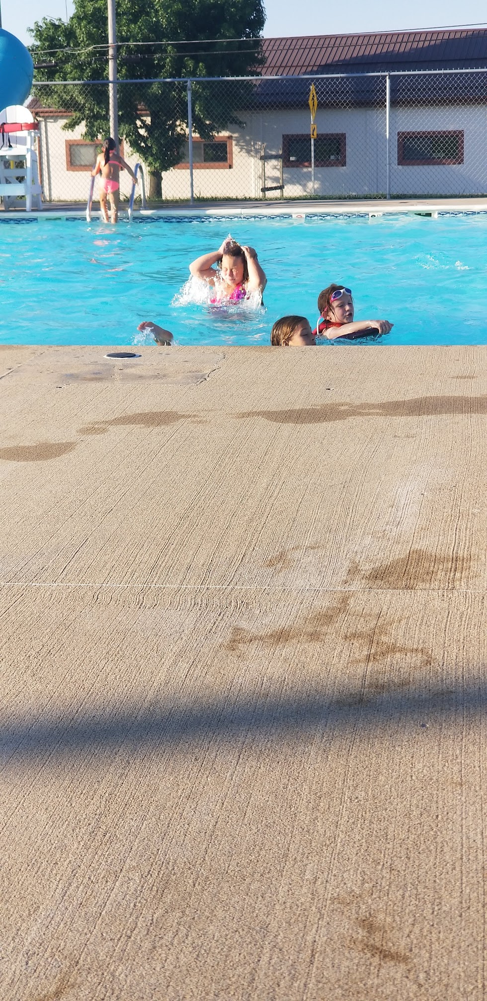 Pool is great for getting out of the sun on a hot day and having fun with your friends. It does get very cramped on hot days the big pool starts at 4 feet and increases to I think 10-12 feet. There is a slide and a diving board. There is also a smaller pool of to the side for smaller children. This pool is About a foot deep. They do have changing rooms with showers. Food and drinks are sold there however it is priced a little bit high and they run out of nacho cheese very fast.