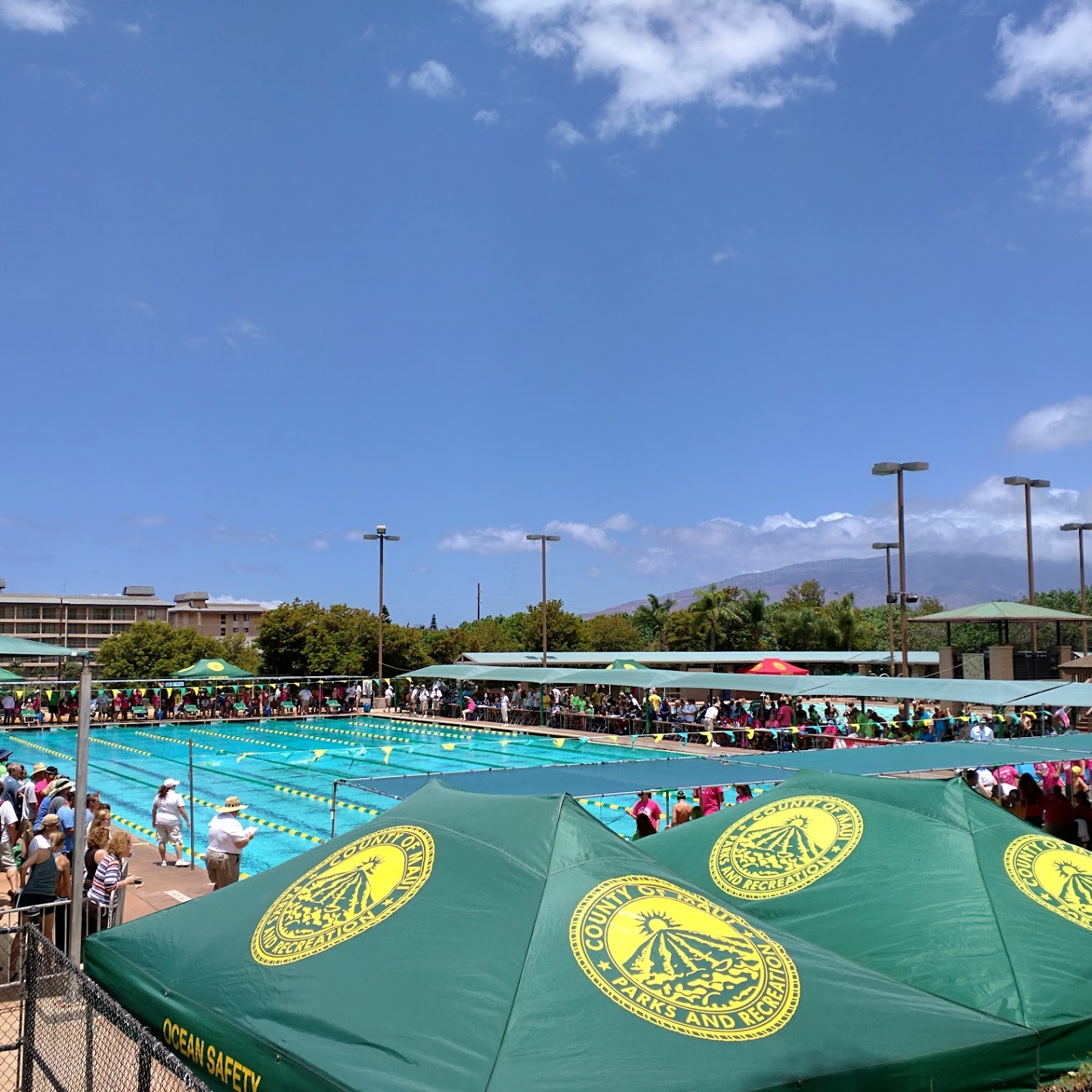 Several pools, lap swimming, deep water with diving boards, 1 high 2 low, kids pool/area and at least one water aerobics class 5-6 days a week, all free! The Deep water aerobics class is fantastic, excellent workout with a difficult rating, while the Shallow water class is beginning. Both require water weights and are supplied. Also, deep water requires a flotation belt, also supplied. Men’s and women’s showers, lockers and changing area, although not private. 4 star, not 5 because only 2 of the 5 showers work in the women’s area, also, one diving board is out of commission. Ample parking and handicap accessible.
