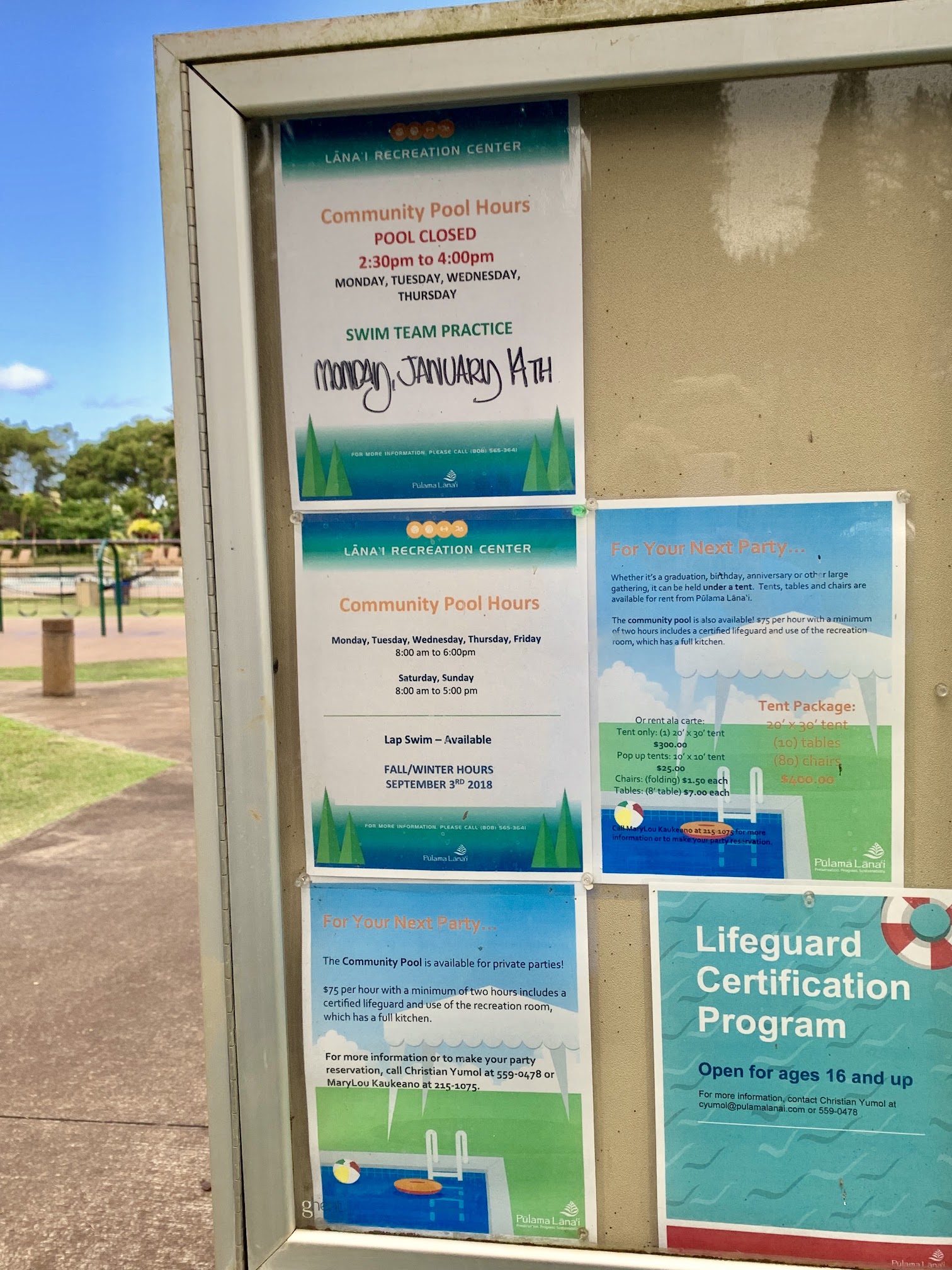 The Lāna‘i Community Pool, located at 249014011, Lanai City, HI 96763, USA, is a public aquatic facility managed by the County of Maui, Department of Parks and Recreation. It serves the local community by providing a space for recreational swimming, lap swimming, and often hosts swimming lessons and other water-related activities.
