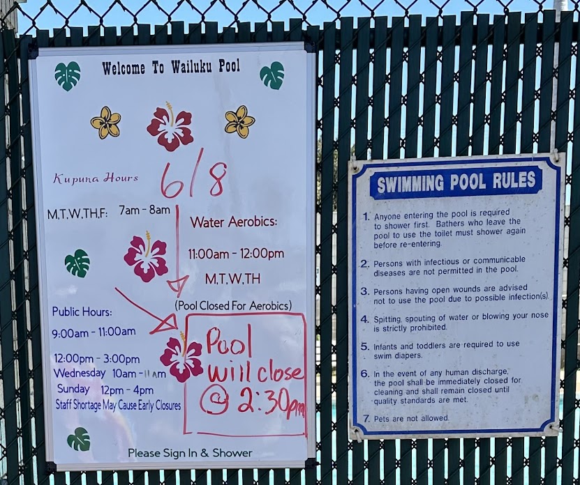 This pool was closed after that Lahaina fire due to staffing, shortages and lack of propane to heat the pool that is 3 feet deep. Yesterday April 8 2024 I discovered by driving by that it’s reopened now they will try to keep it up until 4 o’clock and I’m the only one in the pool at 1 o’clock so I’m guessing that’s why they sometimes just close it early…. It is 83 degrees! The other pools are 75 degrees now and same as ocean!It’s embarrassing if I’m the only one with a wetsuit. I like deep water, but I prefer warmer water. I was told the other pools are kept cooler because of the lap swimmers. I wait to go until after 12 o’clock noon at the end of the aerobics class because the pool is too crowded. I like doing my own swimming exercise….I always call first, But if no one else is in the pool, I can see why they might want to close it early? I prefer to go at 2 o’clock but I’m afraid they might close the pool early so I’m gonna try to get there around noon . Lifeguard was very friendly, and answered my questions about the pool itself… It’s only five minutes away from where I live so In case it’s closed. I can always drive to the beach from there., , swim in my wetsuit… Closest beach is Kanaha but harder to swim if the water is choppy from wind.I was going to the Harbor to swim i: less choppy … But since I’m rehabilitating after knee surgery I’m back injury and shoulder injury, shallow, or pool is better for me right now