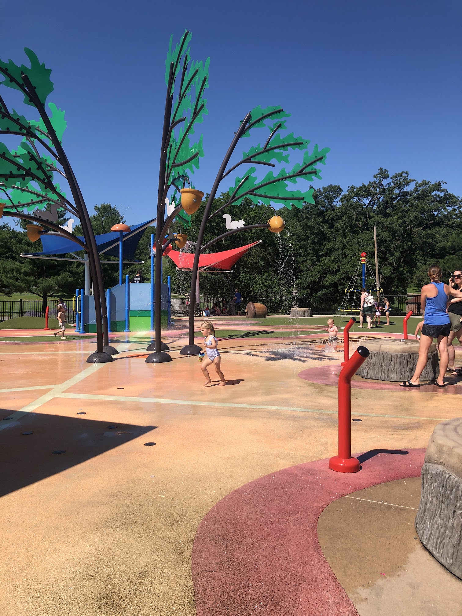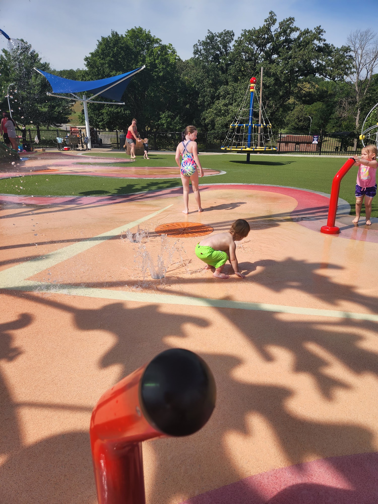 No consideration on the shade canopies above the few tables in the water area for parents. Apparently they didn't take the Sun and it's angle to the tables into account when they built it. No trees near for shade either. 4 or 5 MO native tree's 🌳 would make a nice sun block for the park attendees.