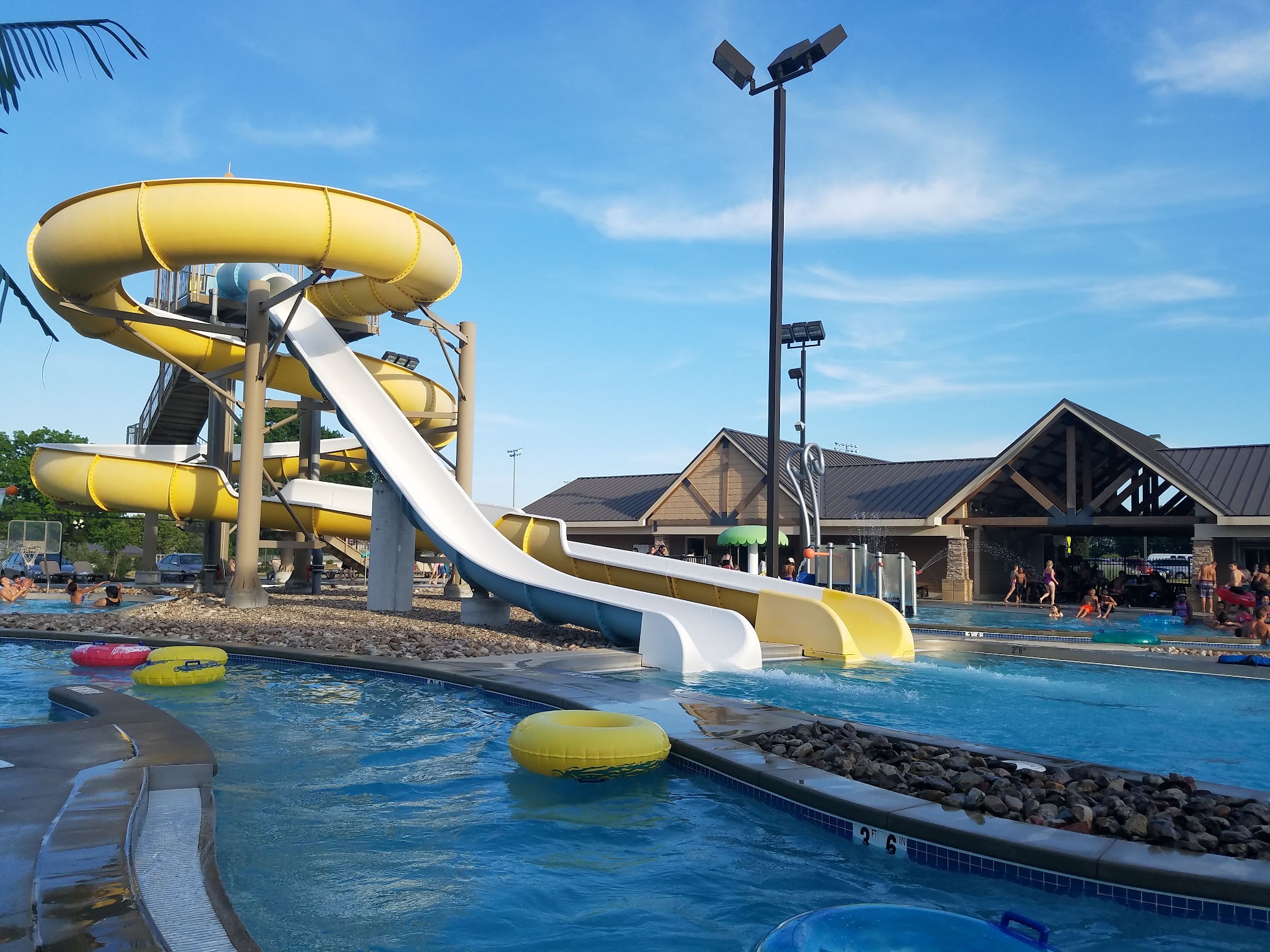 Sprawling park with a playground and a baseball field, along with a swimming pool, a lazy river and a water park.