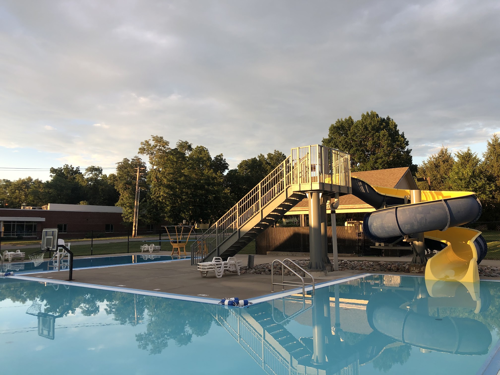 Community pool, popular with families, featuring a water slide and a diving board.
