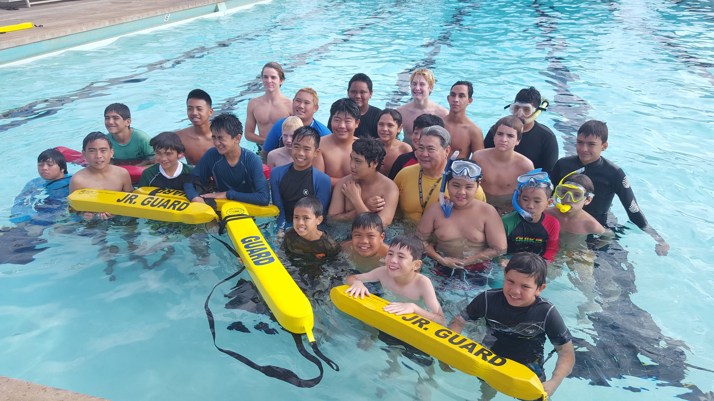 Public swimming pool with lifeguards.