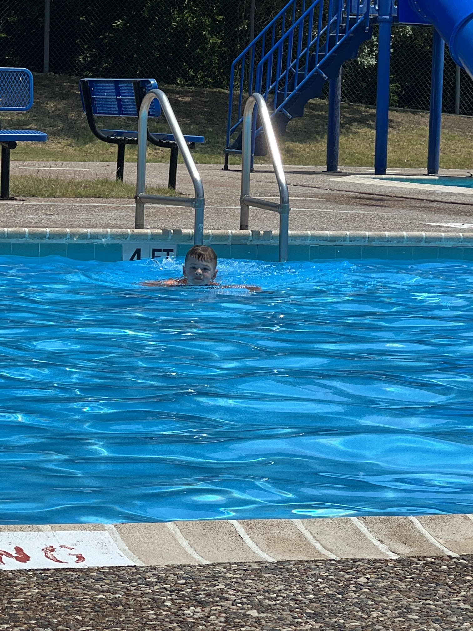 The pool itself is nice and clean. The parking lot had some type of drug needles and all kids of trash. Don't bring anything to play with in the pool. Basically nothing is allowed. No toys, no baby floats, no footballs, no life jackets in the deep end or down the slide, no parents going down the slide with their kid in a life jacket, no beach balls, nothing was allowed. I understand to an extent about keeping people safe but these 16-20 year olds ",in charge" were on a massive power trip. Oh, and get ready for a LOT of whistle blowing!!