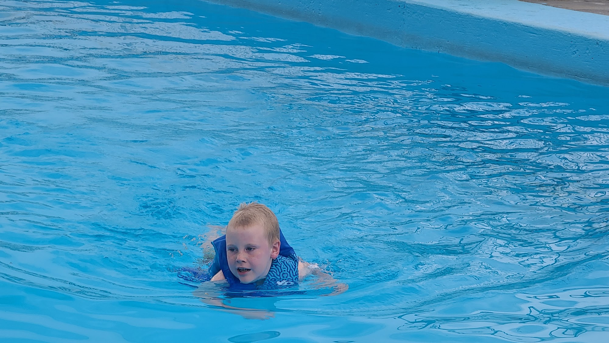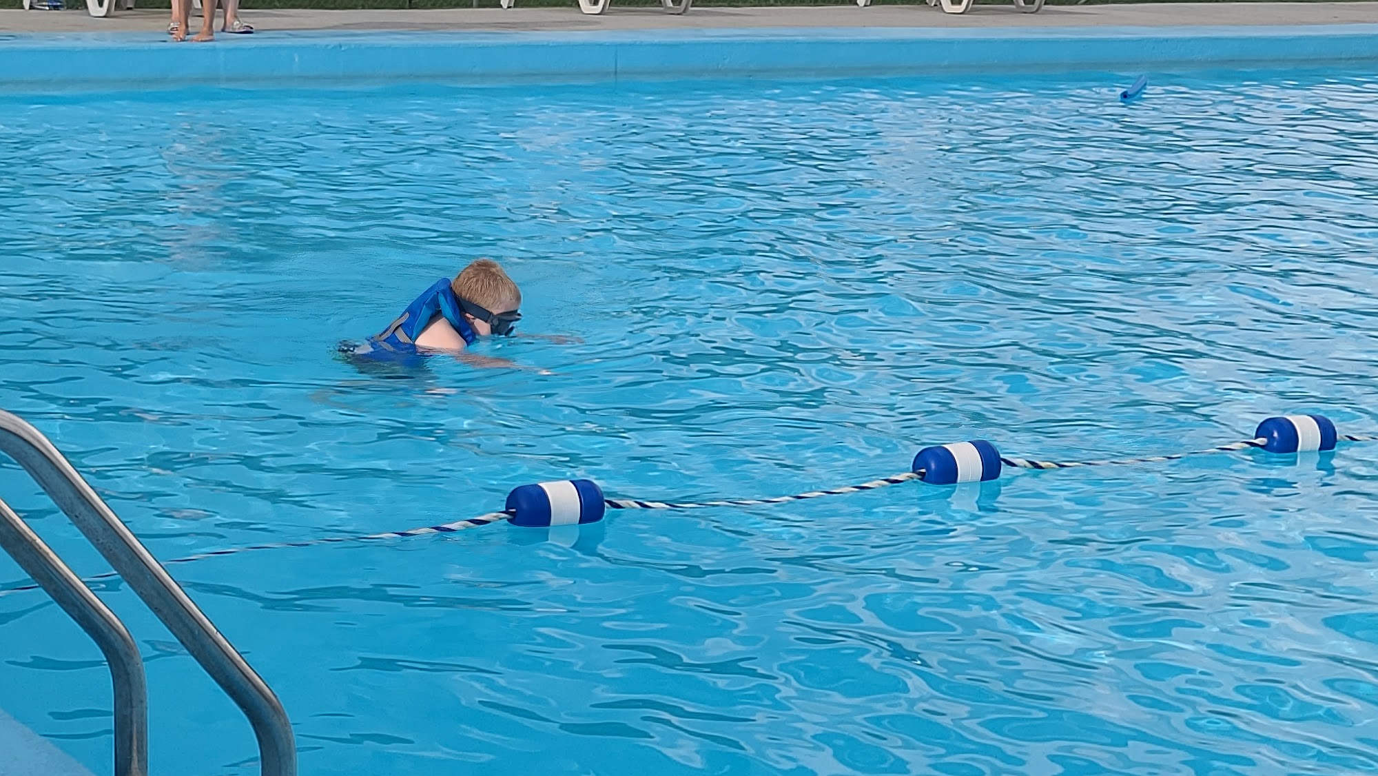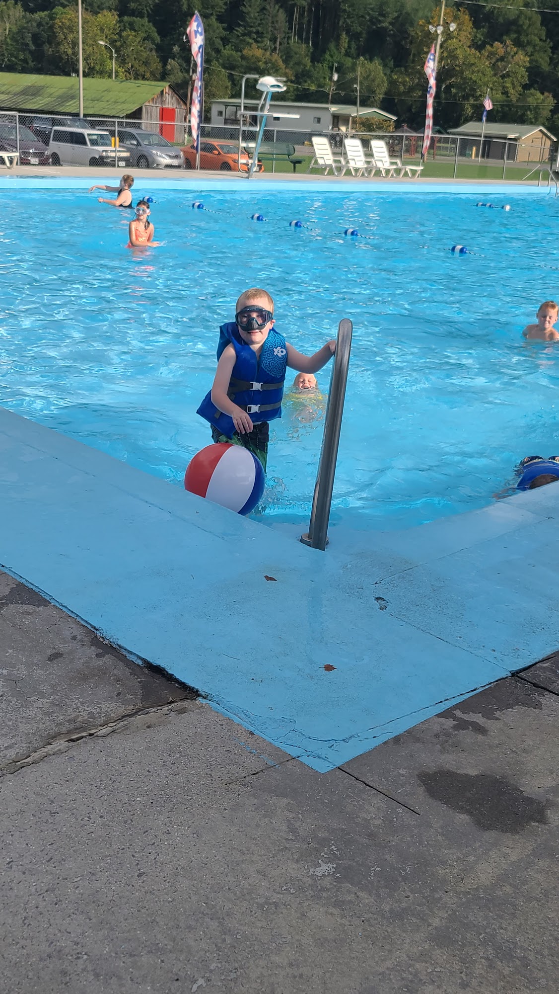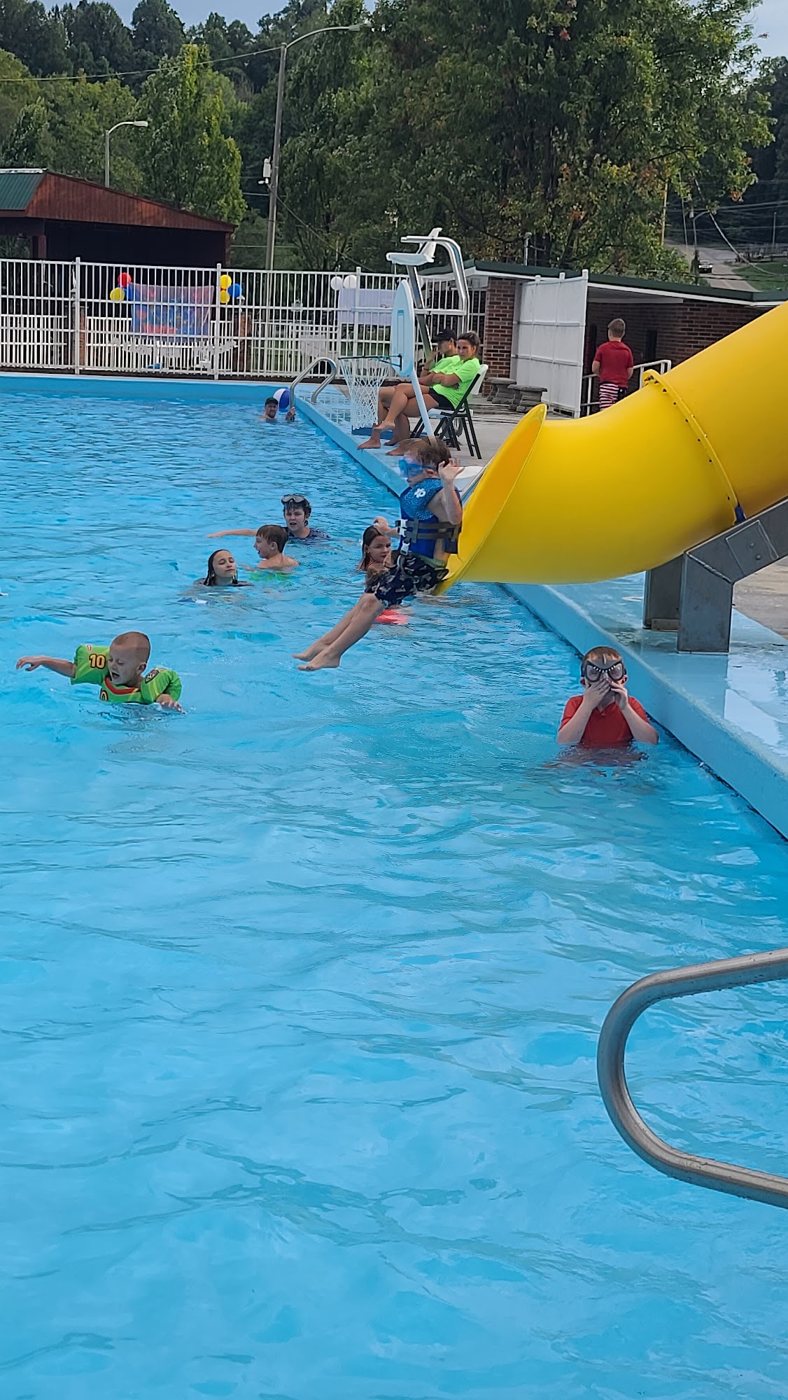 Great place for entire family. Small slide for little kids in shallow end and a diving board in the deep end. Life Guards on duty. Good music and concessions. Lounge chairs in the sun and picnic tables under covers for shade.