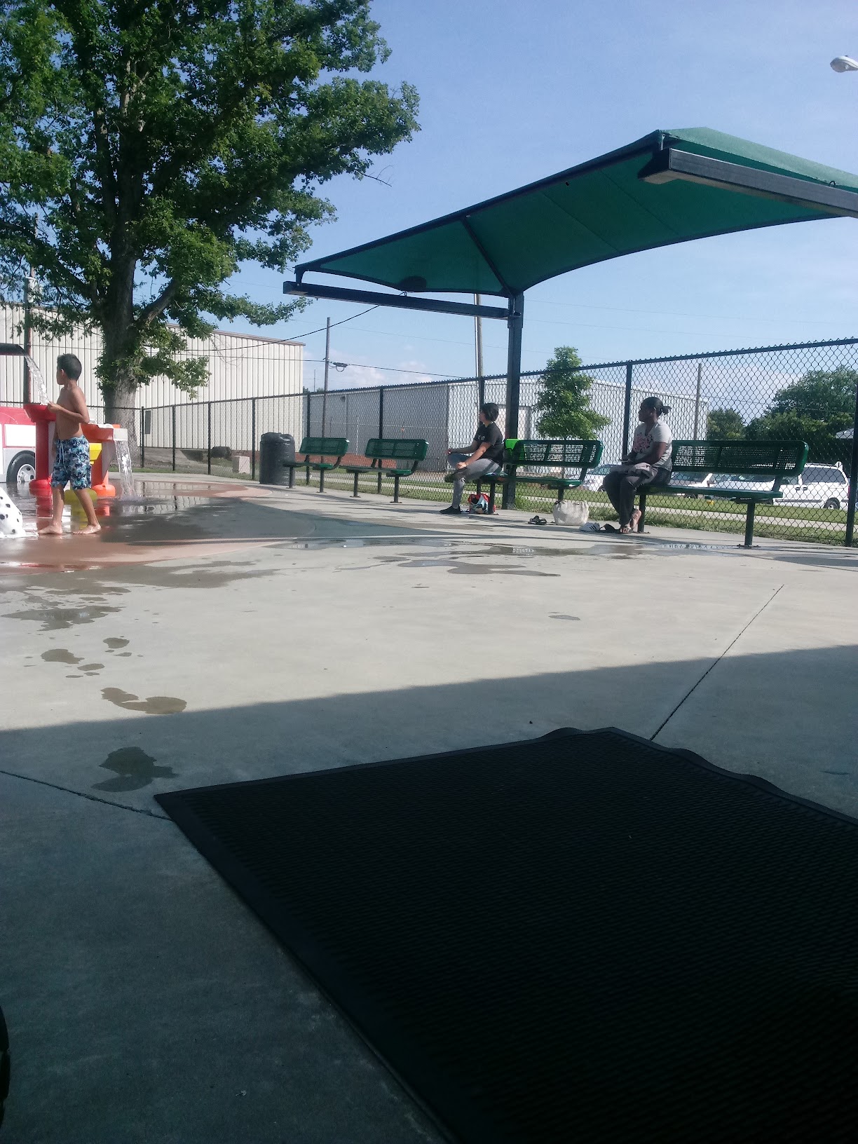 This is a great splash pad. It's free and is fenced all the way around with a child proof lock. Some of the items don't work, but for the most part it's a great splash pad. They have a few benches some with covers. There is some grassy area as well. There are bathrooms, but they are kinda gross. Use if an emergency. There was ample parking. There was a few groups of men in the park next door, but I felt relatively safe. We will go again!