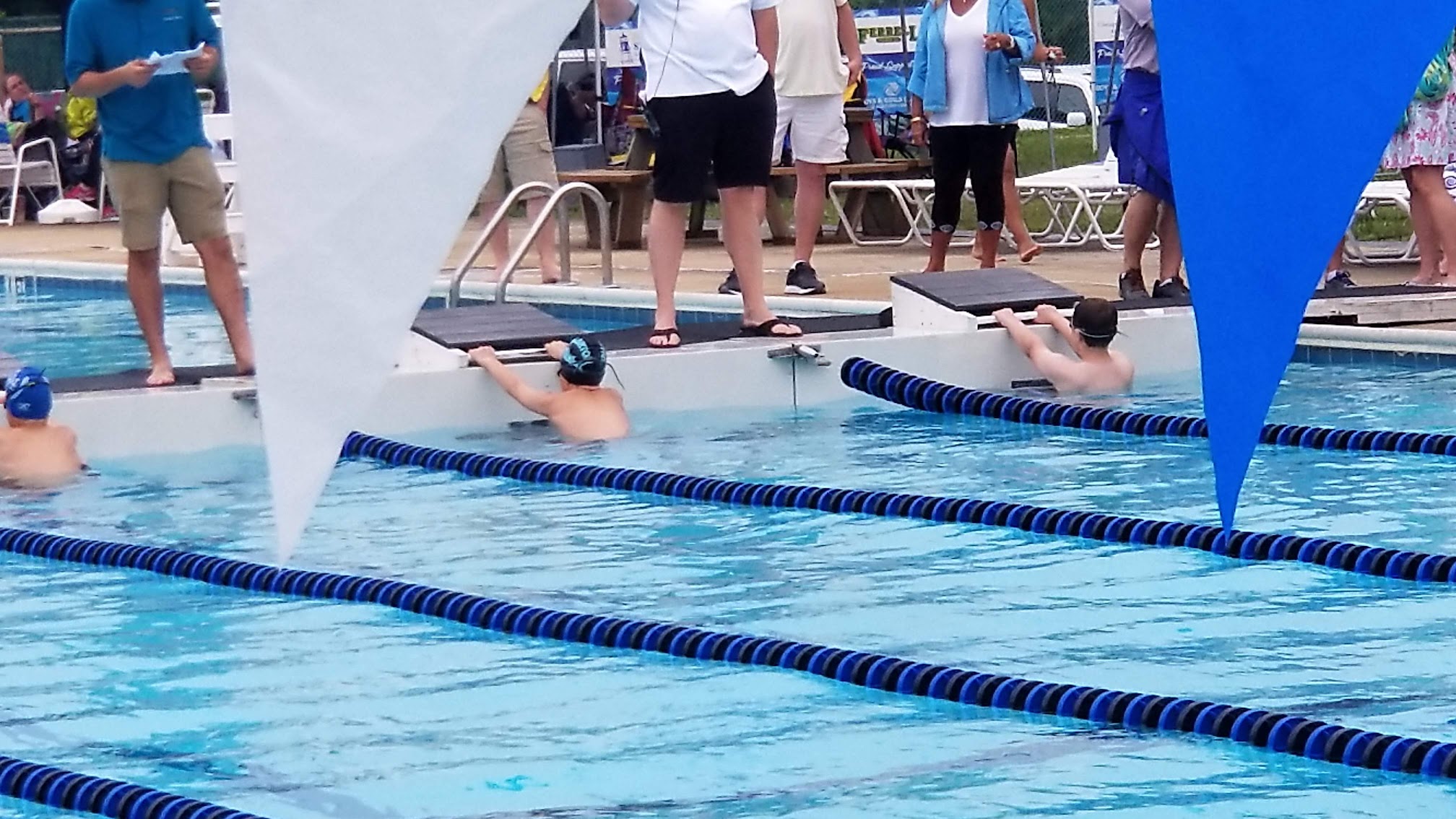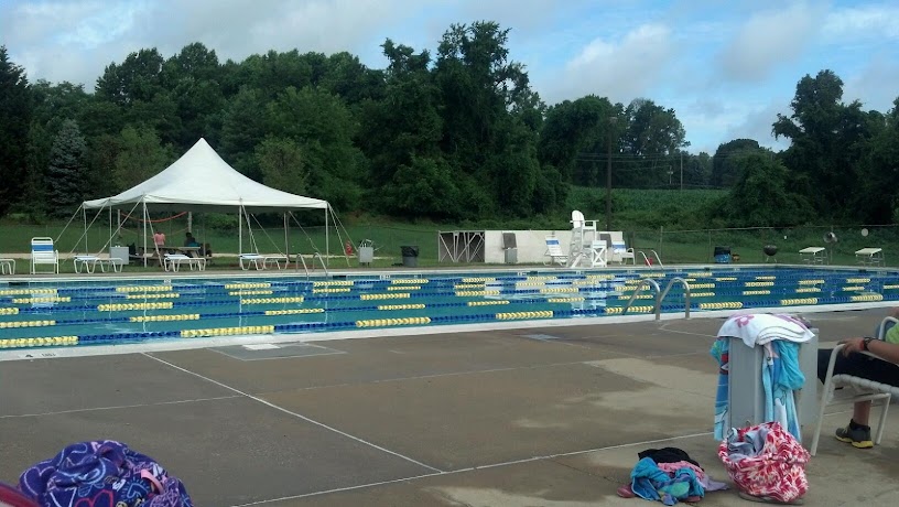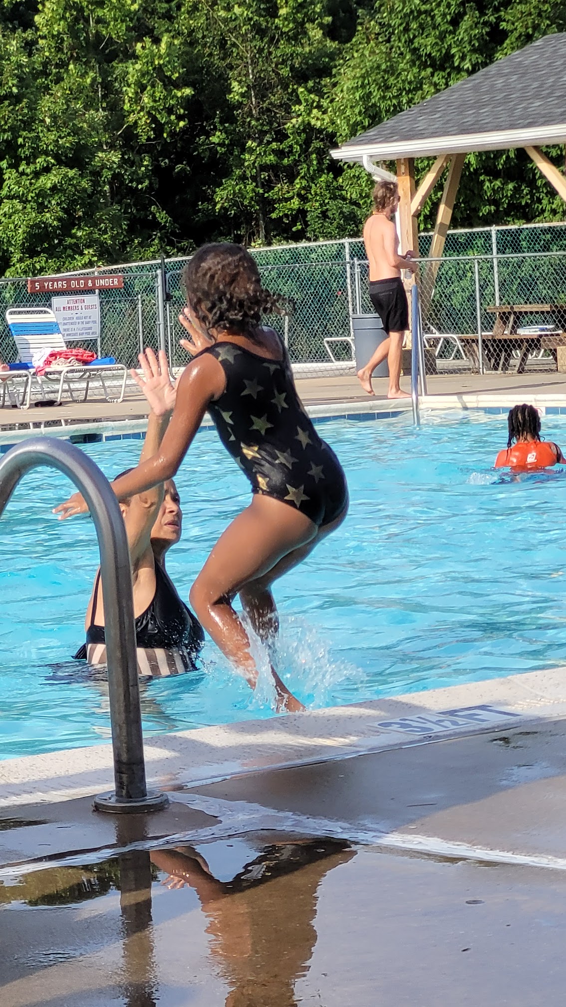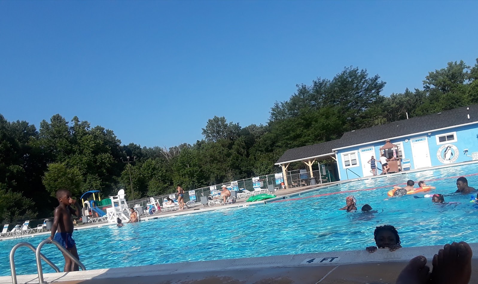 Public swimming facility featuring a kids' pool, diving board, playground, and grills.