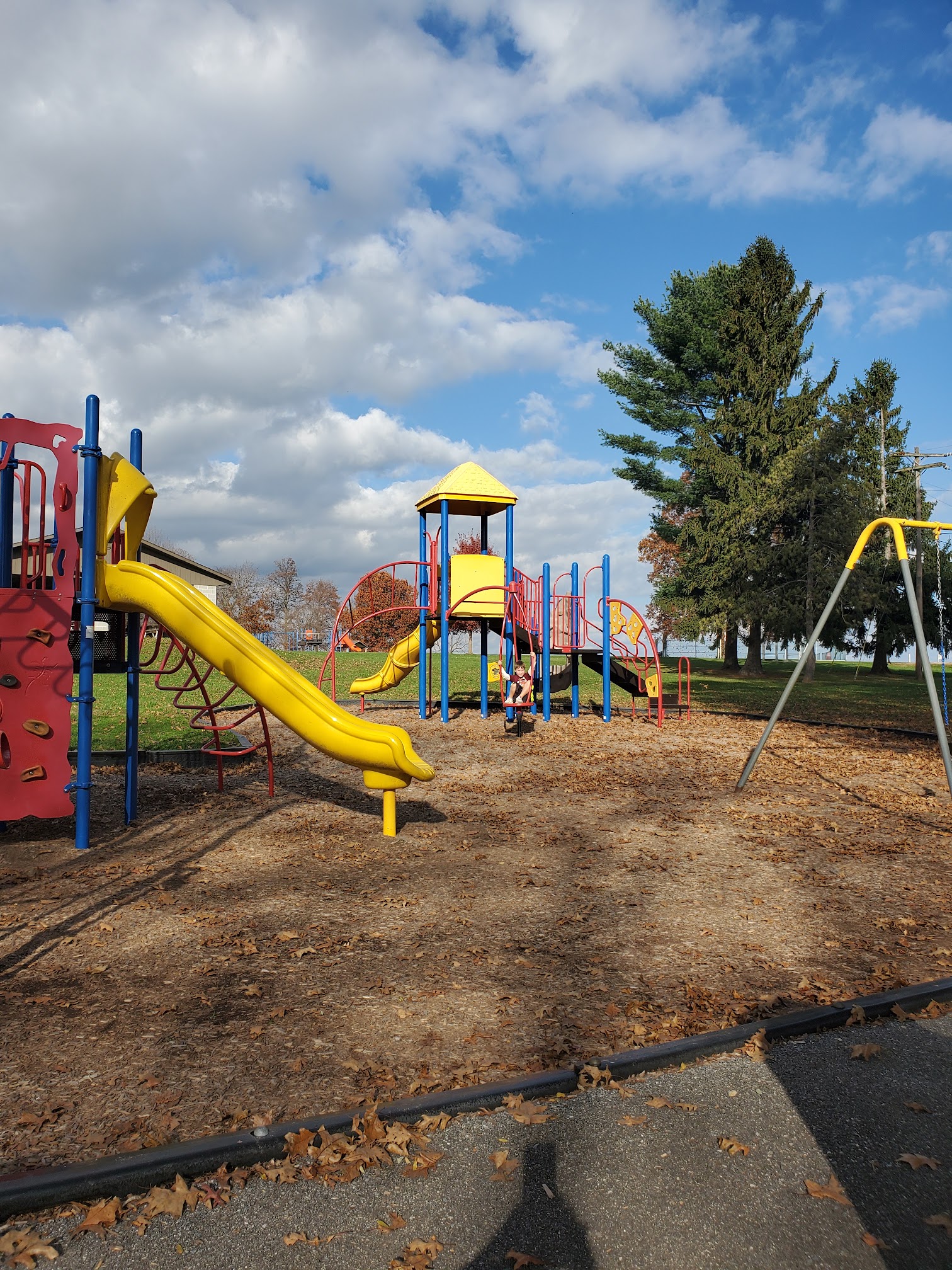 Swimming pool with slides and a park area with swings.