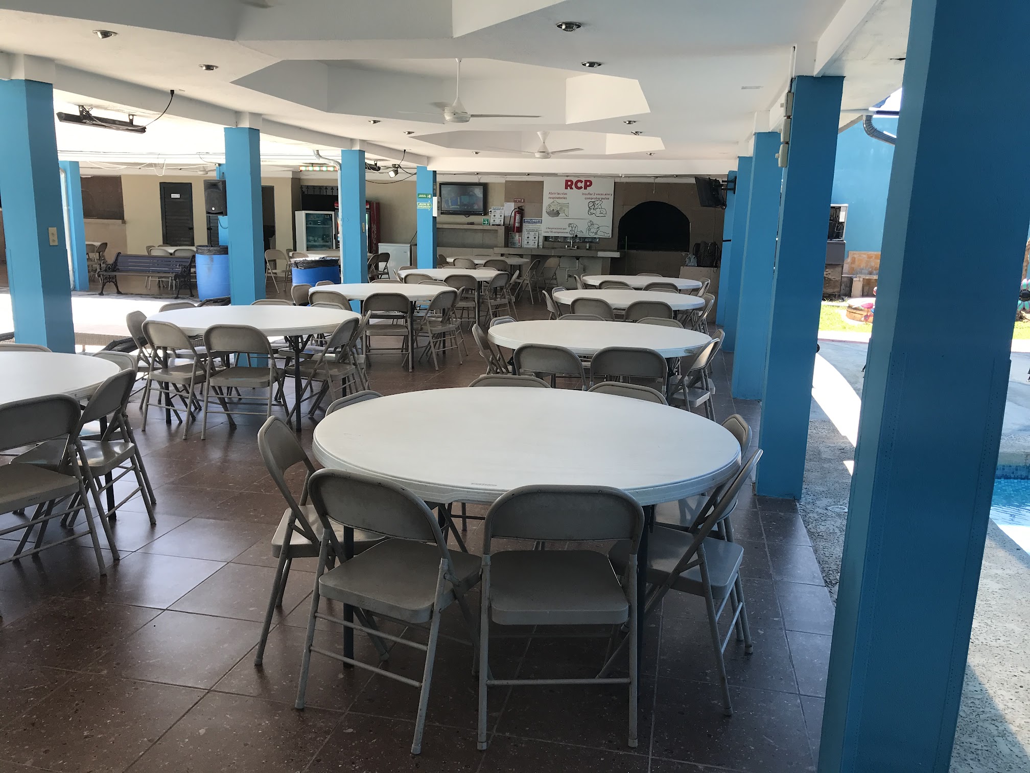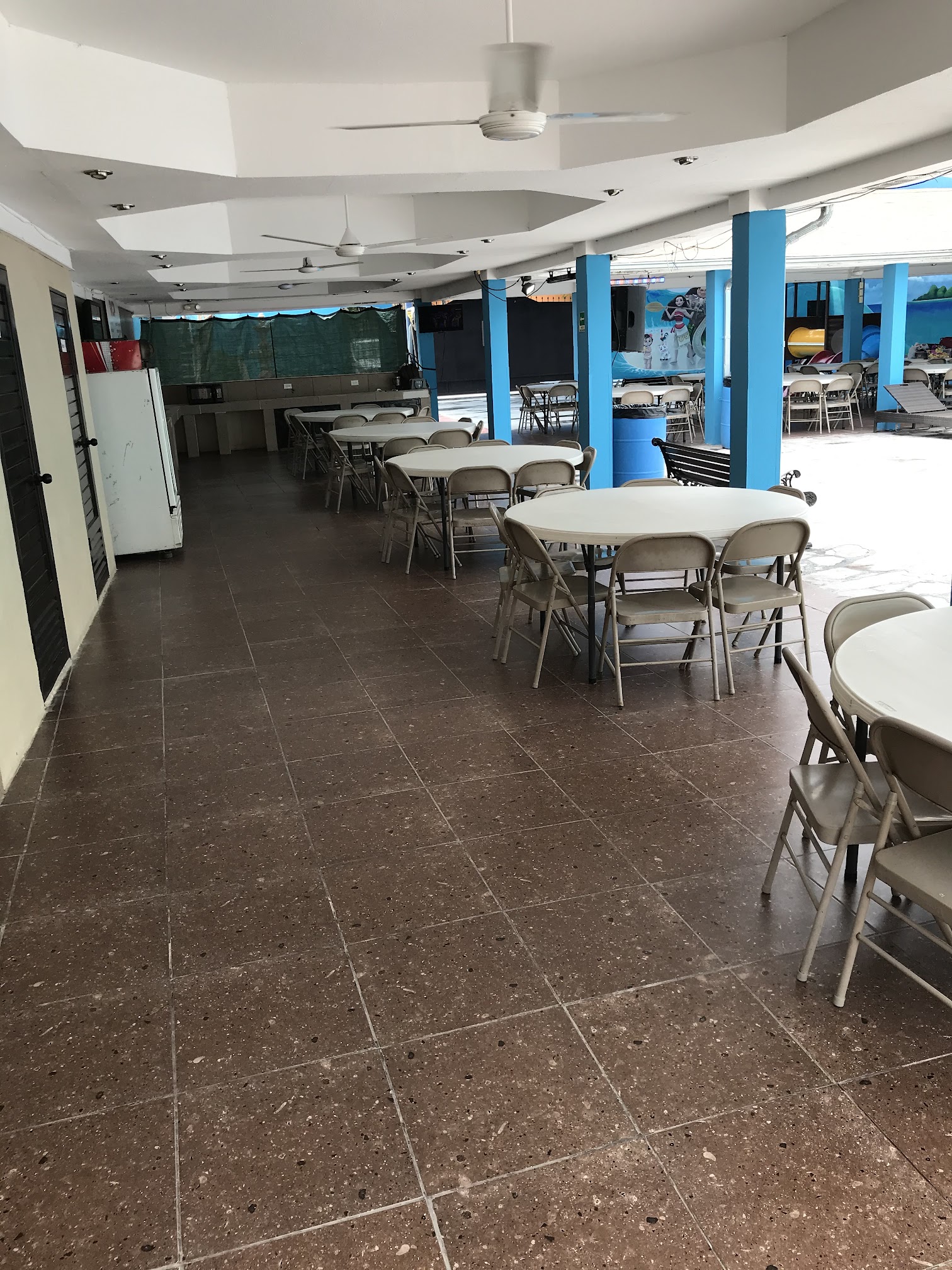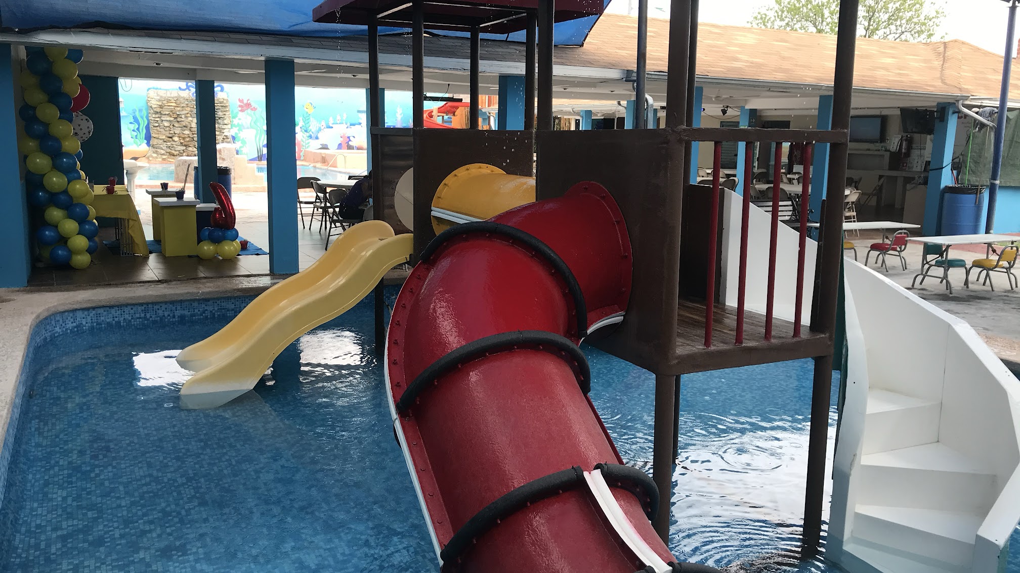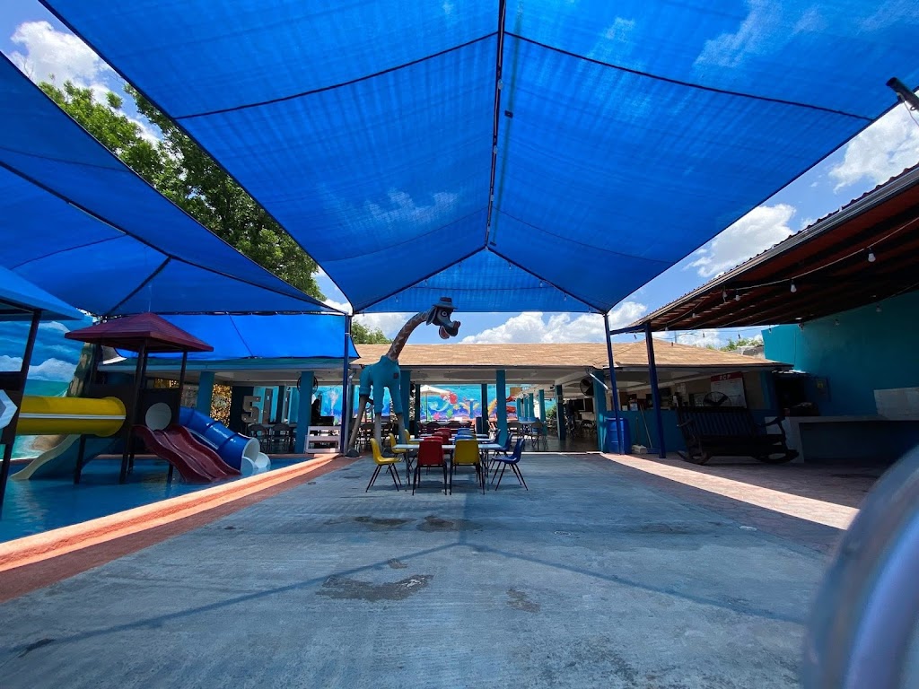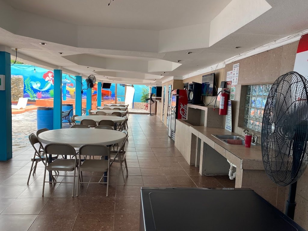Tiene 3 albercas con juegos adentro de 2 de ellas. Dos son para chiquitos y una es para más grandes. Esta excelente el lugar. Techo, mesas, sonido, tele, wifi.