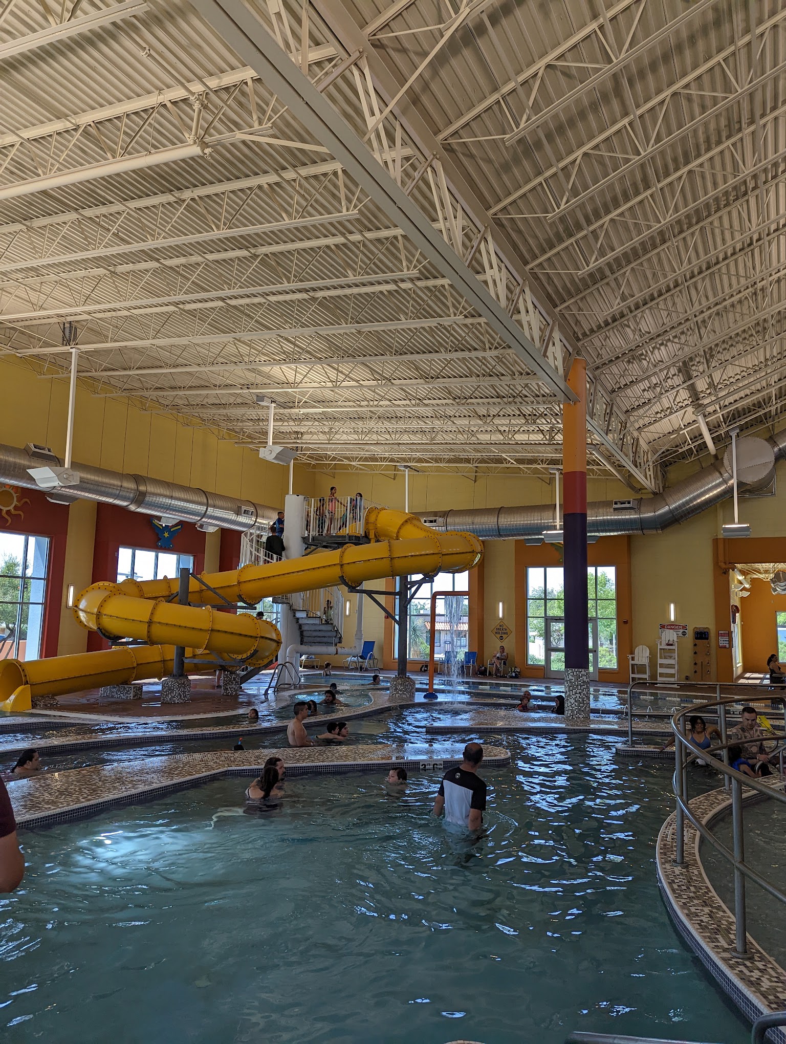 Clean aquatic center featuring an indoor heated pool with lap lanes and a slide, plus a gym, showers and friendly staff.