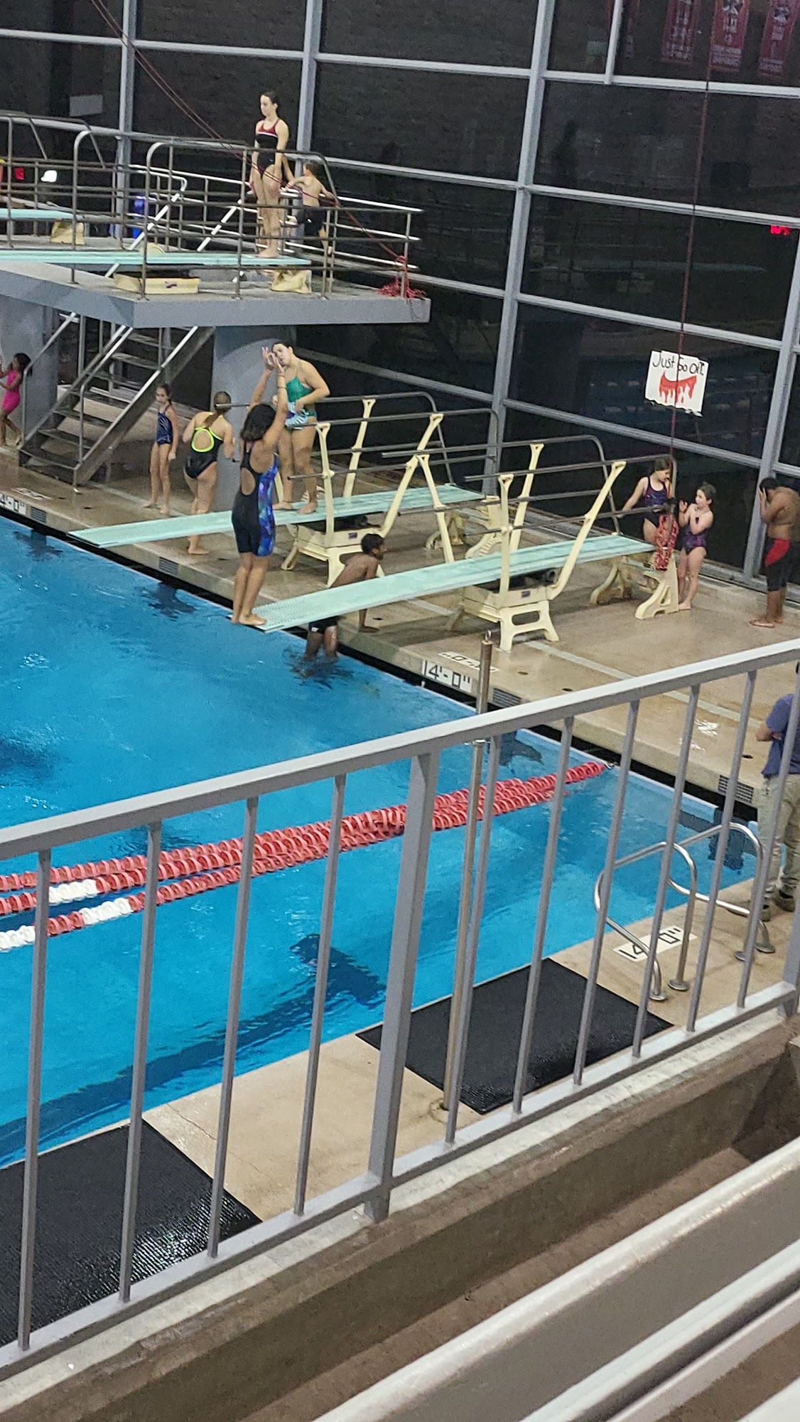 The diving club allowed us to join them for practice before a masters diving meet. The team and coaches were very hospitable. There are 2 3m. springboards and 2 1m. springboards in a separate diving well. I love the windows: you can see a nice view of the strip!
