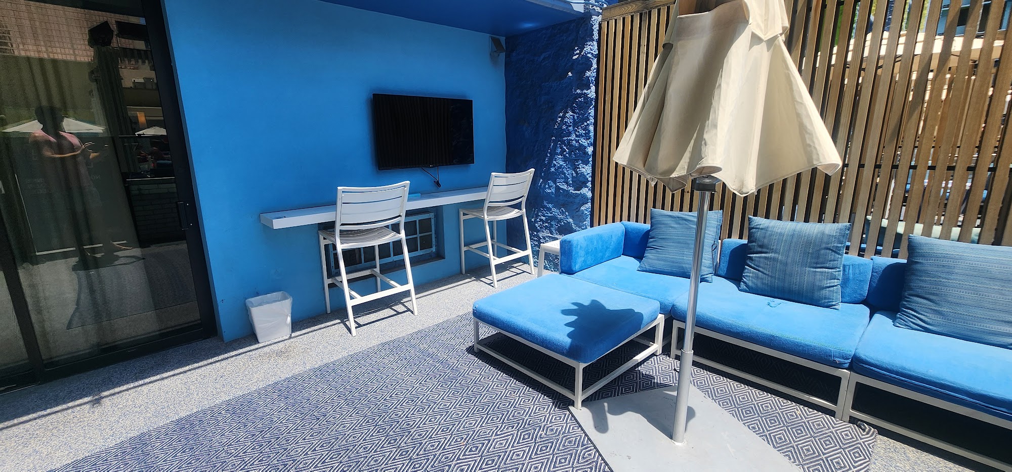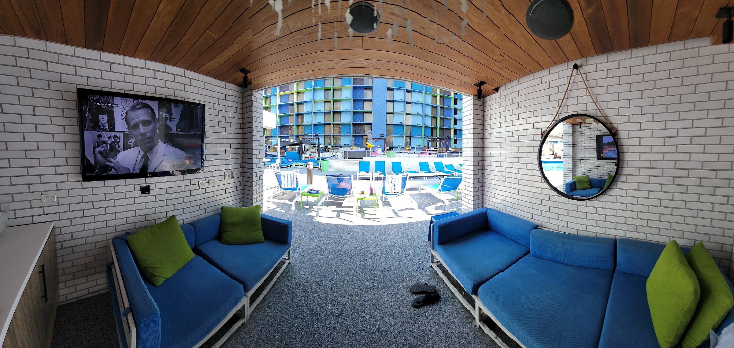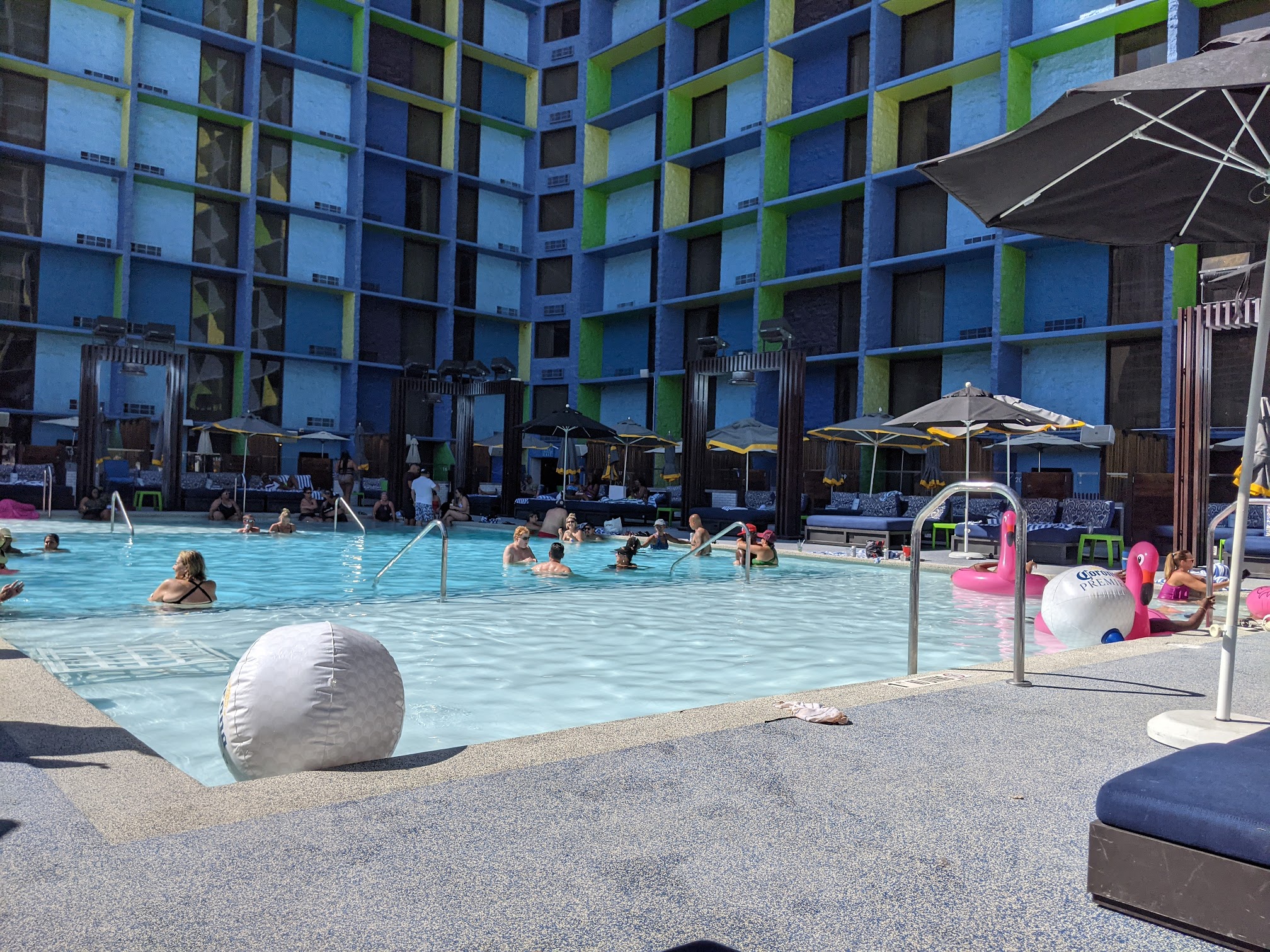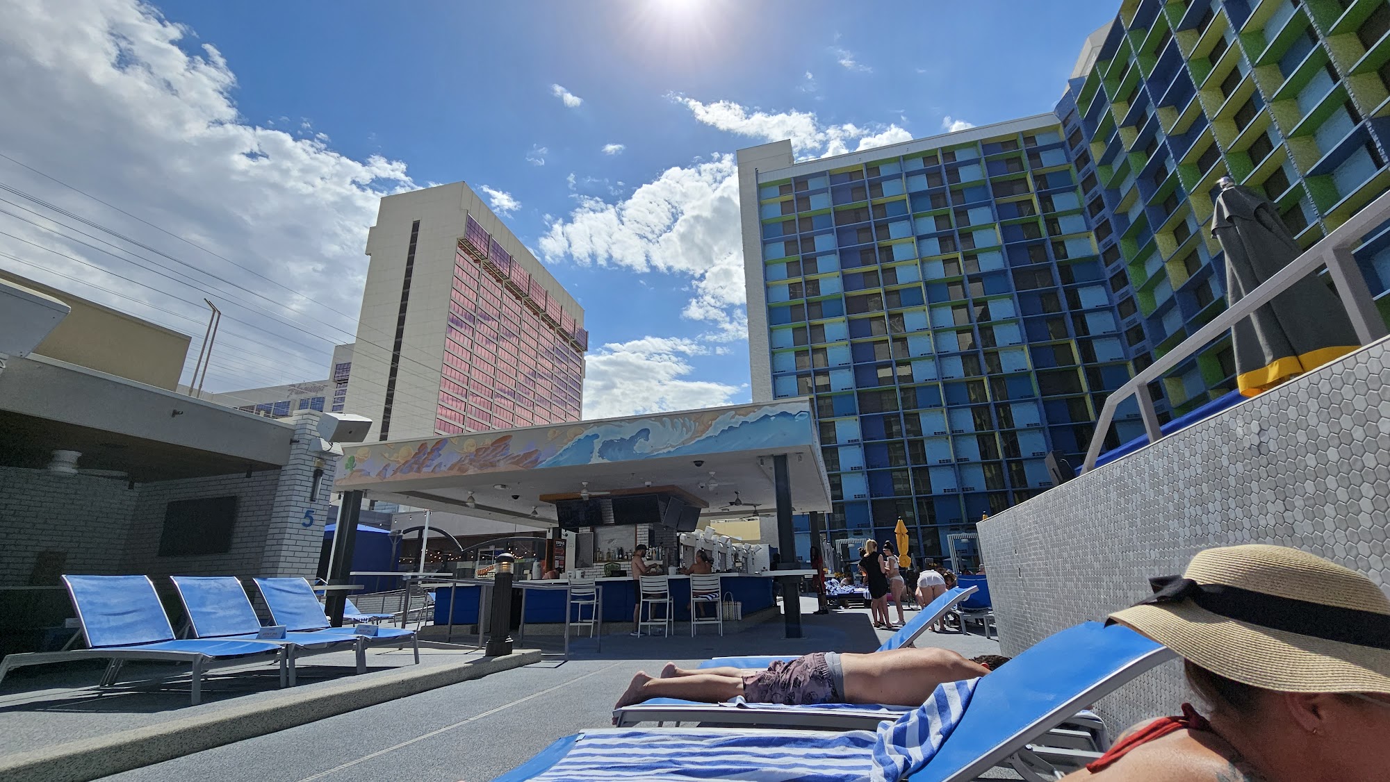 A small yet fun pool. This is a less chaotic pool with a smaller crowd. A DJ spins throughout the day to provide a good vibe and lively energy but its annoying if you're trying to catch some sleep. Limited lounge chairs and not much sun the way the pool is situation between the buildings. Drinks are reasonably priced.