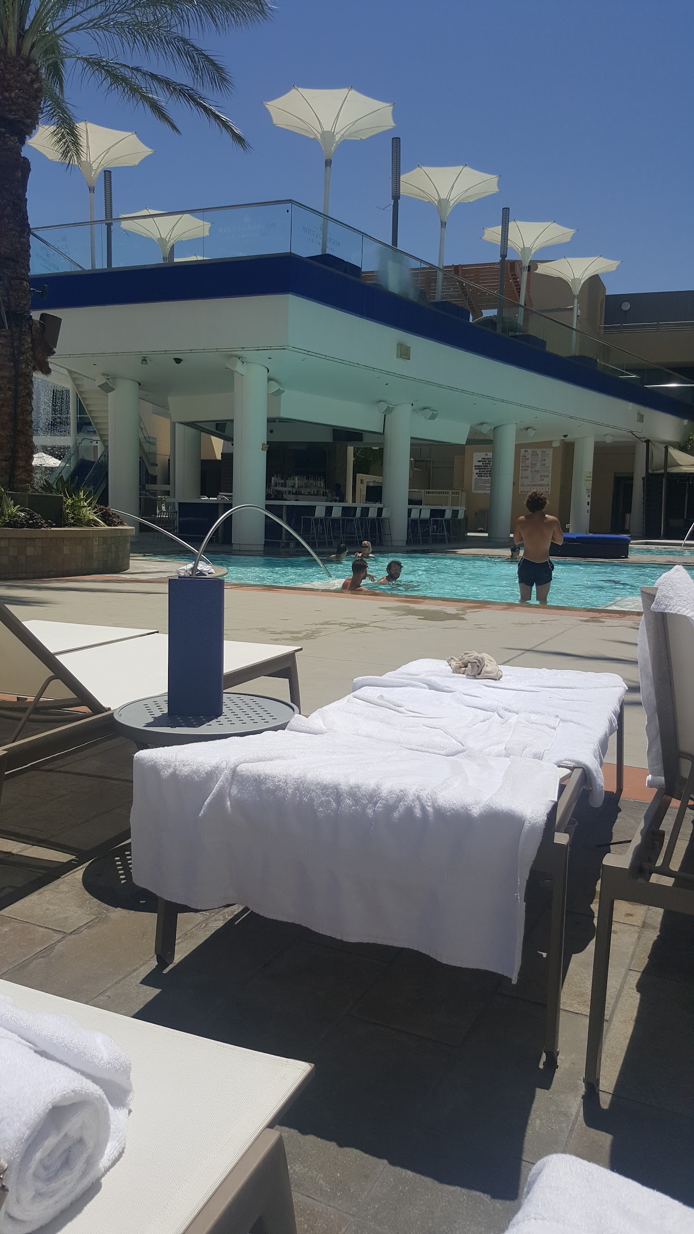 I normally will not leave a negative review. This is my first ever and I've debated it for weeks. My friend rented a cabana for her birthday on 5/24. Along with rented rooms, tickets for a show, and reservations at one of the on-site restaurants. Our experience was a DISAPPOINTMENT! The pool was shut down for an hour on 2 different occasions during our rental. This was due to people throwing up in the pool. Our server was no where to be seen for close to an hour. We had to on multiple occasions go to the bar to order our drinks. We ordered food and when it had not arrived in over an hour we located our server and asked. At which time we were told the kitchen was backed up. The cabana required a $500 minimum. Unfortunately they would not take into account the $150+ we spent having to get our own drinks. Thus we ended up out of pocket $100 additionally to meet the minimum. Which if the food had come out or our server was there to order drinks from we would have been over the minimum. The ONLY reason I'm giving 2 stars instead of one is because the DJ did a great job of keeping the energy up even with the multiple pool closures. Palm Management I know tourism is most of the business but us locals spend money too. And we are who people ask for recommendations on where to go, eat, stay, etc. And my recommendation is not to have the same disappointment we did spend your money elsewhere.