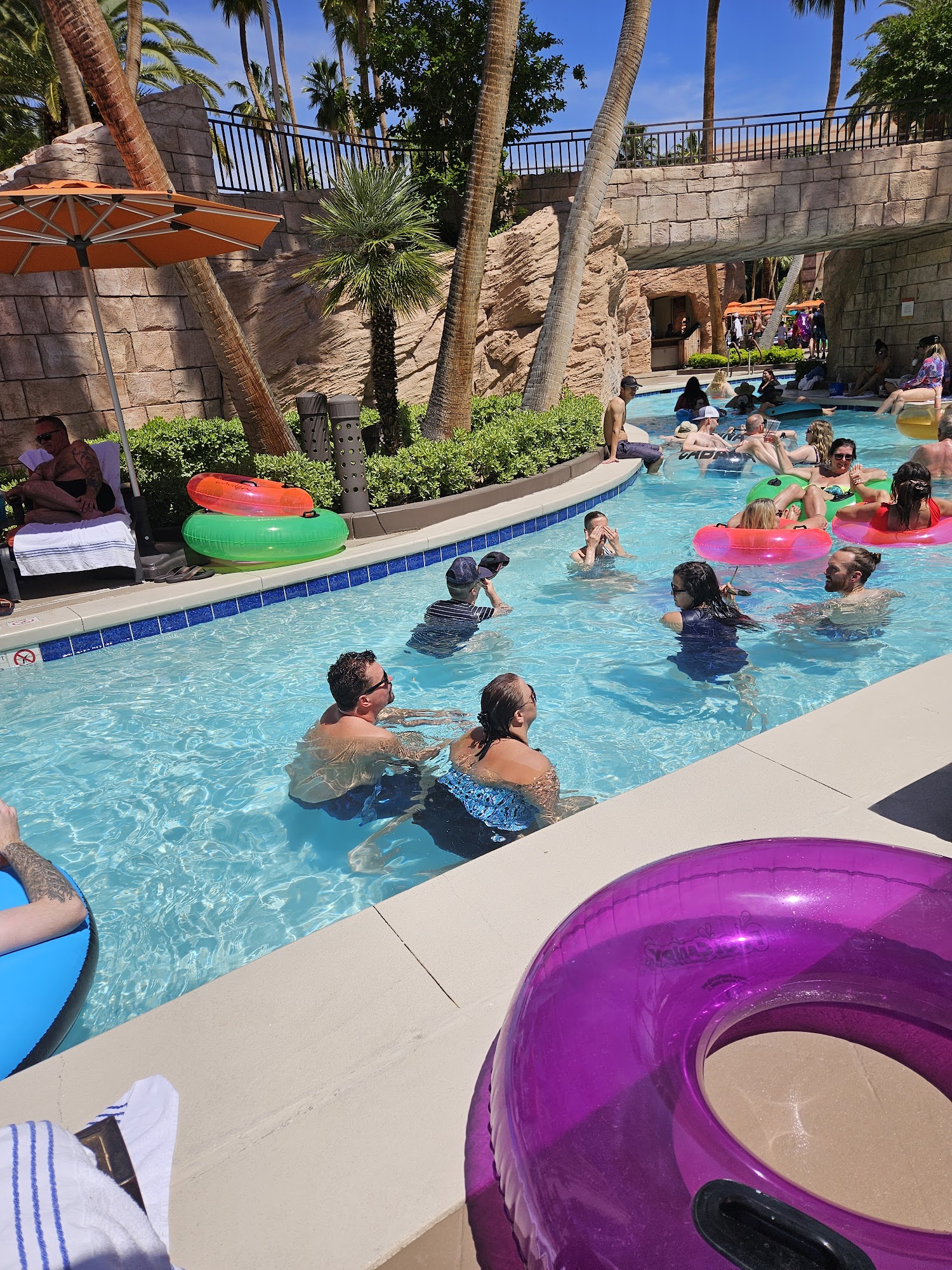 What are people saying (AI review summary)? The pools are generally clean and offer various options, including a lazy river, with plenty of seating like chairs, day beds, and cabanas, often with shade. Service is largely positive, described as friendly and attentive, especially for those with reserved seating. However, there was a specific instance of a rude staff interaction regarding towel disposal, and one complaint about excessively loud music, which contrasts with the typically quiet atmosphere. Poolside food and drink options are decent, with items like the watermelon salad and pita/hummus being highlights, though drinks are noted as expensive. A major drawback for some guests is the early 6 PM closing time for the pools. Booking day beds or reserved seating early is recommended for comfort and better prices, and the smoke-free environment is appreciated.