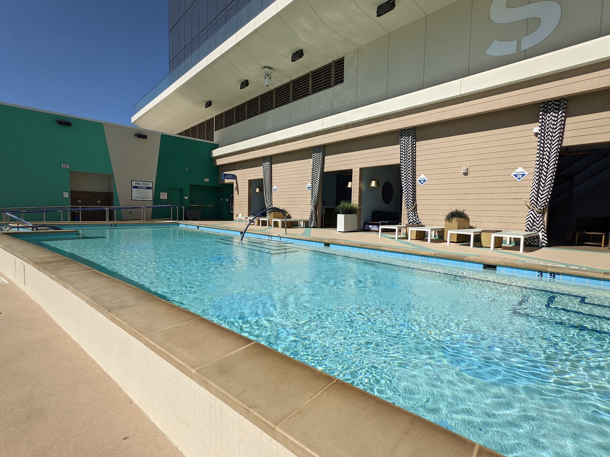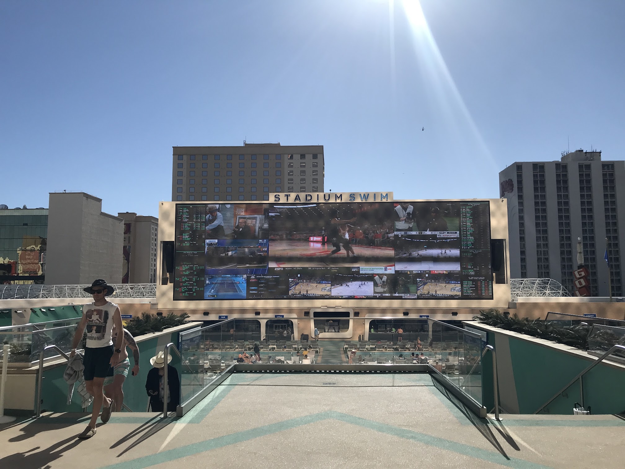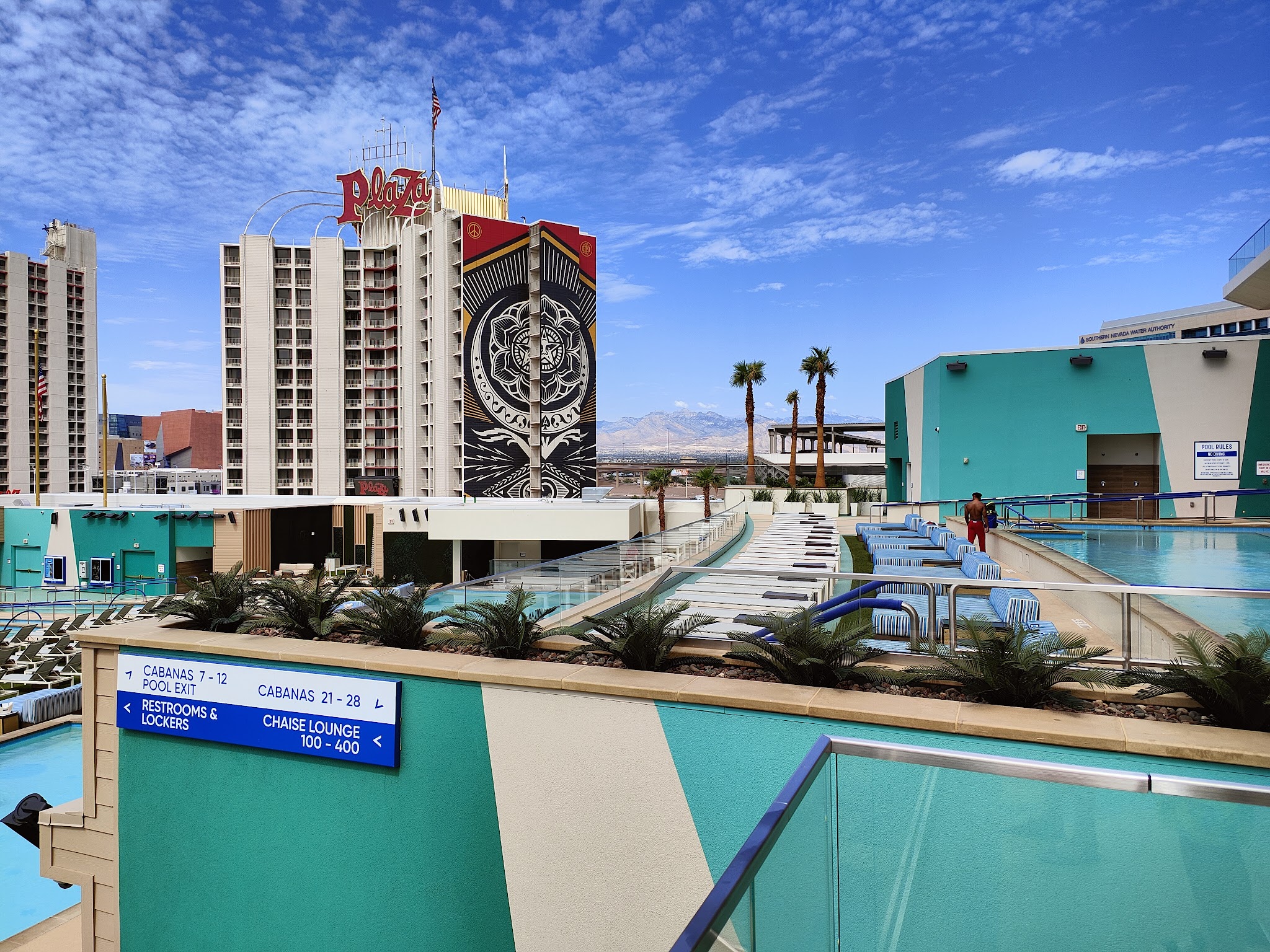 Okay so just like Vegas the food and drinks are overpriced but it’s an experience. We watched the soccer game and then the NBA playoffs. It’s a vibe! Great place to tan and hang out. The pools were all open and operational except one. The turf and walkways leading up to the pool will burn the skin off your feet. I was here on an 80 degree day. No way will this be safe when it’s 100. Pool water was warm and it’s only April. By 5:30 ish the area is shaded from the Plaza building. So if you plan on staying all day and want full sun, sit on left side. The bar and grill are easy to get to and the food is typical bar and grill food. Overall great experience.