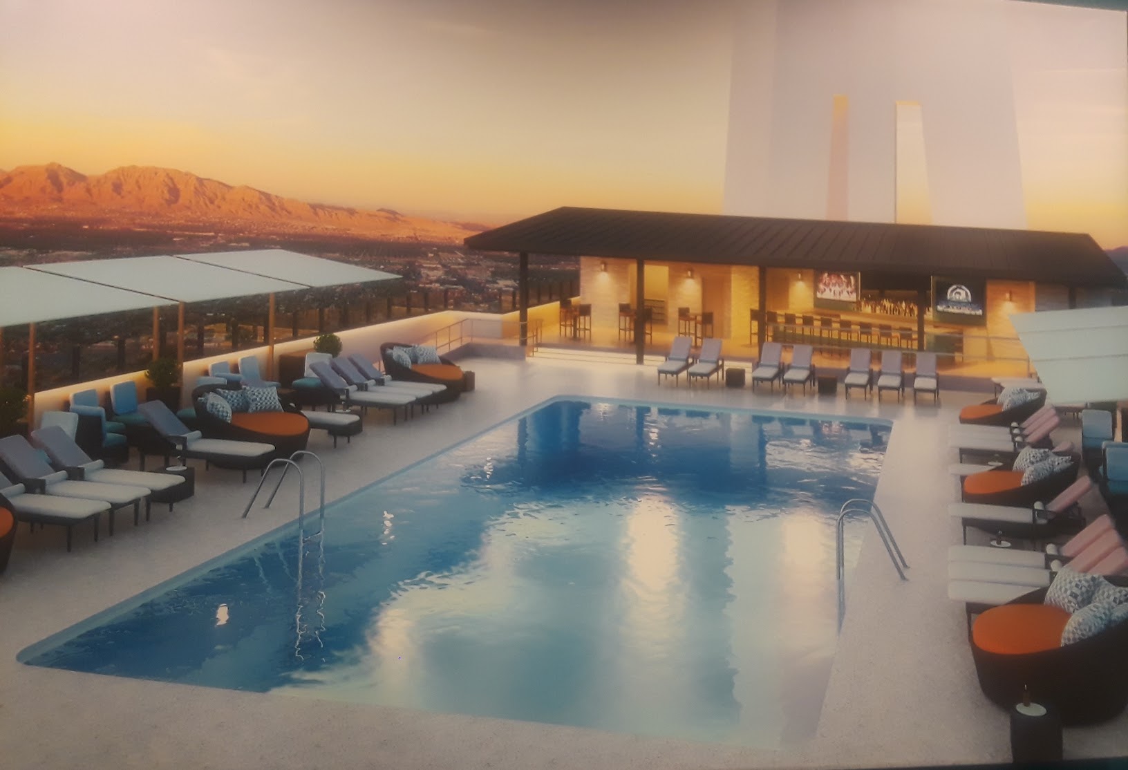 Rooftop pool spot with loungers and views of the city skyline, mountains and valley.