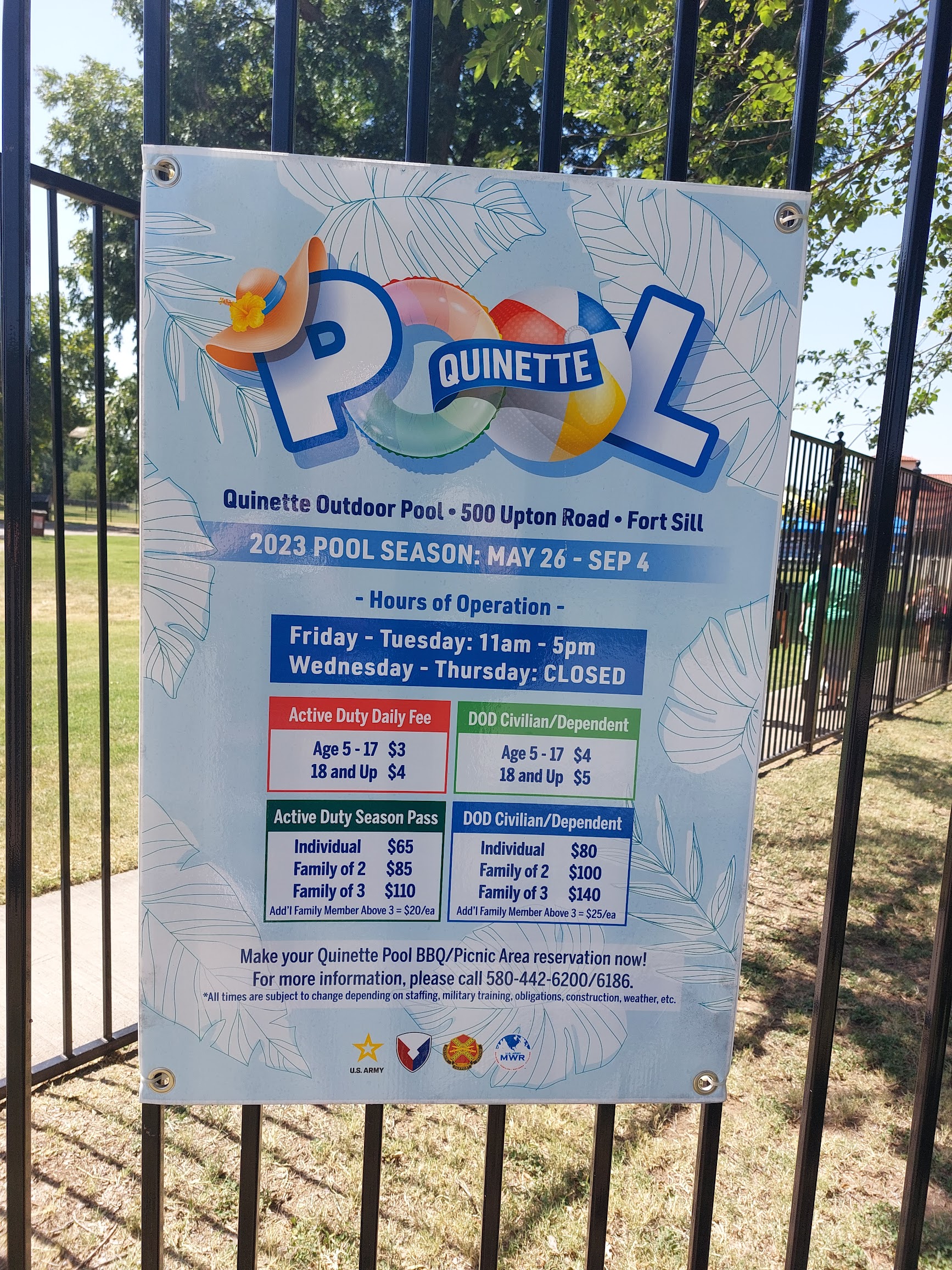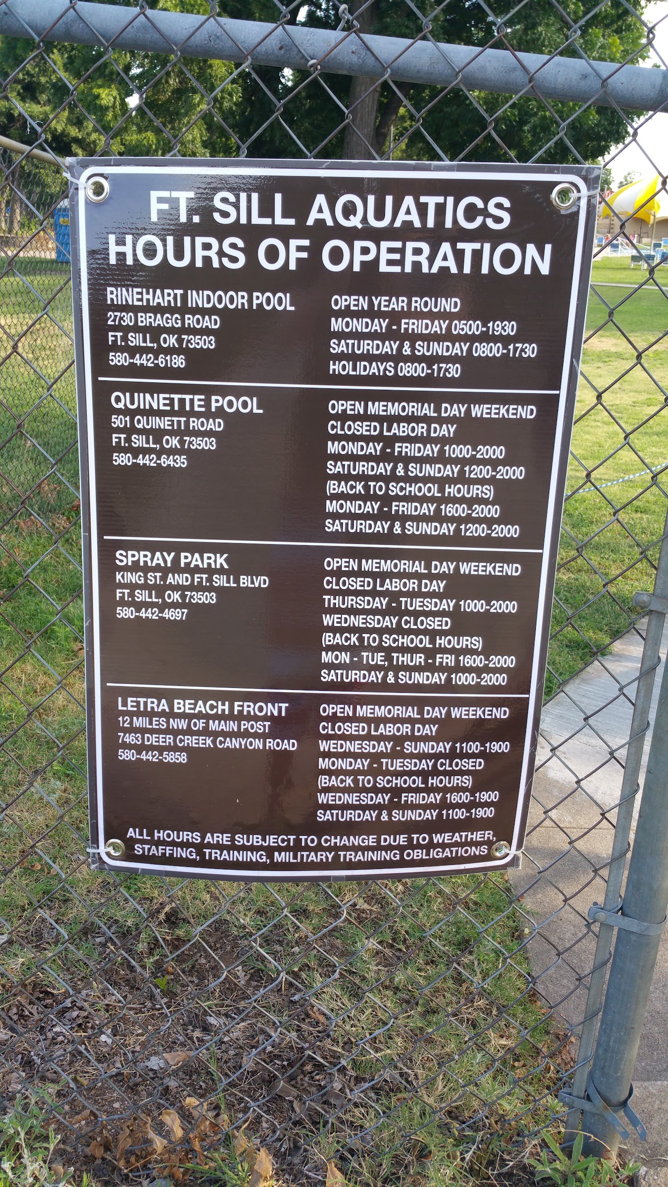 Quinette Pool, located at 500 Upton Rd in Lawton, OK, is a public outdoor swimming facility operated by the City of Lawton Parks and Recreation. It serves as a popular seasonal recreation spot during the summer months, offering open swim, swimming lessons, and various aquatic features for community enjoyment.