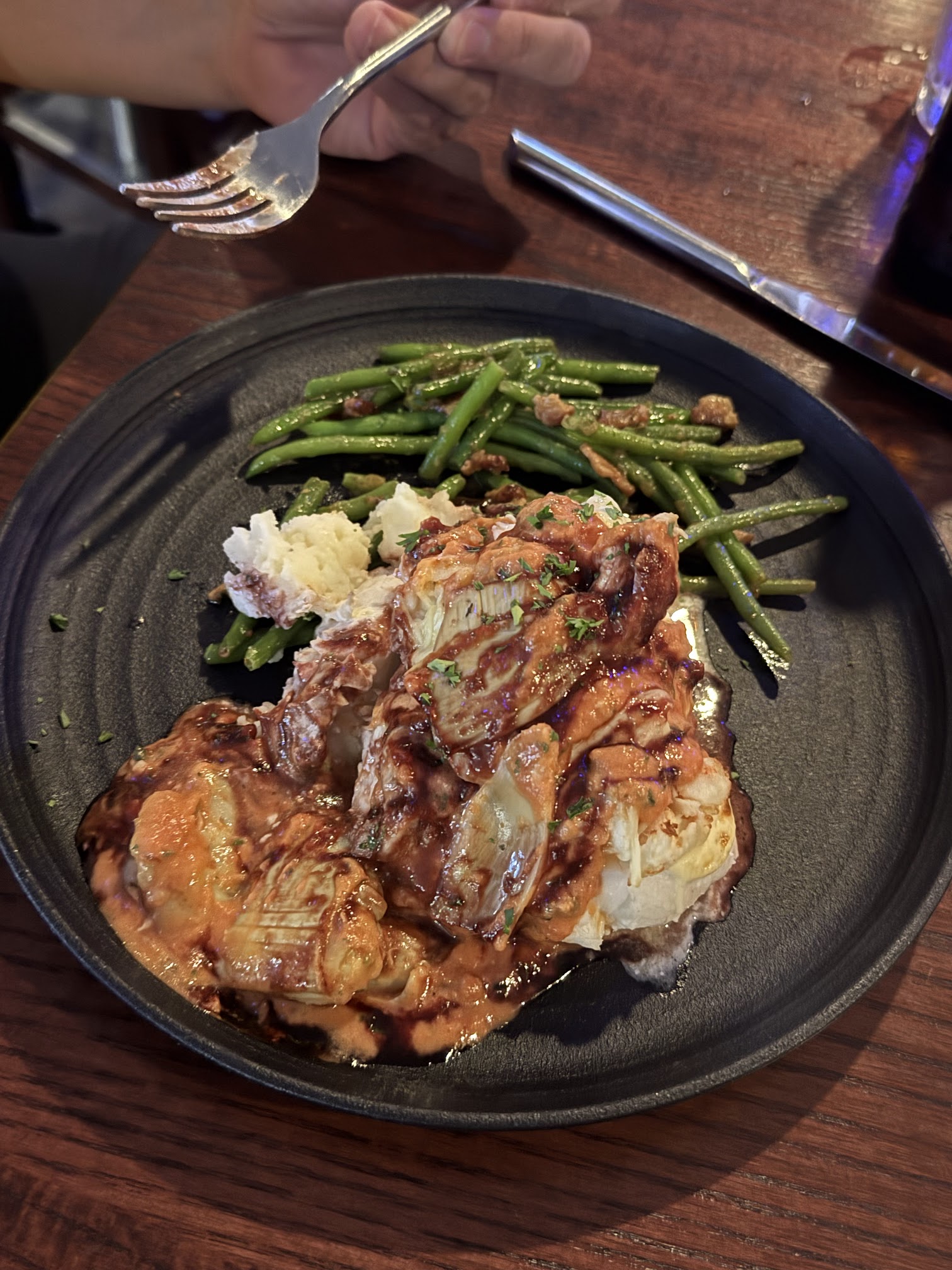 The pecan crusted salmon was so good. I dont usually eat mashed potatoes but the garlic ones were so good. The Cajun pasta was just above average. I little pricey for but almost worth it. One thing upset me, I found out the owners make the staff pay near full price even when they are working for their meal. No offense but they work in food industry probably tough to pay those prices.