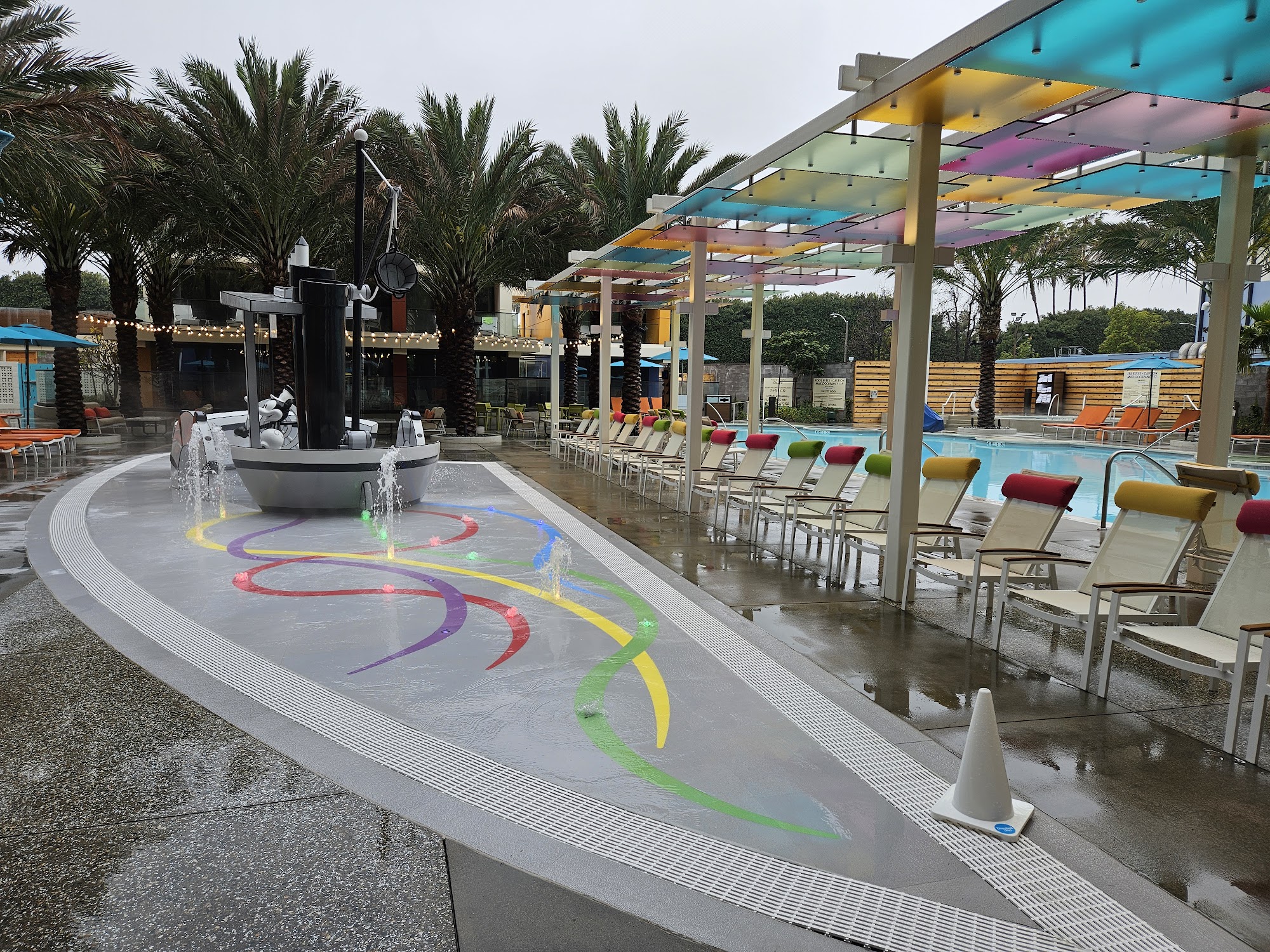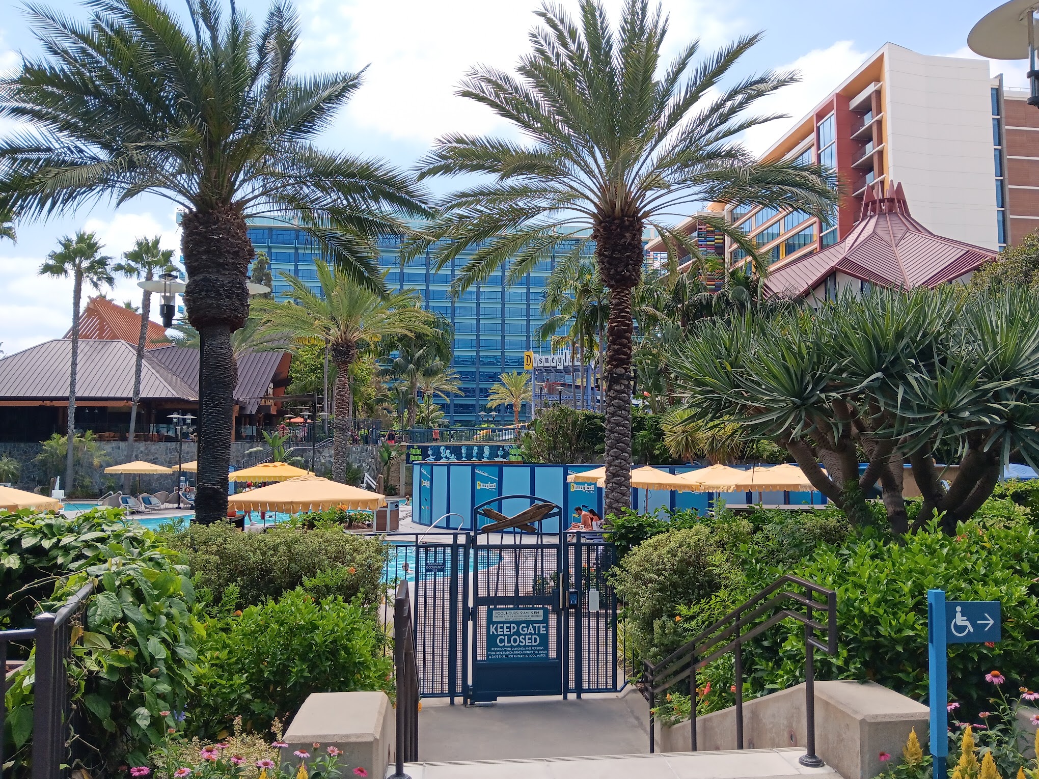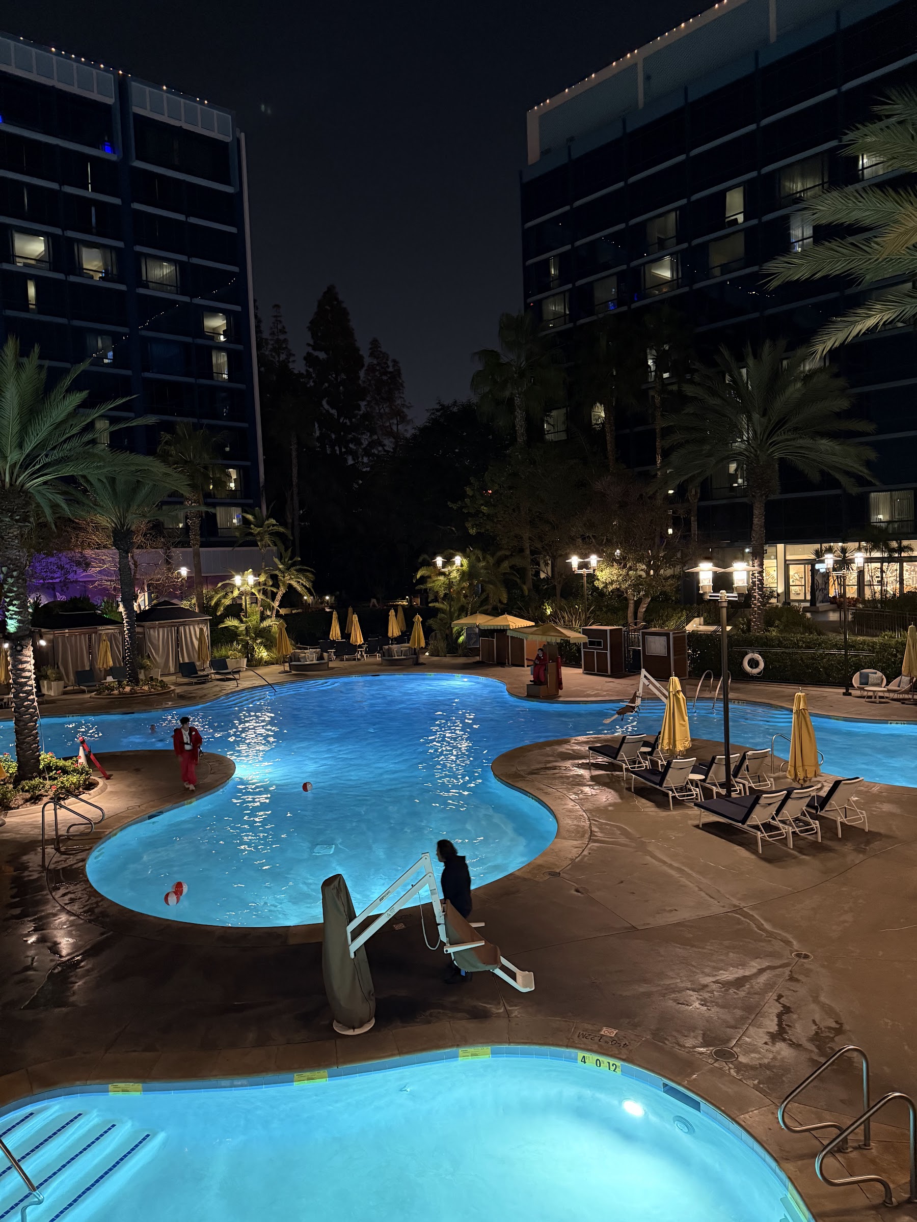 The Disneyland Hotel pools offer fun for all ages with themed water slides, a monorail-inspired splash zone, and relaxing cabanas. With heated pools and poolside dining, it’s the perfect spot to unwind after park adventures.