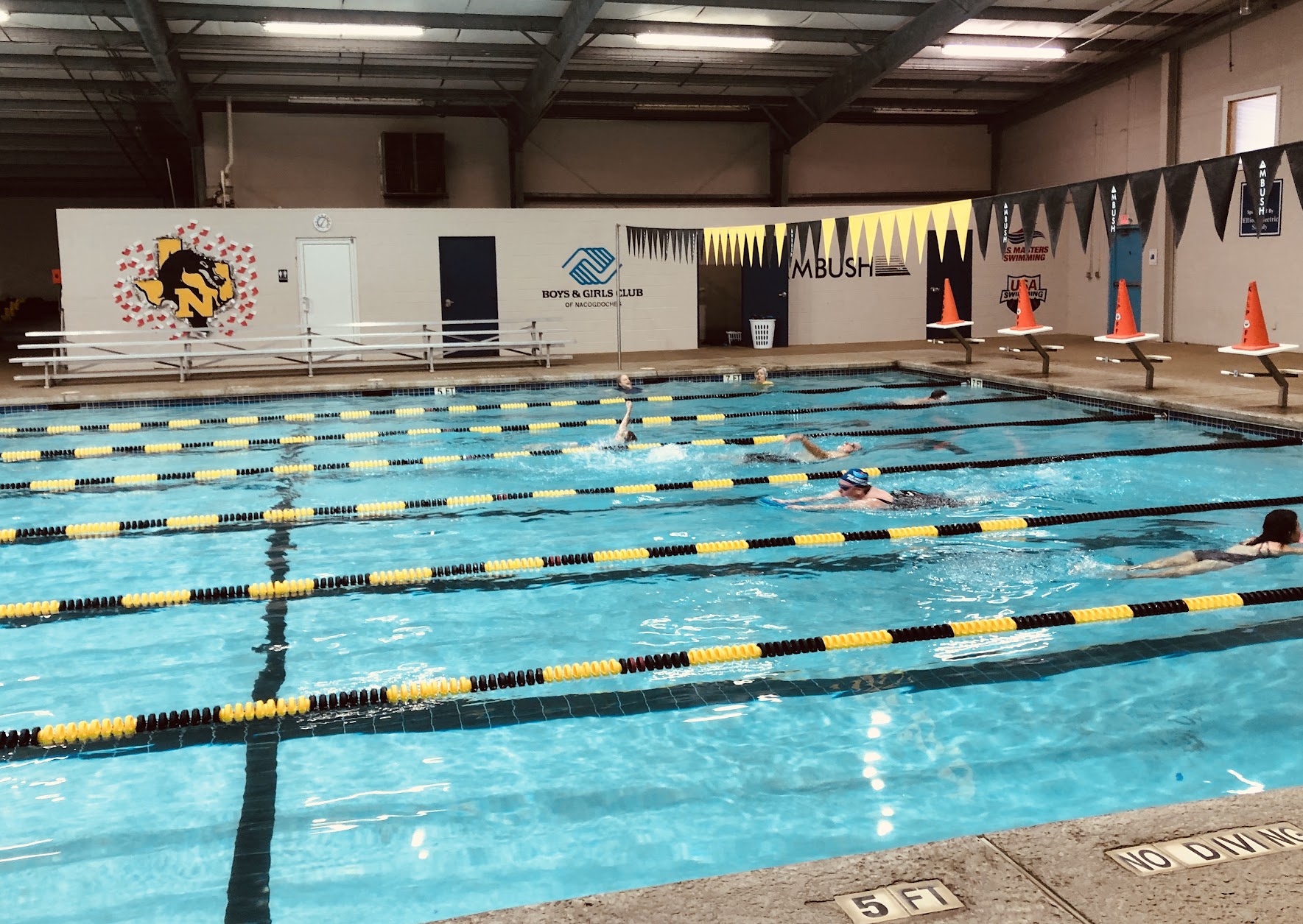Smaller pool with 6 lanes and 4' at the shallow end and only 7 at the deep end but good for a smaller town