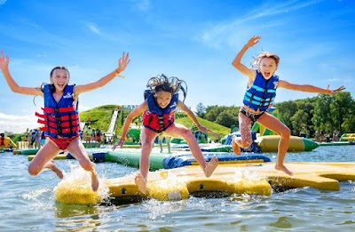 Natural waterpark featuring inflatable obstacle courses on a chlorine-free lake, plus beaches and a tree canopy walk.