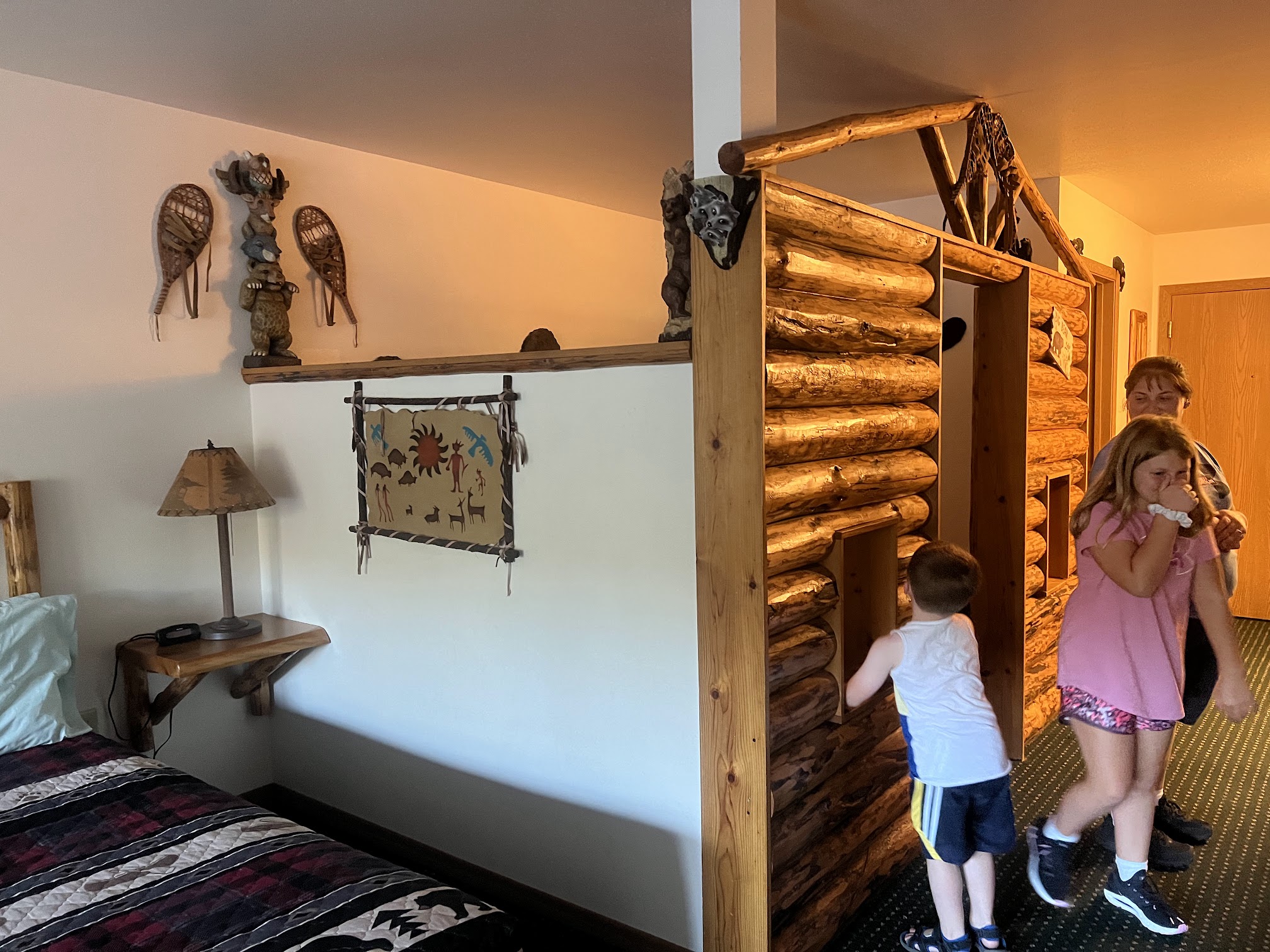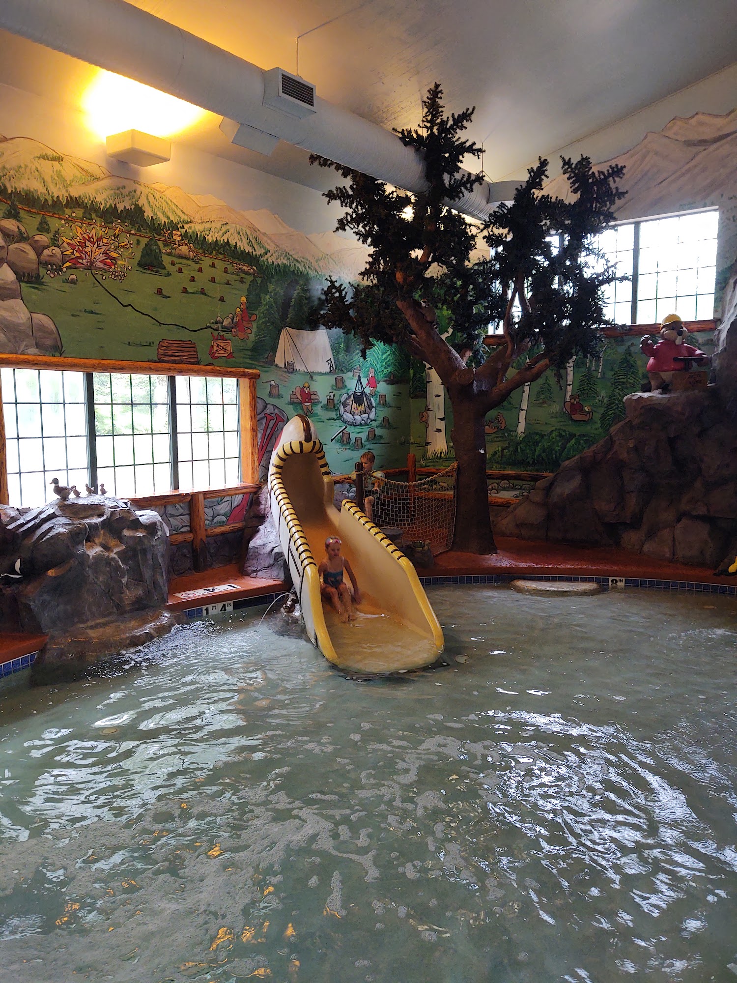 People need to stop complaining. This place is great. Stayed with 4 kids, ages 2-10. If you are looking for a smaller, low key, family oriented place, close to everything in the dells, look no further. We usually stay at Great Wolf but were looking for a change of pace from the big waterparks and a more rustic experience and to save a little money. The cabins and decor are a little dated, need new carpet, sure, but perfectly fine for people that don't need lavish and modern everything. Could they use a deep clean, probably, but it's a campground resort essentially so it wasn't a big deal for us. It smells like a campground accommodation. We are used to camping in a trailer and this is certainly a step up. We debated either going to a campground we frequent with trailer cabins or here and the price led us to this place as it was actually more affordable for a 3 day weekend getaway. It's a cross between a campground and a resort in my opinion. The outside themed decor is adorable and rustic, beautiful large trees and easily accessible from the main road and parking is ample. The grounds are beautiful and well kept. The cabin we had, Poplar, slept 8 and since our kids are varying in age we wanted separate rooms. For a smaller crew the rooms in the main hotel looked cute and the smaller cabins looked better situated on the grounds for privacy. The outside pools are great. Clean and perfect for a family with littles and easy to please older kids so everyone is visible at once but has something to do. The indoor pool area is cute for little ones, visible and safe and even my 10 yr old had fun the day it rained. The game area is lacking but literally not why we came, if you want gaming go to knuckleheads. If you want a big waterpark, pay for Kalahari. They have many packages that are available for other attractions. The beds were actually very comfortable so not sure what other people experienced but I'm guessing it's all been replaced. The playground is good for littles. The nightly campfire, super cute. Yes, you pay for a smores bucket, if you have an issue, bring your own. It's a good idea to bring extra towels as the room towels are not for the pool, as posted and they also don't do dishes or take out garbage daily. Not a problem if you aren't a lazy bum. Kids movies with free popcorn in the lobby at 7pm every night. Love that. Also, free coffee in the morning 8-11 in the lobby so people complaining about that, are incorrect. There was soap in the cabins too, and extra tp roll and kleenex, shampoo and bars of soap, again if you want more bring your own. Just really about people being entitled and thinking they are too good for washing their own dishes when the price is great for everything you are getting. The staff was also very kind and helpful. Overall, great weekend and we'll be back. Also, if you are a bachelor party of obnoxious and loud, spoiled men, go somewhere else. Like literally read the reviews before booking and expecting to be loud and party all night and then writing a crap review.
