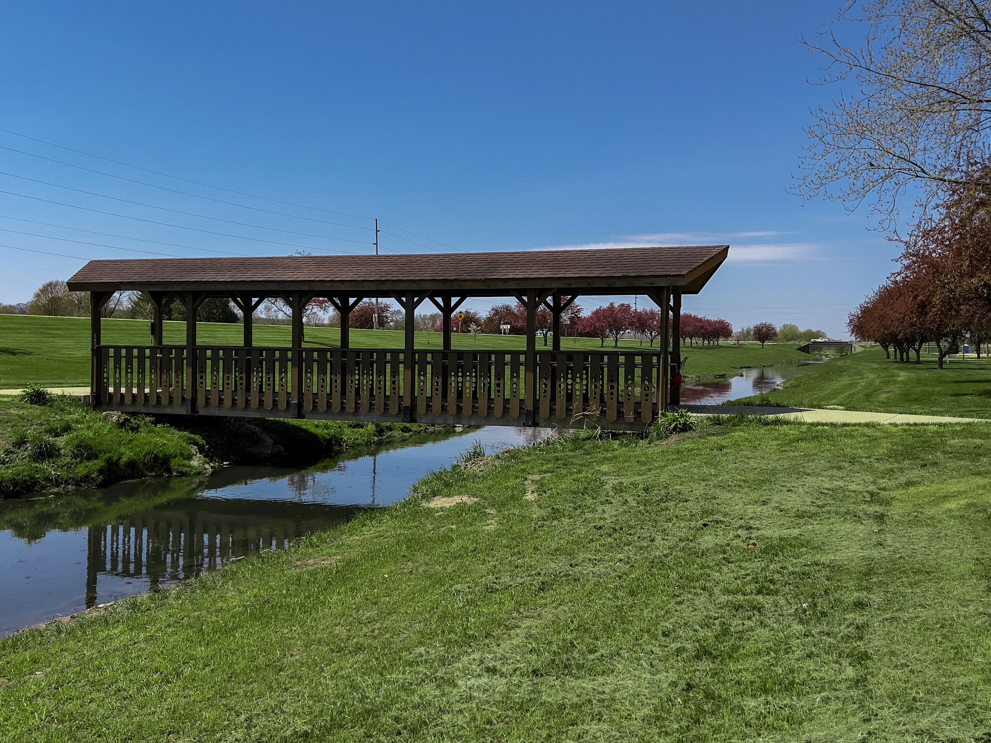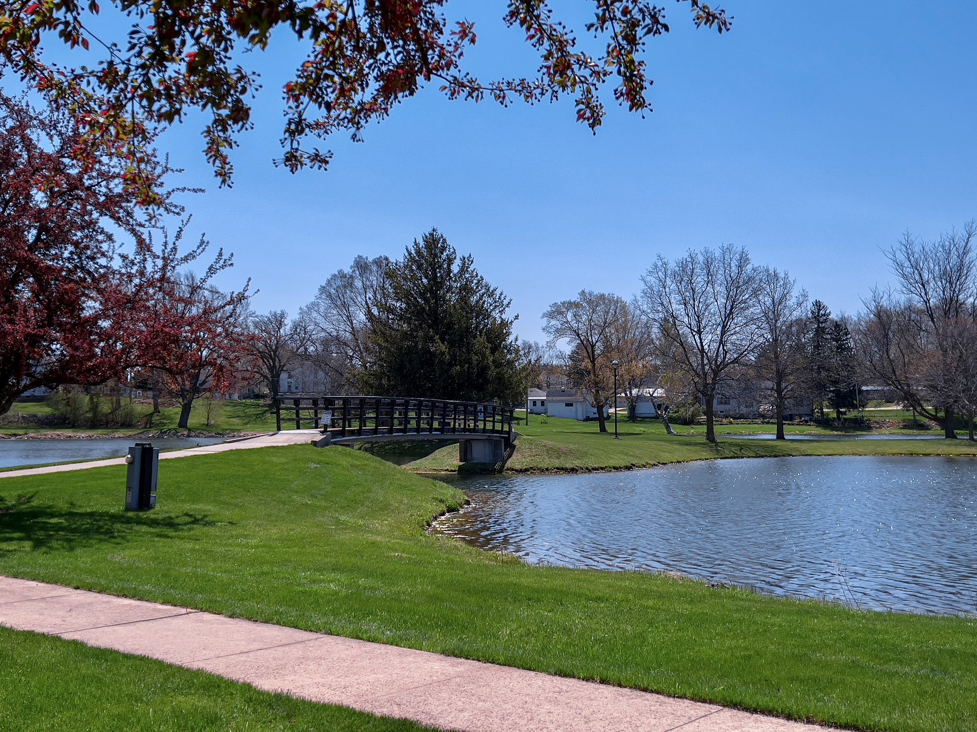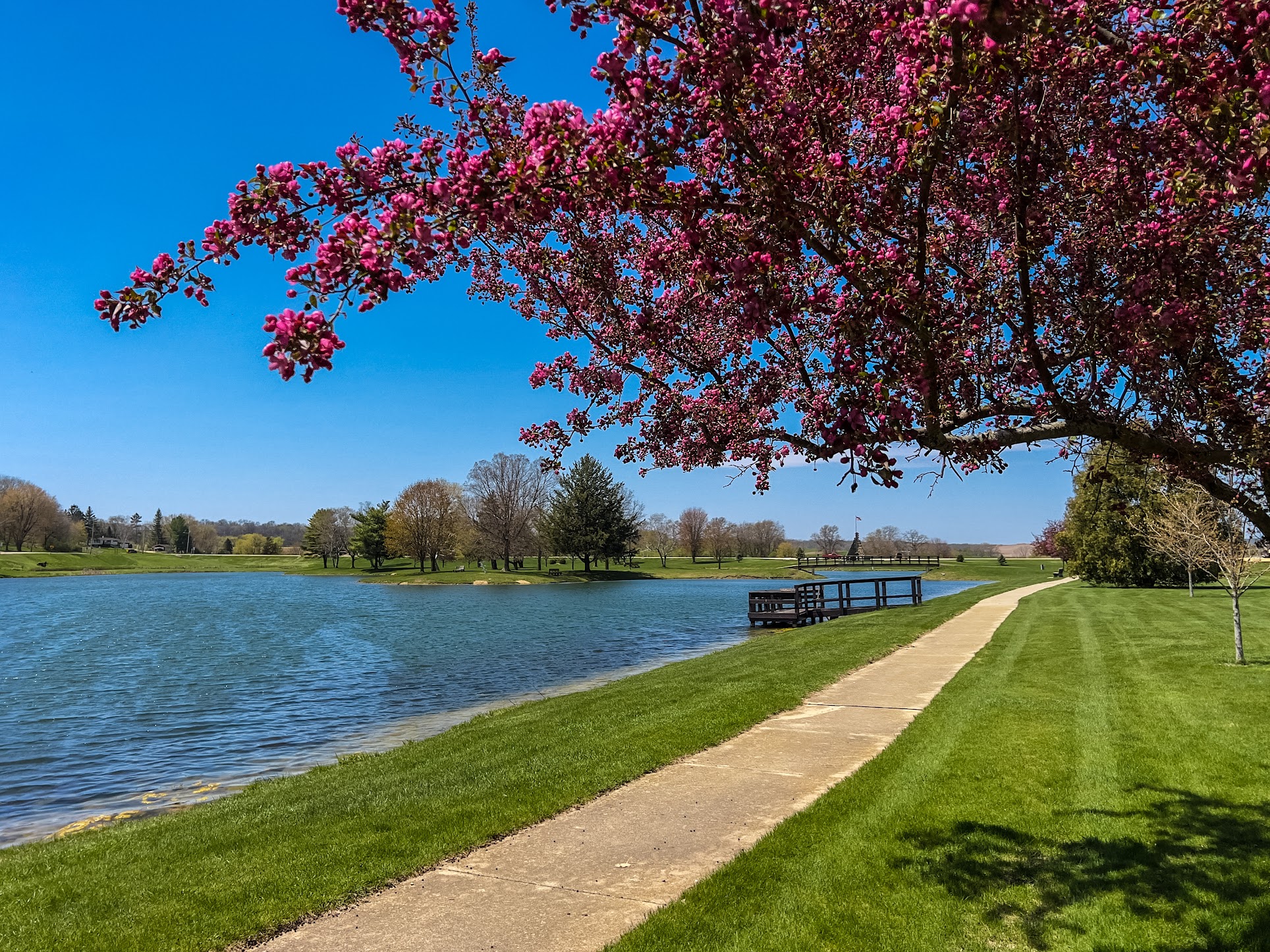 Monticello Community Park Pool, situated in the community park, on the historic Old Monticello Mill Pond's former location, provides a peaceful setting for family outings with a shelter house that comes equipped with all the necessary facilities. Memory Lane, composed of more than 100 flowering crab apple trees, welcomes visitors to the village and leads to the lake's island which can be reached through a curved footbridge. This picturesque location has been used for weddings and other events and includes an octagonal shelter house that offers additional amenities. The man-made lake, created by community volunteers, spans around 7 acres, a designated pier is available for those who prefer fishing from the shore. A footbridge leads to an island on the lake providing benches and ample shade. Sportsmen, or women, can enjoy volleyball and horseshoe courts, a baseball diamond, and a soccer field, and swimming pool. The park also has a large playground with various age-appropriate equipment for children to enjoy safely.