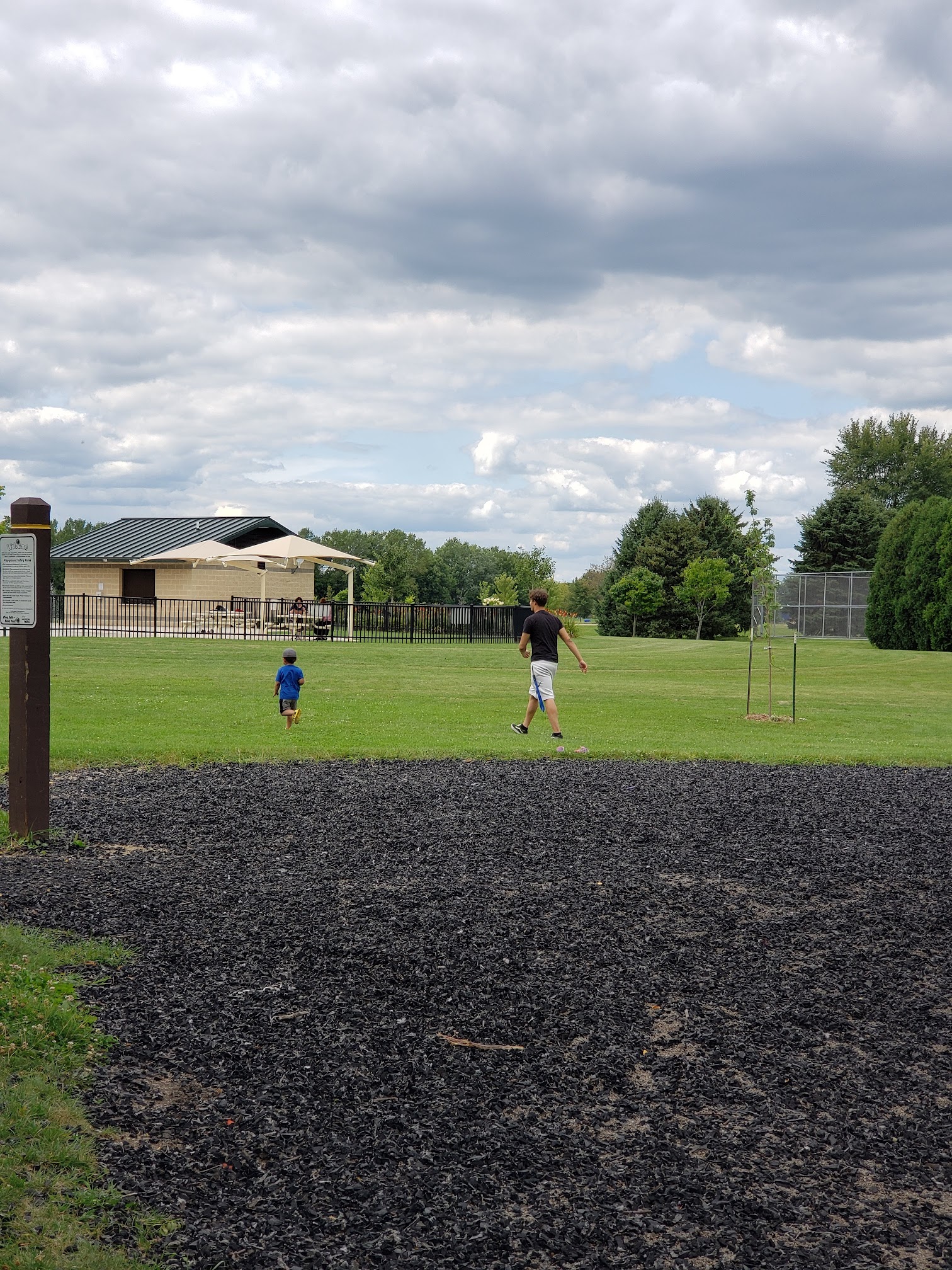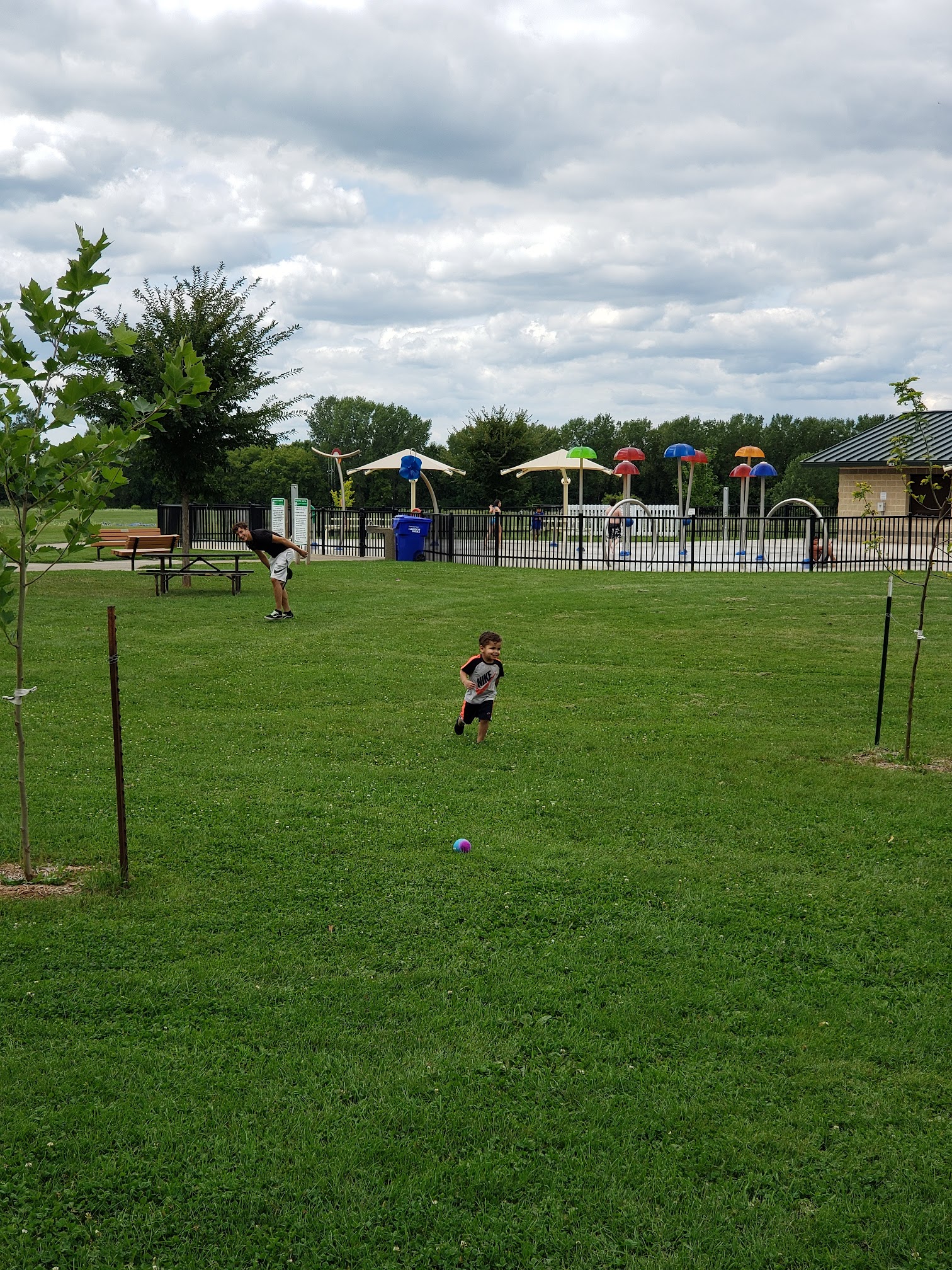 Waterpark and playground with a shelter, plus sports fields, for kids to run around in.
