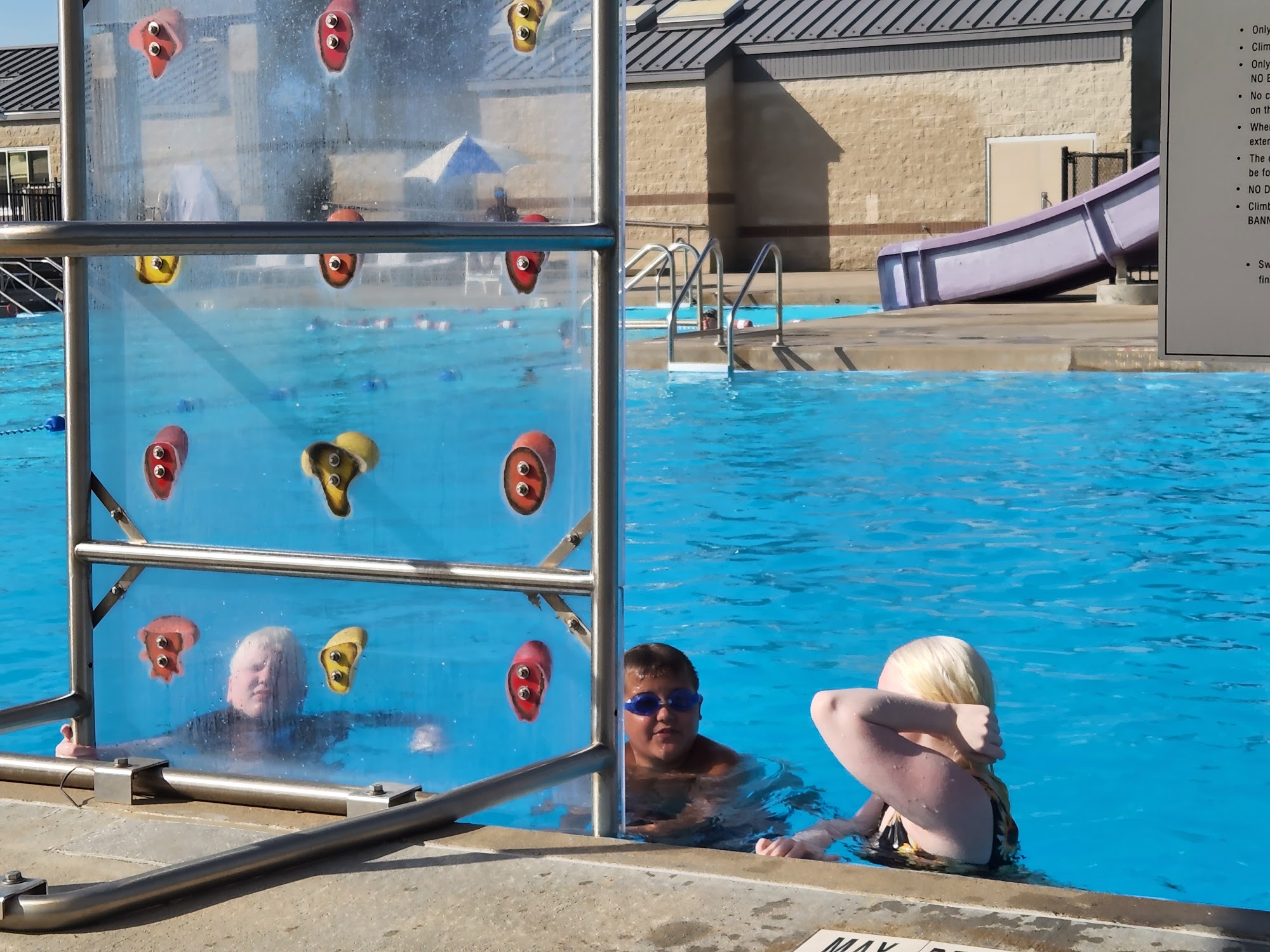Great public pool. One side for the young kiddos and the other for the older kids. Diving board, small lazy river, rock climbing wall and a slide are part of the fun.