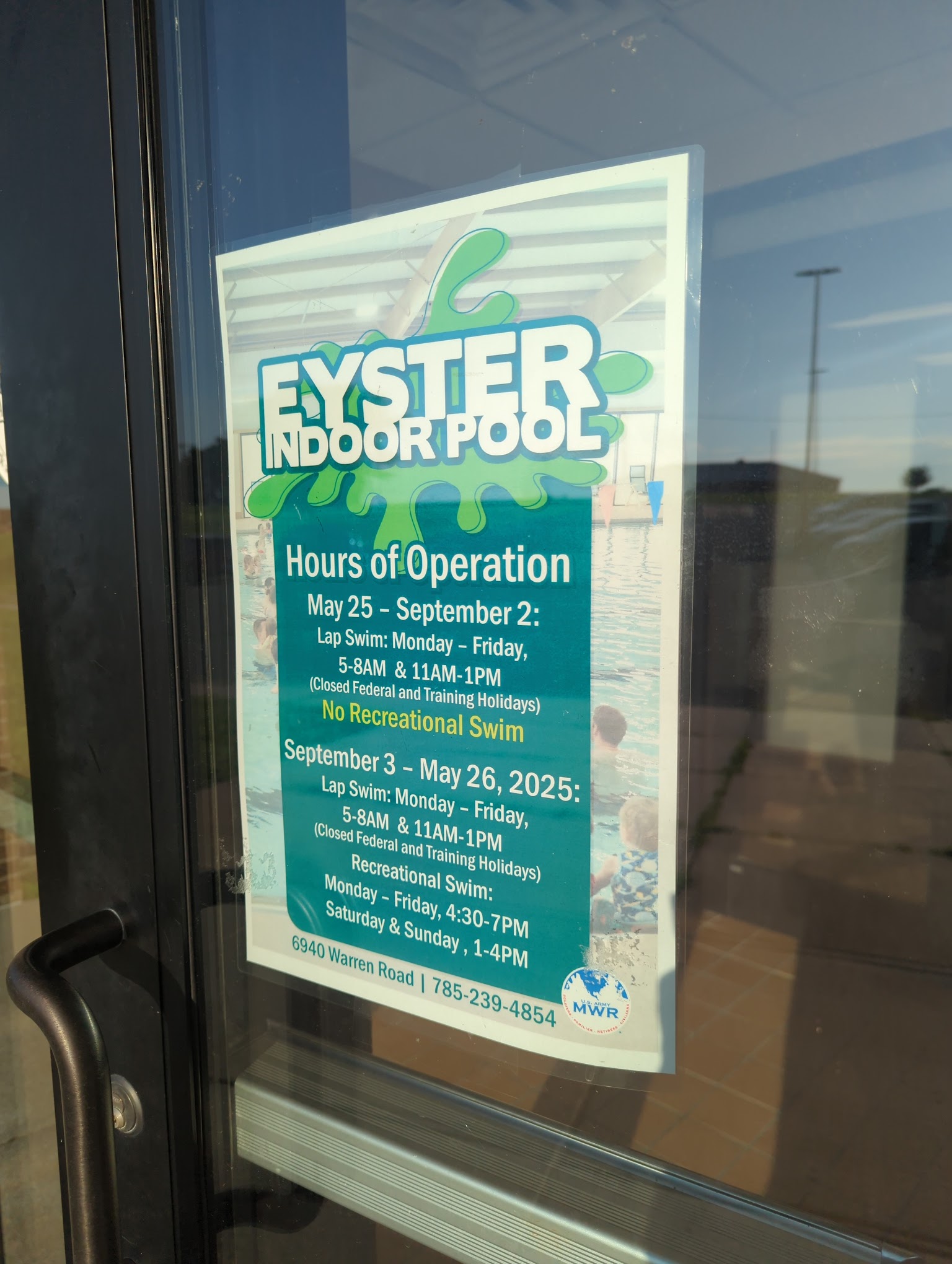 We love Eyster Pool! Through the winter we were there twice a week. The staff has always been friendly. With so much funding cut for MWR facilities, having this pool available for our family has been fantastic! They offer classes for all ages from babies to adults and have added two water slides in the last year. Our kids have gained so much confidence through the homeschool swim class. The instructors have all been very patient and encouraging with our kids.